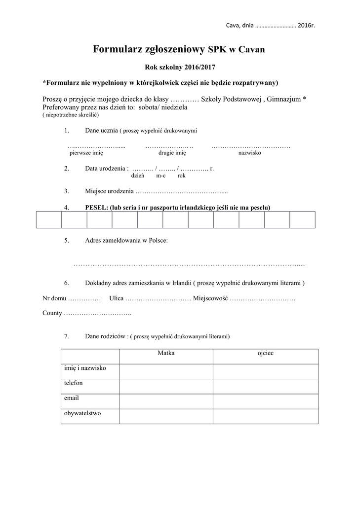 Cava, dnia ……………………… 2016r. Formularz zgłoszeniowy SPK w Cavan Rok szkolny 2016/2017 *Formularz nie wypełniony w którejkolwiek części nie będzie rozpatrywany) Proszę o przyjęcie mojego dziecka do klasy ………… Szkoły Podstawowej , Gimnazjum * Preferowany przez nas dzień to: sobota/ niedziela ( niepotrzebne skreślić) Dane ucznia ( proszę wypełnić drukowanymi 1. …..………………..... ……………….. .. pierwsze imię ……………………………… drugie imię nazwisko Data urodzenia : ………. / …….. / …………. r. 2. dzień m-c rok 3. Miejsce urodzenia ………………………………….... 4. PESEL: (lub seria i nr paszportu irlandzkiego jeśli nie ma peselu) 5. Adres zameldowania w Polsce: …………………………………………………………………………………..... 6. Dokładny adres zamieszkania w Irlandii ( proszę wypełnić drukowanymi literami ) Nr domu …………… Ulica ………………………… Miejscowość ………………………… County …………………………. 7. Dane rodziców : ( proszę wypełnić drukowanymi literami) Matka imię i nazwisko telefon email obywatelstwo ojciec Cava, dnia ……………………… 2016r. 8.Dane dotyczące spełniania obowiązku szkolnego w Irlandii . Nazwa szkoły irlandzkiej …………………………………………………………………………………………………………… Adres szkoły irlandzkiej …………………………………………………………………………………………………………… Ostatnio ukończona klasa ………………….......... w roku ………...... 9. Ostatnio ukończona klasa w Polsce/Polskiej Szkole za granicą …………… w roku …………* (przy zapisie ucznia dołączyć kopię ostatniego świadectwa) 10. Dziecko posiada opinię wydaną przez Poradnię Psychologiczno-Pedagogiczną lub inne Orzeczenie) tak / nie (niepotrzebne skreślić) jakie:………………………………………………………………………………… 11.Sposób powrotu do domu. Proszę zaznaczyć właściwe : a lub b. a) Informuję, iż moje dziecko będzie odbierane z zajęć lekcyjnych w SPK w Cavan przez rodziców lub (podać imię, nazwisko i numer kontaktowy) : 1. …………………………………………………… nr tel. ……………………… 2 ……………………………………………………. nr tel. ……………………… 3. ……………………………………………………. nr tel. ……………………… W przypadku, gdy moje dziecko będzie odbierane przez inną osobę, poinformuję o tym fakcie wychowawcę przed zajęciami ( osobiście) lub osoba odbierająca moją córkę/mojego syna przedstawi wychowawcy podpisane przeze mnie upoważnienie. b) Informuję, iż moje dziecko będzie wracało do domu samodzielnie (nie dotyczy uczniów klas I-III) 12. Oświadczam, że moje dziecko jest objęte 24 - godzinnym ubezpieczeniem zdrowotnym od następstw nieszczęśliwych wypadków. W przypadku braku zaświadczenia o w/w ubezpieczeniu opłacę składkę w wysokości 9 euro na początku roku szkolne celem ubezpieczenia dziecka przez SPK w Cavan 13. Uprzedzony o odpowiedzialności karnej z art. 233 KK oświadczam, że podane powyżej dane są zgodne ze stanem faktycznym. …………………………………………………………………………………………… data (podpis matki i ojca / opiekuna prawnego) Cava, dnia ……………………… 2016r. 14. Zgodnie z art. 23 Ustawy z dnia 29 sierpnia 1997r. o ochronie danych osobowych (Dz. U. z 2002r. Nr 101, poz. 926 z póż.zm.) wyrażam zgodę na przetwarzanie i przechowywanie danych osobowych zawartych w niniejszym formularzu w celu przyjęcia dziecka do SPK w Cavan. Mam świadomość przysługującego mi prawa wglądu do treści danych oraz ich poprawienia. Dane podaję dobrowolnie.. 15.Oświadczam, że zapoznałem się z Regulaminem i Statutem SPK i zobowiązuję się do ich przestrzegania oraz do bieżącego zapoznawania się ze zmianami w nich zachodzącymi. (dokumenty dostępne stronie internetowej szkoły www.polskaszkolacavan.org.pl 16. Oświadczam, iż w przypadku przyjęcia naszego dziecka będziemy współpracowali ze szkołą w procesie wychowawczym, zaopatrywali dziecko w podręczniki i przybory szkolne, współpracowali z wychowawcą klasy, interesowali się wynikami w nauce oraz przestrzegali ścisłego stosowania się przez nasze dziecko do regulaminu szkoły i obowiązujących przepisów. Na bieżąco będziemy zapoznawali się z informacjami zamieszczanymi na stronie internetowej szkoły (przynajmniej raz na tydzień) 17. Przyjąłem / łam do wiadomości informację o zakazie wjeżdżania i parkowania pojazdów pod budynkiem szkoły. Czytelne podpisy rodziców/ prawnych opiekunów data……………………………………… Podpis ojca/opiekuna ………………………………………………………… Podpis matki/opiekuna …………………………………………………………. ZGODA NA WYKORZYSTANIE WIZERUNKU DZIECKA …………………………… , data: …………………… Oświadczam, że wyrażam zgodę na umieszczanie zdjęć i filmów zawierających wizerunek mojego syna/córki ………………………………………………..…… zarejestrowany podczas realizacji : konkursów, turniejów sportowych i innych uroczystości szkolnych, w mediach: Internecie, prasie, telewizji, gazetkach szkolnych. Jednocześnie przyjmuję do wiadomości, że wizerunek mojego dziecka będzie wykorzystywany tylko i wyłącznie w celu promocji i potrzeb funkcjonowania SPK w Cavan. Oświadczenie moje ważne jest na cały cykl kształcenia mojego dziecka w SPK w Cavan ………………........................................... ................................................................... (im