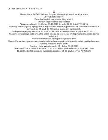 OSTRZEŻENIE Nr 76 - SILNY WIATR Nazwa biura: IMGW-PIB Biuro Prognoz Meteorologicznych we Wrocławiu OSTRZEŻENIE Nr 76 Zjawisko/Stopień zagrożenia: Silny wiatr/2 Obszar: województwo dolnośląskie Ważność: od godz. 16:00 dnia 05.12.2013 do godz. 10:00 dnia 07.12.2013 Przebieg: Przewiduje się wystąpienie silnego wiatru o średniej prędkości od 35 km/h do 50 km/h, w porywach od 75 km/h do 95 km/h, z kierunków zachodnich. Maksymalne porywy wiatru od 85 km/h do 95 km/h przewidywane są w piątek 06.12.2013. Wiatrowi towarzyszyć będą przelotne opady śniegu, co spowoduje występowanie miejscami zawiei śnieżnych. Prawdopodobieństwo wystąpienia zjawiska: 90% Uwagi: Z uwagi na dynamiczną sytuację meteorologiczną ostrzeżenie może zostać zauktualizowane. Dyżurny synoptyk: Edyta Socha Godzina i data wydania: godz. 18:16 dnia 04.12.2013 Wiadomość SMS: IMGW PIB OSTRZEGA: WIATR/2 woj.dolnoslaskie od 16:00/05.12 do 10:00/07.12.2013 kieruneki zachodnie, predkosc 35-50 km/h, porywy 75-95 km/h