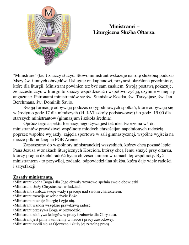 Ministranci – Liturgiczna Służba Ołtarza. "Ministrare" (łac.) znaczy służyć. Słowo ministrant wskazuje na rolę służebną podczas Mszy św. i innych obrzędów. Usługuje on kapłanowi, przynosi określone przedmioty, które dla liturgii. Ministrant powinien też być sam znakiem. Swoją postawą pokazuje, że uczestniczyć w liturgii to znaczy współdziałać i współtworzyć ją, czynnie w niej się angażując. Patronami ministrantów są: św. Stanisław Kostka, św. Tarsycjusz, św. Jan Berchmans, św. Dominik Savio. Swoją formację odbywają podczas cotygodniowych spotkań, które odbywają się w środyu o godz.17 dla młodszych (kl. I-VI szkoły podstawowej) i o godz. 19.00 dla starszych ministrantów (gimnazjum i szkoła średnia). Oprócz tego aspektu formacyjnego żywa jest też idea tworzenia wśród ministrantów prawdziwej wspólnoty młodych chrześcijan napełnionych radością poprzez wspólne wyjazdy, zajęcia sportowe w sali gimnastycznej, wspólne wyjścia na mecze piłki nożnej na PGE Arenie. Zapraszamy do wspólnoty ministranckiej wszystkich, którzy chcą poznać lepiej Pana Jezusa w znakach liturgicznych Kościoła, którzy chcą Jemu służyć przy ołtarzu, którzy pragną dzielić radość bycia chrześcijaninem w ramach tej wspólnoty. Być ministrantem - to przywilej, zadanie, odpowiedzialna służba, która daje wiele radości i satysfakcji. Zasady ministranta. •Ministrant kocha Boga i dla Jego chwały wzorowo spełnia swoje obowiązki. •Ministrant służy Chrystusowi w ludziach. •Ministrant zwalcza swoje wady i pracuje nad swoim charakterem. •Ministrant rozwija w sobie życie Boże. •Ministrant poznaje liturgię i żyje nią. •Ministrant wznosi wszędzie prawdziwą radość. •Ministrant przeżywa Boga w przyrodzie. •Ministrant zdobywa kolegów w pracy i zabawie dla Chrystusa. •Ministrant jest pilny i sumienny w nauce i pracy zawodowej. •Ministrant modli się za Ojczyznę i służy jej rzetelną pracą. Zbiórki ministrantów odbywają się w środy: o godz. 17.00 – ministranci młodsi. o godz. 19.00 – ministranci starsi Zapraszamy. Modlitwa ministranta przed służeniem. Boże, któremu służyć znaczy królować, spraw, aby całe moje życie było wierną służbą Twojej świętej sprawie. Przez Chrystusa Pana naszego. Amen. Św. Stanisławie Kostko módl się za nami. Amen Modlitwa ministranta po służeniu. Boże, który obdarzyłeś mnie udziałem w Twojej świętej służbie, spraw, abym przez godne posługiwanie Przenajświętszej Eucharystii, doszedł do wiecznego królowania z Tobą. Przez Chrystusa Pana naszego. Amen. Św. Stanisławie Kostko módl się za nami. Amen. Hymn ministrancki. Króluj nam Chryste Króluj nam Chryste, zawsze i wszędzie to nasze rycerskie hasło. Ono nas zawsze prowadzić będzie i świecić jak słońce jasno. Naprzód przebojem młodzi rycerze Do walki z grzechem swej duszy Wodzem nam Jezus w Hostii ukryty Z nim w bój nasz zastęp wyruszy. Pójdziemy naprzód, naprzód radośnie Podnosząc w górę swe czoła. Przed nami życie rozkwita w wiośnie Odważnie, bo Jezus woła. SŁUŻBA LITURGICZNA – PODZIAŁ NA GRUPY Grupa I 1. 2. 3. 4. Grupa IV Białecki Sebastian Chojka Arkadiusz Domagała Jakub Krawczuk Szymon Grupa II 1. 2. 3. 4. 1. Machniewicz Konrad 2. Jaruszek Marcin 3. Sulecki Jan 4. Skuratowicz Kasper 1. Siok Oskar 2. Sierputowski Jakub 3. Świtalski Daniel Grupa V Klenczon Jakub Kopernik Krzysztof Czopek Bartłomiej Sadowski Kacper Grupa III 1. 2. 3. 4. Grupa VII Chełmiński Kacper Lisowski Dawid Piątek Bartłomiej Orłowski Filip Grupa VIII 1. Marcinko Marek 2. Królik Robert 3. Skakowski Stanisław 4. Gołąbek Tomasz 1. Trznadel Adam 2. Tyszko Marcin 3. Kamiński Dawid 4. Woźniak Mateusz Grupa VI Grupa IX 1. Preuss Sebastian 2. Kutka Adrian 3. Gąsior Mateusz 4. Gontarczyk Mateusz 5. Pappe Patryk 1. Reda Wojciech 2. Wołoszyn Patryk 3. Grygiel Antoni SŁUŻENIE – MIESIĘCZNY PODZIAŁ GRUP 9 marzec– 6 kwiecień 2014 r. Niedziela 7.00 I 8.00 II 9.30 III, IV 11.00 V, VI 11.00 kościół dolny VII 12.30 VIII 18.00 IX Poniedziałek Wtorek Środa Czwartek Piątek Sobota 6.30 I IV VII III VI IX 7.00 II V VIII II V VIII 18.00 III VI IX I IV VII Wielki Post ma być w zamierzeniu czasem na pokutę, odwrócenie się od grzechu i ponowne nawrócenie się. Trzy najważniejsze zalecenia to post, modlitwa i jałmużna. Kościół przypomina nam, że Jezus traktował te zalecenia jako trzy najlepsze drogi do zbliżenia się do Boga. Liturgia w okresie Postu staje się wyciszona, kolor dominujący w czasie mszy jest fiolet. Z obrządku znika śpiew „Chwała na wysokości” i „Alleluja”, którą zastępuje „Chwała Tobie, Słowo Boże”. Chrześcijanie w trakcie Wielkiego Postu nie powinni brać udziału w zabawach. Przyjęty jest także zwyczaj organizowania przez parafie rekolekcji, które mają pomóc wiernym w godnym przeżyciu tego okresu. W naszej parafii rekolekcje odbędą się w dniach 6-9 kwietnia 2014 r. Droga Krzyżowa: w każdy piątek Wielkiego Postu - dzieci: godz. 17.00 - młodzież: godz. 19.30 - dorośli: godz. 18.00 Gorzkie Żale: niedziela – godz. 17.00 Do patronów ministrantów należą: Św. Tarsycjusz -męczennik rzymski, III wiek. Młody, kilkunastoletni akolita Kościoła rzymskiego, "męczennik Eucharystii". Podczas prześladowania chrześcijan za cesarza Decjusza nosił Komunię Świętą uwięzionym braciom w wierze. Schwytany przez prześladowców, został ukamienowany. Ciało męczennika pochowano z czcią na cmentarzu Kaliksta około 250 roku. Św. Stanisław Kostka - XVI wiek (Polska), urodzony w Rostkowie na Mazowszu, naukę kontynuował w Wiedniu. Tu podczas ciężkiej choroby, kiedy właściciel domu, w którym mieszkał, nie chciał wpuścić kapłana katolickiego, miał widzenie: najpierw św. Barbara, patronka dobrej śmierci, do której się zwrócił, w towarzystwie dwóch aniołów przyniosła mu Wiatyk, potem Maryja złoży