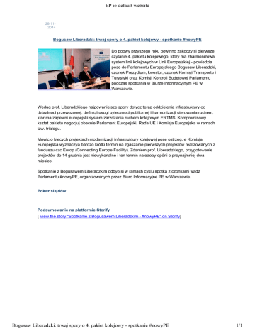 EP io default website 28-112014 Bogusaw Liberadzki: trwaj spory o 4. pakiet kolejowy - spotkanie #nowyPE Do poowy przyszego roku powinno zakoczy si pierwsze czytanie 4. pakietu kolejowego, który ma zharmonizowa system linii kolejowych w Unii Europejskiej - powiedzia pose do Parlamentu Europejskiego Bogusaw Liberadzki, czonek Prezydium, kwestor, czonek Komisji Transportu i Turystyki oraz Komisji Kontroli Budetowej Parlamentu podczas spotkania w Biurze Informacyjnym PE w Warszawie. Wedug prof. Liberadzkiego najpowaniejsze spory dotycz teraz oddzielenia infrastruktury od dziaalnoci przewozowej, definicji usugi uytecznoci publicznej i harmonizacji sterowania ruchem, któr ma zapewni europejski system zarzdzania ruchem kolejowym ERTMS. Kompromisowy ksztat pakietu negocjuj obecnie Parlament Europejski, Rada UE i Komisja Europejska w ramach tzw. trialogu. Mówic o biecych projektach modernizacji infrastruktury kolejowej pose ostrzeg, e Komisja Europejska wyznaczya bardzo krótki termin na zgaszanie pierwszych projektów realizowanych z funduszu czc Europ (Connecting Europe Facility). Zdaniem prof. Liberadzkiego, przygotowanie projektów do 14 grudnia jest niewykonalne i ten termin naleaoby opóni o przynajmniej dwa miesice. Spotkanie z Bogusawem Liberadzkim odbyo si w ramach cyklu spotka z czonkami wadz Parlamentu #nowyPE, organizowanych przez Biuro Informacyjne PE w Warszawie. Pokaz slajdów Podsumowanie na platformie Storify [ View the story "Spotkanie z Bogusawem Liberadzkim - #nowyPE" on Storify] Bogusaw Liberadzki: trwaj spory o 4. pakiet kolejowy - spotkanie #nowyPE 1/1