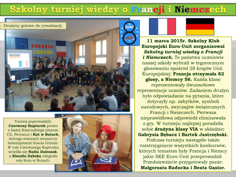 Drużyny gotowe do rywalizacji. Turniej poprowadzili: Czerwony Kapturek prosto z baśni francuskiego pisarza Ch. Perraout i Kot w Butach, którego stworzyli niemieccy baśniopisarze bracia Grimm. W rolę Czerwonego Kapturka wcieliła się Nadia Daleszak, a Klaudia Dębska odegrała rolę Kota w Butach. 11 marca 2015r. Szkolny Klub Europejski Euro-Unit zorganizował Szkolny turniej wiedzy o Francji i Niemczech. Te państwa uczniowie naszej szkoły wybrali w tegorocznym głosowaniu spośród 28 krajów Unii Europejskiej: Francja otrzymała 82 głosy, a Niemcy 56. Każdą klasę reprezentowały dwuosobowe reprezentacje uczniów. Zadaniem drużyn było odpowiadanie na pytania, które dotyczyły np. zabytków, symboli narodowych, zwyczajów świątecznych Francji i Niemczech. Pierwsza nieprawidłowa odpowiedź eliminowała z gry. W turnieju najlepiej poradziła sobie drużyna klasy VIA w składzie: Gabrysia Bębacz i Bartek Jastrzębski. Podczas turnieju nastąpiło także rozstrzygnięcie wszystkich konkursów, których tematem były Francja i Niemcy jakie SKE Euro-Unit przeprowadził. Przedsięwzięcie przygotowały panie: Małgorzata Raducka i Beata Gąsior. Początek turnieju. Wystąpienie p. dyrektor Urszuli Dulnik. Pani Małgorzata Raducka i Beata Gąsior. Chór szkolny wykonał wiązankę piosenek w j. francuskim i niemieckim. Na koniec wszyscy przenieśli się do Paryża na Pola Elizejskie za sprawą piosenki Champs Elysees. Występ chóru przygotowały p. Dorota Pomorska i Elżbieta Bilska. W konkursie wzięli udział uczniowie klas V i VI. Klasy V miały za zadanie wykonać prezentację o Francji, a VI o Niemczech. Autorami najlepszych prezentacji okazali się: Aleksander Mijas z klasy VB i Dawid Pierzak z klasy VIB. Konkurs przeprowadził p. Krzysztof Wytrwał. Pani dyrektor Urszula Dulnik wręcza nagrodę i dyplom Dawidowi Pierzakowi. Slajdy ze zwycięskich prezentacji. Był to konkurs plastyczny przeznaczony dla uczniów klas I-III. Uczniowie mieli za zadanie wykonać pracę plastyczną przedstawiającą ulubionego bohatera baśni braci Grimm lub baśni Ch. Perraout. Najlepsze prace wykonali: Basia Jędrocha i Marcelina Hoffmann z klasy IIIb oraz Kamil Foks z klasy Ic. W konkursie przyznano też wyróżnienia, które zdobyli: Kacper Górczak i Zosia Bednarska z klasy Ic, Mateusz Maciąg z klasy IIIb, Amelia Adamczak z klasy IIIa i Michasia Perlak z klasy Ia. Nagrodzeni uczniowie z klasy Ic. Pani dyrektor wręcza nagrody w konkursie plastycznym. Baśniowi eksperci to konkurs wiedzy ze znajomości utworów baśni braci Grimm i Ch. Perraout. W konkursie wzięli udział uczniowie klas II-III, którzy napisali test ze znajomości baśni wyżej wymienionych autorów. Baśniowymi ekspertami okazali się następujący uczniowie: Mikołaj Lipiński – IIa, Kamila Gładysińska – IIb, Alicja Grysakowska – IIIa i Julia Surgiel – IIIb. Wręczanie nagród w konkursie wiedzy Baśniowi eksperci. Aby przybliżyć uczniom klas młodszych Francję i Niemcy Szkolny Klub Europejski zorganizował lekcje europejskie o tych dwóch krajach. Lekcje poprowadzili uczniowie klasy IVb: Zuzanna Siekańska i Maciek Majcher. Zuzia i Maciek prowadzą lekcje o Francji i Niemczech w klasie IIIb.