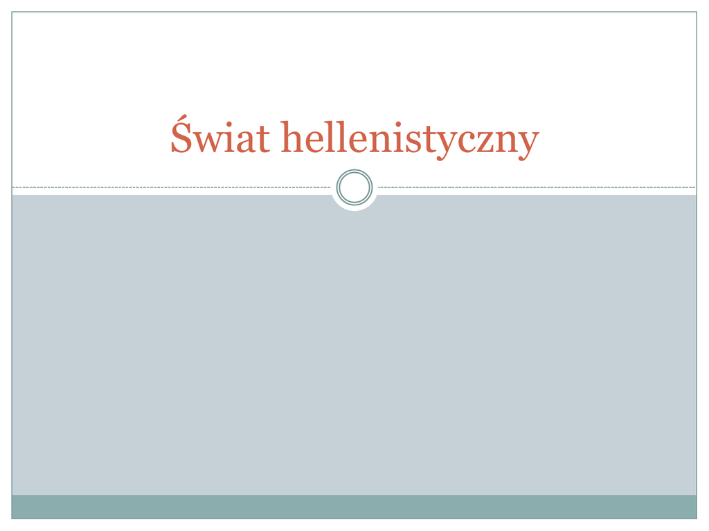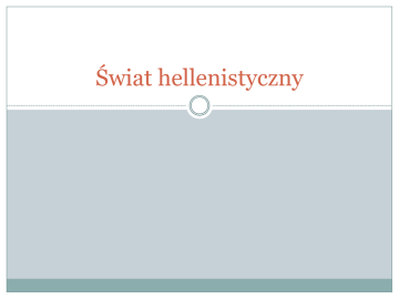 Świat hellenistyczny 1. Rozpad imperium Aleksandra Syn Aleksandra – Aleksander IV jest małoletni, przyrodni brat Filip III – niezdolny do sprawowania władzy Po Aleksandrze o spadek po Aleksandrze wojnę toczyli diadochowie – wodzowie Aleksandra ostatecznie ok. 281 p.n.e. nastąpił podział: 1. Państwo Ptolemeuszy (Lagidów) – Egipt, Cyrenejka, Palestyna 2. Państwo Seleucydów – północna Syria, Azja Mn., Mezopotamia, Iran, dawne tereny Achemenidów po płn. Indie 3. Państwo Antygonidów – Macedonia i Grecja 2. Epoka hellenistyczna Epoka w dziejach od śmierci Aleksandra Wielkiego (323 p.n.e.) do podboju przez Rzym ostatniego państwa hellenistycznego – Egiptu (31 p.n.e.) 3. Ośrodki kultury hellenistycznej Aleksandria – główna stolica kultury hellenistycznej Muzeum (skupiało literatów, uczonych , którzy mają sposobność do prowadzenia badań) Biblioteka Aleksandryjska (700 tysięcy zwojów papirusowych) Bruchejon (biblioteka na 50 tyś. zwojów) 4. Literatura okresu hellenistycznego Nowa dyscyplina naukowa – filologia („miłość słowa”); badanie dzieł i dociekanie ich oryginalnej treści Kallimach – twórca katalogu Biblioteki Aleksandryjskiej; poeta, erudyta Teokryt – twórca sielanek, ukazujących piękno natury, życie pasterzy Polibiusz – historiografia, „Dzieje” 5. Filozofia Stoicyzm (twórca Zenon z Kition) – wszyscy są równi, każdy ma obowiązki wobec rodziny i ojczyzny; by osiągnąć szczęście należy wypełniać swoje obowiązki; ludzie nie powinni poddawać się emocjom, namiętnościom; równowaga = „stoicki spokój” Cytacik z Zenona „Natura dała nam jeden język, a dwoje uszu po to, ażebyśmy słuchali dwa razy więcej, niż mówimy” Epikureizm (Epikur z Aten) – im mniej zmartwień i potrzeb, tym więcej szczęścia Unikać pogoni za przyjemnościami Unikać udziału w życiu publicznym Cytacik z Epikura „Śmierć wcale nas nie dotyczy. Bo gdy my istniejemy, śmierć jest nieobecna, a gdy tylko śmierć się pojawi, wtedy nas już nie ma.” Cynicy (Diogenes z Synopy) – jedyne dobro to cnota; pogarda dla wartości materialnych Mieszkaniec beczki Cytacik z beczki „Lepsza jest uboga mądrość, niż głupie bogactwo” 6. Sztuki plastyczne Różnorodność wynikająca z wielu tradycji do których sięgała Rzeźba dynamiczna – np. Grupa Laokona, Wenus z Milo, Ołtarz Pergamoński 7. Religia i kult bogów Synkretyzm religijny (hinduska Siwa utożsamiany z Zeusem) Kult władców (sakralizacja władzy, dodawanie jej prestiżu, element monarchii absolutnej) 8. Dziedzictwo epoki hellenistycznej Euklides – Elementy; podręcznik do geometrii Archimedes z Syrakuz – przybliżona wartość pi, podstawy statyki, hydrostatyki, prawo wyporu, zasadę dźwigni, prawo równi pochyłej Eratostenes z Cyreny – obliczenie obwodu kuli ziemskiej Hipparchos z Nikai – twórca siatki współrzędnych, oraz sposobu obliczania długości geograficznej Arystrach z Samos – ustalił, że Słońce jest w centrum wszechświata
