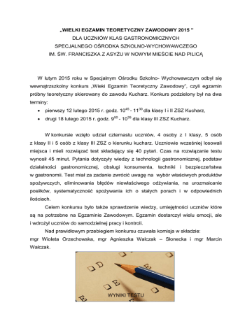 „WIELKI EGZAMIN TEORETYCZNY ZAWODOWY 2015 ” DLA UCZNIÓW KLAS GASTRONOMICZNYCH SPECJALNEGO OŚRODKA SZKOLNO-WYCHOWAWCZEGO IM. ŚW. FRANCISZKA Z ASYŻU W NOWYM MIEŚCIE NAD PILICĄ W lutym 2015 roku w Specjalnym Ośrodku Szkolno- Wychowawczym odbył się wewnątrzszkolny konkurs „Wieki Egzamin Teoretyczny Zawodowy”, czyli egzamin próbny teoretyczny skierowany do zawodu Kucharz. Konkurs podzielony był na dwa terminy: pierwszy 12 lutego 2015 r. godz. 1045 - 1130 dla klasy I i II ZSZ Kucharz, drugi 18 lutego 2015 r. godz. 950 - 1035 dla klasy III ZSZ Kucharz. W konkursie wzięło udział czternastu uczniów, 4 osoby z I klasy, 5 osób z klasy II i 5 osób z klasy III ZSZ o kierunku kucharz. Uczniowie wcześniej losowali miejsca i mieli rozwiązać test składający się 40 pytań. Czas na rozwiązanie testu wynosił 45 minut. Pytania dotyczyły wiedzy z technologii gastronomicznej, podstaw działalności gastronomicznej, obsługi konsumenta, techniki i bezpieczeństwa w gastronomii. Test miał za zadanie zwrócić uwagę na wybór właściwych produktów spożywczych, eliminowania błędów niewłaściwego odżywiania, na urozmaicanie posiłków, systematyczność spożywania ich o stałych porach i w odpowiednich ilościach. Celem konkursu było także sprawdzenie wiedzy, umiejętności uczniów które są na potrzebne na Egzaminie Zawodowym. Egzamin dostarczył wielu emocji, ale i wdrożył uczniów do samodzielnej pracy i kontroli. Nad prawidłowym przebiegiem konkursu czuwała komisja w składzie: mgr Wioleta Orzechowska, mgr Agnieszka Walczak – Słonecka i mgr Marcin Walczak. WYNIKI TESTU 1. Dominika Stempniak – 24 p. 2. Paweł Kołodziejczyk – 22 p. 3. Ilona Stępniak – 19 p. Damian Budek – 19 p. 4. Damian Pasiński – 18 p. 5. Dawid Puchalski – 17 p. 6. Lucyna Czapnik – 16 p. Aleksandra Kryćka – 16 p. 7. Bartłomiej Starnawski – 14 p. 8. Wioleta Bors – 13 p. 9. Malwina Binkiewicz – 12 p. 10. Sylwia Lesiak – 11 p. Katarzyna Kłos – 11 p. 11. Jakub Sobczak – 8 p. Opracował: Marcin Walczak