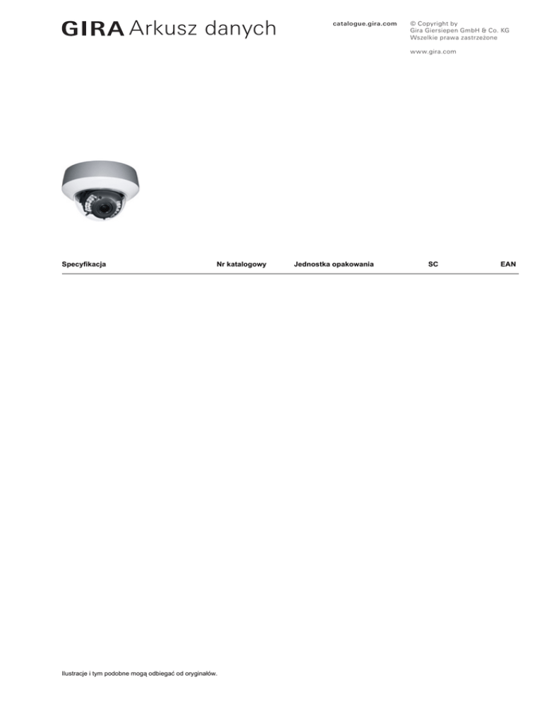 Arkusz danychń catalogue.gira.com © Copyright by Gira Giersiepen GmbH & Co. KG Wszelkie prawa zastrzeżone www.gira.com Specyfikacja Nr katalogowy Ilustracje i tym podobne mogą odbiegać od oryginałów. Jednostka opakowania SC EAN