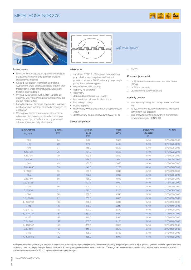 FLAME METAL HOSE INOX 376 AS Ex RETARD 1 EL +15% 3 wąż wyciągowy 2 Zastosowania Właściwości • Urzadzenia odciągowe, urządzenia odpylające, urządzenia filtrujące, odciągi mgły olejowej: stacjonarne, mobilne • Odciągi lub przesył w strefach zagrożenia wybuchem, węże odprowadzające ładunki elektrostatyczne, węże antystatyczne, węże elektrycznie przewodzące • Wyciąg pyłów drzewnych (DIN4102-B1): pył drzewny, wióry drzewne, przemysł drzewny, produkcja mebli, tartaki • Fabryki papieru, przemysł papierniczy, maszyny opakowaniowe: odciągi pasków brzegowych od opakowań • Wyciągi wysokotemperaturowe: piec / piece, odlewnie, piec hutniczy / piece hutnicze, procesy wytopu, przemysł ceramiczny, przemysł szklany, stalownie, huty aluminium • zgodnie z TRBS 2153 ścianka przewodząca prąd elektryczny: rezystancja skrośna i powierzchniowa < 10³ Ω, zalecany do przesyłu palnych materiałów sypkich • ekstremalnie żaroodporny • odporny na ścieranie • elastyczny • dobra odporność na ługi i kwasy • bardzo dobra odporność chemiczna • bardzo wytrzymały • trudno zapalny • spełniający wymagania europejskiej dyrektywy ATEX • dostosowany do przepisów dyrektywy RoHS Ø wewnętrzna • 600°C Konstrukcja, materiał 1. profilowana taśma metalowa, stal szlachetna (INOX) 2. profil haczykowaty 3. uszczelnienie: włókno szklane warianty dostaw • inne wymiary i długości dostępne na zamówienie • na życzenie montowany fabrycznie z króćcami, kołnierzami lub złączami • jako przewód konfekcjonowany z elementami przyłączeniowymi CONNECT Zakres temperatur Ø-zewn. mm promień gięcia mm Waga kg/m produkcyjne długości m Nr zam. in / mm - / 20 24 90,0 0,350 5 10 376-0020-0000 1 / 25 29 97,5 0,430 5 10 376-0025-0000 - / 30 34 115,0 0,510 5 10 376-0030-0000 1,25 / 32 36 124,0 0,550 5 10 376-0032-0000 1,36 / 35 39 132,5 0,590 5 10 376-0035-0000 1,5 / 38 42 136,0 0,650 5 10 376-0038-0000 - / 40 45 135,0 0,680 5 10 376-0040-0000 1,75 / 44-45 50 142,5 0,760 5 10 376-0045-0000 2 / 50-51 55 155,0 0,840 5 10 376-0050-0000 - / 55 60 172,5 0,900 5 10 376-0055-0000 2,36 / 60 66 185,0 1,010 5 10 376-0060-0000 2,5 / 63-65 71 197,5 1,090 5 10 376-0065-0000 - / 70 76 205,0 1,170 5 10 376-0070-0000 3 / 75-76 81 217,5 1,250 5 10 376-0075-0000 - / 80 86 230,0 1,340 5 10 376-0080-0000 3,5 / 89-90 97 235,0 1,850 5 10 376-0090-0000 4 / 100-102 107 250,0 2,040 5 10 376-0100-0000 - / 110 117 275,0 2,240 5 10 376-0110-0000 4,72 / 120 127 320,0 2,440 5 10 376-0120-0000 5 / 125-127 132 337,5 2,540 5 10 376-0125-0000 - / 130 139 345,0 2,920 5 10 376-0130-0000 5,5 / 140 149 360,0 3,130 5 10 376-0140-0000 6 / 150-152 159 385,0 3,350 5 10 376-0150-0000 6,3 / 160 169 410,0 3,570 5 10 376-0160-0000 - / 170 179 435,0 3,720 5 10 376-0170-0000 7 / 178-180 189 455,0 4,010 5 10 376-0180-0000 20150302 Nad i podciśnienie są zalecanymi eksploatacyjnymi wartościami granicznymi, na specjalne zamówienie produkty mogą być poddawane wyższym obciążeniom. Promień gięcia mierzony na wewnętrznej stronie gięcia węża. Dalsze dane techniczne są dostępne na stronie www.norres.com. Zastrzega się prawo do dokonywania zmian technicznych. Wszystkie wartości pomierzono w temperaturze 20 °C i są one wartościami przybliżonymi. www.norres.com 1 FLAME METAL HOSE INOX 376 Ø wewnętrzna AS Ex RETARD EL +15% Ø-zewn. mm promień gięcia mm Waga kg/m produkcyjne długości m Nr zam. in / mm 8 / 200-203 211 460,0 5,510 5 376-0200-0000 - / 225 236 517,5 6,180 5 376-0225-0000 - / 250 261 575,0 6,850 5 376-0250-0000 - / 275 286 632,5 7,520 5 376-0275-0000 - / 300 311 700,0 8,200 5 376-0300-0000 Dodatki CONNECT 202 CONNECT 203-204 CONNECT 205 CONNECT 206 20150302 Nad i podciśnienie są zalecanymi eksploatacyjnymi wartościami granicznymi, na specjalne zamówienie produkty mogą być poddawane wyższym obciążeniom. Promień gięcia mierzony na wewnętrznej stronie gięcia węża. Dalsze dane techniczne są dostępne na stronie www.norres.com. Zastrzega się prawo do dokonywania zmian technicznych. Wszystkie wartości pomierzono w temperaturze 20 °C i są one wartościami przybliżonymi. www.norres.com 2