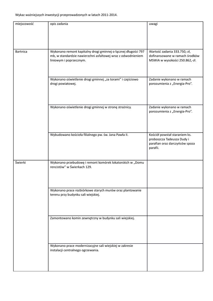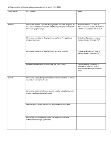 Wykaz ważniejszych inwestycji przeprowadzonych w latach 2011-2014. miejscowość opis zadania uwagi Bartnica Wykonano remont kapitalny drogi gminnej o łącznej długości 797 mb, w standardzie nawierzchni asfaltowej wraz z odwodnieniem liniowym i poprzecznym. Wartość zadania 333.750,-zł, dofinansowane w ramach środków MSWiA w wysokości 250.862,-zł. Wykonano oświetlenie drogi gminnej „za torami” i częściowo drogi powiatowej. Zadanie wykonano w ramach porozumienia z „Energia-Pro”. Wykonano oświetlenie drogi gminnej w stronę strażnicy. Zadanie wykonano w ramach porozumienia z „Energia-Pro”. Wybudowano kościoła filialnego pw. św. Jana Pawła II. Kościół powstał staraniem ks. proboszcza Tadeusza Dudy i parafian oraz darczyńców spoza parafii. Świerki Wykonano przebudowę i remont komórek lokatorskich w „Domu rencistów” w Świerkach 129. Wykonano prace rozbiórkowe starych murów oraz plantowanie terenu przy budynku sali wiejskiej. Zamontowano komin zewnętrzny w budynku sali wiejskiej. Wykonano prace modernizacyjne sali wiejskiej w zakresie instalacji centralnego ogrzewania. Przygotowano dokumentację na rozbiórkę części budynku przy sali wiejskiej, stanowiącej zagrożenie budowlane. Wykonano rozbiórkę części budynku przyległego do sali wiejskiej. Trwają prace przy wykonaniu restauracji elewacji ściany budynku sali wiejskiej wraz z wykonaniem ocieplenia ściany i odtworzeniem stolarki okiennej. Zlecono rozbiórkę starej wiaty przystankowej i wymianę na nową w centrum wsi (kierunek Kłodzko). Wiatę przystankową przekazał KSS Świerki. Przystąpiono do zmiany MPZP części wsi Świerki i Dworki w obrębie byłego kamieniołomu KSS Świerki LAFARGE. Zakończono I etap rekultywacji terenu po kopalni kamienia KSS Świerki w Świerkach. Dworki Wykonano remont rynien w budynku wspólnoty Świerki 198a. Zadanie wykonano w ramach wspólnoty mieszkaniowej. Wykonano remont pokrycia dachowego i ubikacji w budynku wspólnoty Świerki 134. Zadanie wykonano w ramach wspólnoty mieszkaniowej. Wykonano rozbiórkę budynku stodoły przy budynku Dworki 8 (obiekt groził zawaleniem). Krajanów Wykonano remont kapitalny mostu w centrum wsi w ciągu drogi gminnej przy budynku nr 39. Wartość zadania 56.783,-zł, dofinansowane w ramach środków MSWiA w wysokości 45.426,-zł. Wykonano remont nawierzchni drogi gminnej w stronę Bytkowic z użyciem destruktu asfaltowego. Wykonano rozbiórkę budynku mieszkalnego nr 43, stanowiącego zagrożenie budowlane. Włodowice Parafia p.w. Św. Mikołaja w Świerkach wykonała remont konserwatorski ołtarza głównego etap I w kościele filialnym w Krajanowie. Zadanie wykonano w ramach dotacji udzielonej w 2012 r. przez Gminę Nowa Ruda. Parafia p.w. Św. Mikołaja w Świerkach wykonała remont konserwatorski ołtarza głównego etap II w kościele filialnym w Krajanowie Zadanie wykonano w ramach dotacji udzielonej w 2013 r. przez Gminę Nowa Ruda. Parafia wykonała remont dachu i wieży kościoła filialnego p.w. Św. Jerzego w Krajanowie. Dofinansowanie w ramach Programu Rozwoju Obszarów Wiejskich 2007-2013. Trwają prace przygotowawcze do zlecenia remontu świetlicy wiejskiej w zakresie wymiany stolarki okiennej oraz podłogi. Gmina podpisała umowę na wykonanie zadania. W ramach PROW na lata 20072013. Szacowana łączna wartość zadania 50.499,31 zł., pozyskana wartość dofinansowania 24.999,-zł. Wykonano remont drogi gminnej we Włodowicach na części działki nr 232/4 i części działki nr 247 o łącznej długości 354mb w standardzie nawierzchni asfaltowej (tzw. „dolna droga”). Wykonano remont drogi gminnej dr. 30/5 we Włodowicach o długości 370 mb. (w stronę p. Dziura). Wartość robót wynosiła 254.700,22 zł. brutto, zadanie dofinansowane z MAiC w wysokości 203.760,00 zł. Zrealizowano zadanie „Budowa chodnika w miejscowości Włodowice w ciągu drogi wojewódzkiej nr 385 - etap I, II, III”, w ramach którego wybudowano chodniki w centrum wsi, wzmocniono skarpę przy szkole, wybudowano 2 zatoki autobusowe wraz z wiatami przystankowymi, wybudowano parking naprzeciw remizy OSP, wymieniono oświetlenie uliczne w centrum wsi, przebudowano częściowo sieć kanalizacyjną oraz wykonano zagospodarowanie terenu przy sali wiejskiej. Wykonano dokumentację projektową budowy chodnika przy drodze wojewódzkiej od granicy z miastem Nowa Ruda do połączenia z istniejącym ciągiem chodnikowym. Dokumentację przekazano dla DSDiK. Planowana realizacja przez DSDiK w 2015 roku. Wartość robót wyniosła 1.043.526,71 zł. Zadanie było współfinansowane w 50% z budżetu województwa dolnośląskiego i w 50% z budżetu gminy Nowa Ruda. Zadanie zrealizowane w ramach porozumienia Gminy Nowa Ruda z Województwem Dolnośląskim przy udziale DSDiK. Wykonano remont pieszej kładki we Włodowicach (w ciągu chodnika). Wykonano remont przepustu na potoku Mątwa we Włodowicach w ciągu drogi gminnej w kierunku posesji Pana Pendlowskiego. Wykonano odbudowę muru oporowego kamiennego przy posesji nr 5. Wykonano zabezpieczenie konstrukcyjne ściany szczytowej oraz położenie nowej elewacji tej ściany budynku komunalnego nr 49. Zamontowano wkład kominowy w budynku OSP. Przedszkole we Włodowicach: - naprawa dachu na drewnianej werandzie, - naprawa drewnianego zestawu zabawowego na placu zabaw. W miejsce zlikwidowanej szkoły podstawowej i przedszkola we Włodowicach powstały placówki społeczne: przedszkole, szkoła podstawowa i gimnazjum, prowadzone przez Fundację FALA z Wrocławia. Zadania zrealizowane przed przekazaniem placówek dla Stowarzyszenia. Wykonano naprawę samochodu strażackiego Ford Transit OSP Włodowice. Bieganów Wykonano wymianę stolarki okiennej klatki schodowej i drzwi wejściowych w budynku nr 51. Zadanie wykonano w ramach wspólnoty mieszkaniowej. Wykonano remont dachu i orynnowania w budynku nr 57. Zadanie wykonano w ramach wspólnoty mieszkaniowej. Wybudowano nowy przepust wielk