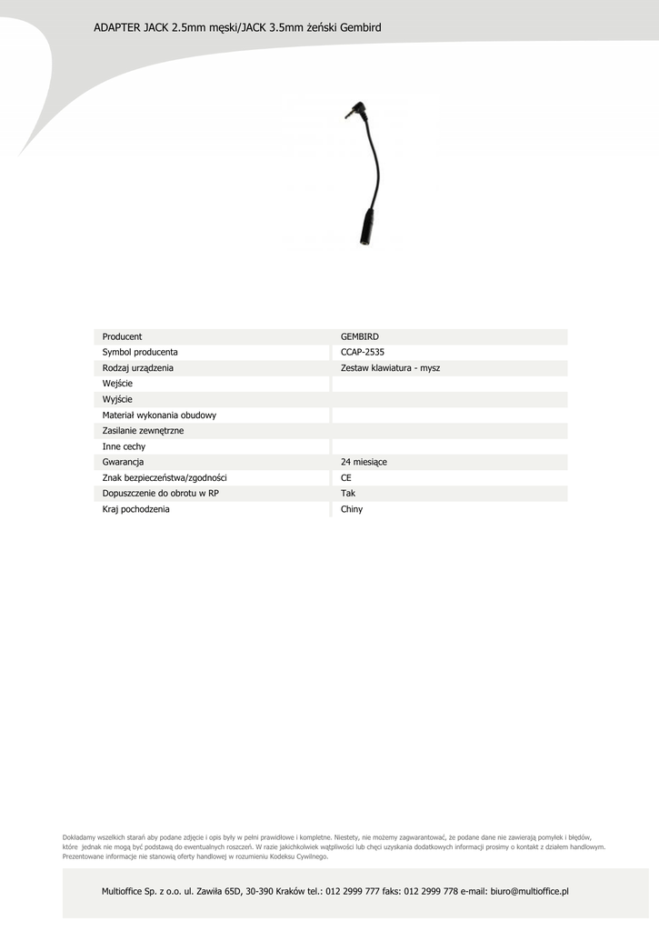 ADAPTER JACK 2.5mm męski/JACK 3.5mm żeński Gembird Producent GEMBIRD Symbol producenta CCAP-2535 Rodzaj urządzenia Zestaw klawiatura - mysz Wejście Wyjście Materiał wykonania obudowy Zasilanie zewnętrzne Inne cechy Gwarancja 24 miesiące Znak bezpieczeństwa/zgodności CE Dopuszczenie do obrotu w RP Tak Kraj pochodzenia Chiny Dokładamy wszelkich starań aby podane zdjęcie i opis były w pełni prawidłowe i kompletne. Niestety, nie możemy zagwarantować, że podane dane nie zawierają pomyłek i błędów, które jednak nie mogą być podstawą do ewentualnych roszczeń. W razie jakichkolwiek wątpliwości lub chęci uzyskania dodatkowych informacji prosimy o kontakt z działem handlowym. Prezentowane informacje nie stanowią oferty handlowej w rozumieniu Kodeksu Cywilnego. Multioffice Sp. z o.o. ul. Zawiła 65D, 30-390 Kraków tel.: 012 2999 777 faks: 012 2999 778 e-mail: [email protected]