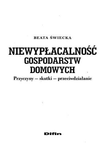 BEATA ŚWIECKA w r NIEWYPŁACALNOŚĆ GOSPODARSTW DOMOWYCH Przyczyny — skutki — przeciwdziałanie Difin Spis treści Wstęp Rozdział 1. Gospodarstwo domowe jako przedmiot nauk o finansach 19 1.1. Gospodarstwo domowe-pojęcie, cechy, klasyfikacja 1.1.1. Poj ecie i cechy gospodarstw domowych 1.1.2. Kryteria klasyfikacji gospodarstw domowych . 1.1.3. Decyzje finansowe gospodarstw domowych 1.1.4. Racjonalność decyzji finansowych w kontekście niewypłacalności gospodarstw domowych 1.2. Gospodarstwo domowe w finansach gospodarstw domowych i finansach osobistych 1.2.1. Finanse gospodarstw domowych i finanse osobiste jako subdyscypliny nauk o finansach 1.2.2. Instrumentarium pojęciowe do budowy podstaw finansów gospodarstw domowych i finansów osobistych 1.2.3. Mikrofinanse jako subdyscyplina finansów osobistych 1.3. Gospodarstwa domowe w finansach behawioralnych i dziedzinach pokrewnych 19 19 26 34 Rozdział 2. Teoretyczne podstawy zadłużenia i niewypłacalności gospodarstw domowych 2.1. Zadłużenie gospodarstw domowych - istota zjawiska 2.1.1. Pojęcie zadłużenia i klasyfikacja instytucji zadłużeniowych 2.1.2. Czynniki wpływające na zadłużenie gospodarstw domowych 2.2. Nadmierne zadłużenie i niewypłacalność gospodarstw domowych - sformułowanie i identyfikacja problemu 2.2.1. Nadmierne zadłużenie — pojęcie i istota zjawiska 45 62 62 75 81 84 93 93 93 97 102 102 Spis treści 2.2.2. Niewypłacalność gospodarstw domowych - teoretyczne sformułowanie problemu 2.2.3. Proces i etapy niewypłacalności gospodarstw domowych 2.2.4. Pomiar nadmiernego zadłużenia i niewypłacalności gospodarstw domowych 2.3. Ryzyko finansowe i niepewność w ocenie zagrożenia niewypłacalnością gospodarstw domowych 2.3.1. Ryzyko i niepewność - pojęcie i znaczenie w procesie niewypłacalności gospodarstw domowych v 2.3.2. Rodzaje ryzyka występującego w procesie niewypłacalności gospodarstw domowych 2.3.3. Znaczenie zarządzania ryzykiem w procesie niewypłacalności gospodarstw domowych 2.4. Kryteria klasyfikacji przyczyn i skutki niewypłacalności gospodarstw domowych 2.4.1. Kryteria klasyfikacji przyczyn niewypłacalności gospodarstw domowych 2.4.2. Skutki niewypłacalności gospodarstw domowych Rozdział 3. Niewypłacalność gospodarstw domowych na tle badań pierwotnych i wtórnych 3.1. Zadłużenie i niewypłacalność gospodarstw domowych w Polsce w świetle badań wtórnych 3.2. Analiza zależności między zmiennymi wpływającymi na regulowanie zobowiązań i niewypłacalność gospodarstw domowych w świetle doświadczeń zagranicznych 3.3. Niewypłacalność gospodarstw domowych w świetle badań pierwotnych 3.3.1. Metodyka badań w zakresie niewypłacalności gospodarstw domowych 3.3.2. Analiza struktury na podstawie badań pierwotnych 3.3.3. Analiza zależności między zmiennymi wpływającymi na niewypłacalność gospodarstw domowych 3.4. Niewypłacalność osób fizycznych i ich gospodarstw domowych w świetle prawa 105 108 111 115 115 118 126 130 130 140 145 145 165 168 168 173 186 198 Rozdział 4. Identyfikacja działań prewencyjnych, predykcyjnych i rewitalizacyjnych w zakresie niewypłacalności gospodarstw domowych 211 4.1. Niekorzystna sytuacja finansowa gospodarstw domowych a działania prewencyjne, predykcyjne i rewitalizacyjne 211 4.2. Prewencja w zakresie niewypłacalności gospodarstw domowych 218 4.2.1. Prewencja pierwotna w zakresie niewypłacalności gospodarstw domowych 218 Spis treści 7 4.2.2. Prewencja wtórna w zakresie niewypłacalności gospodarstw domowych 4.3. Predykcja niewypłacalności gospodarstw domowych 4.3.1. Sygnały wczesnego ostrzegania w ocenie zagrożenia niewypłacalnością gospodarstw domowych 4.3.2. Budowa modelu systemu wczesnego ostrzegania przed niewypłacalnością gospodarstw domowych 4.4. Rewitalizacja finansowa niewypłacalnych gospodarstw domowych 235 251 Wnioski i rekomendacje 256 . _. 226 229 229 Bibliografia 267 Spis tabel 285 Spis rysunków 286