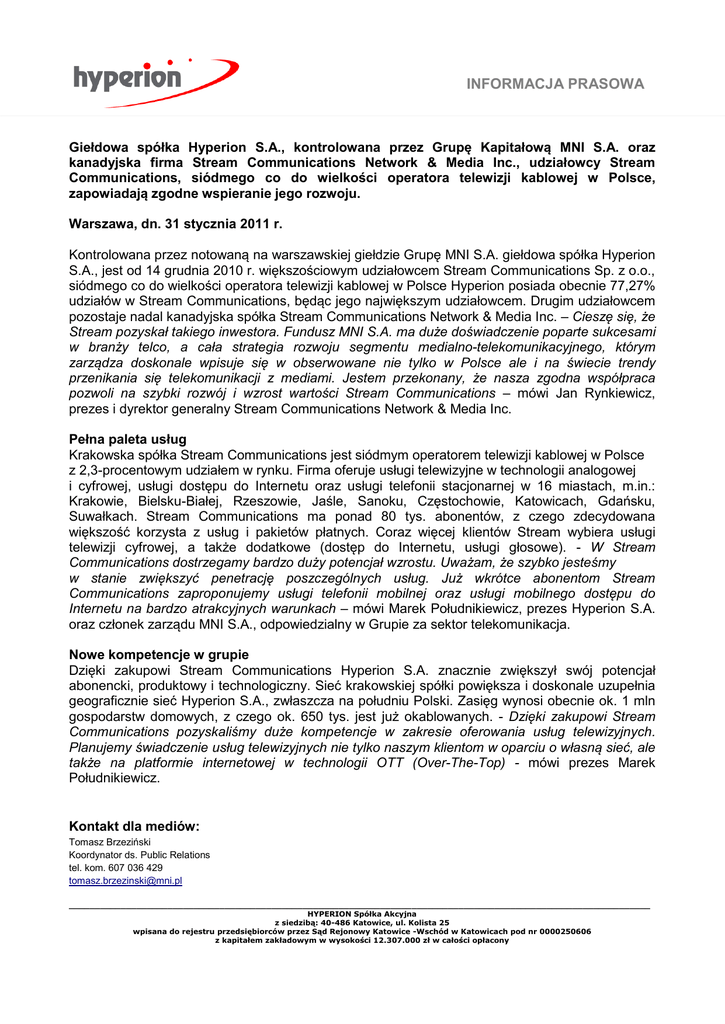 INFORMACJA PRASOWA Giełdowa spółka Hyperion S.A., kontrolowana przez Grupę Kapitałową MNI S.A. oraz kanadyjska firma Stream Communications Network & Media Inc., udziałowcy Stream Communications, siódmego co do wielkości operatora telewizji kablowej w Polsce, zapowiadają zgodne wspieranie jego rozwoju. Warszawa, dn. 31 stycznia 2011 r. Kontrolowana przez notowaną na warszawskiej giełdzie Grupę MNI S.A. giełdowa spółka Hyperion S.A., jest od 14 grudnia 2010 r. większościowym udziałowcem Stream Communications Sp. z o.o., siódmego co do wielkości operatora telewizji kablowej w Polsce Hyperion posiada obecnie 77,27% udziałów w Stream Communications, będąc jego największym udziałowcem. Drugim udziałowcem pozostaje nadal kanadyjska spółka Stream Communications Network & Media Inc. – Cieszę się, że Stream pozyskał takiego inwestora. Fundusz MNI S.A. ma duże doświadczenie poparte sukcesami w branży telco, a cała strategia rozwoju segmentu medialno-telekomunikacyjnego, którym zarządza doskonale wpisuje się w obserwowane nie tylko w Polsce ale i na świecie trendy przenikania się telekomunikacji z mediami. Jestem przekonany, że nasza zgodna współpraca pozwoli na szybki rozwój i wzrost wartości Stream Communications – mówi Jan Rynkiewicz, prezes i dyrektor generalny Stream Communications Network & Media Inc. Pełna paleta usług Krakowska spółka Stream Communications jest siódmym operatorem telewizji kablowej w Polsce z 2,3-procentowym udziałem w rynku. Firma oferuje usługi telewizyjne w technologii analogowej i cyfrowej, usługi dostępu do Internetu oraz usługi telefonii stacjonarnej w 16 miastach, m.in.: Krakowie, Bielsku-Białej, Rzeszowie, Jaśle, Sanoku, Częstochowie, Katowicach, Gdańsku, Suwałkach. Stream Communications ma ponad 80 tys. abonentów, z czego zdecydowana większość korzysta z usług i pakietów płatnych. Coraz więcej klientów Stream wybiera usługi telewizji cyfrowej, a także dodatkowe (dostęp do Internetu, usługi głosowe). - W Stream Communications dostrzegamy bardzo duży potencjał wzrostu. Uważam, że szybko jesteśmy w stanie zwiększyć penetrację poszczególnych usług. Już wkrótce abonentom Stream Communications zaproponujemy usługi telefonii mobilnej oraz usługi mobilnego dostępu do Internetu na bardzo atrakcyjnych warunkach – mówi Marek Południkiewicz, prezes Hyperion S.A. oraz członek zarządu MNI S.A., odpowiedzialny w Grupie za sektor telekomunikacja. Nowe kompetencje w grupie Dzięki zakupowi Stream Communications Hyperion S.A. znacznie zwiększył swój potencjał abonencki, produktowy i technologiczny. Sieć krakowskiej spółki powiększa i doskonale uzupełnia geograficznie sieć Hyperion S.A., zwłaszcza na południu Polski. Zasięg wynosi obecnie ok. 1 mln gospodarstw domowych, z czego ok. 650 tys. jest już okablowanych. - Dzięki zakupowi Stream Communications pozyskaliśmy duże kompetencje w zakresie oferowania usług telewizyjnych. Planujemy świadczenie usług telewizyjnych nie tylko naszym klientom w oparciu o własną sieć, ale także na platformie internetowej w technologii OTT (Over-The-Top) - mówi prezes Marek Południkiewicz. Kontakt dla mediów: Tomasz Brzeziński Koordynator ds. Public Relations tel. kom. 607 036 429 [email protected] ________________________________________________________________________________________________________________ HYPERION Spółka Akcyjna z siedzibą: 40-486 Katowice, ul. Kolista 25 wpisana do rejestru przedsiębiorców przez Sąd Rejonowy Katowice -Wschód w Katowicach pod nr 0000250606 z kapitałem zakładowym w wysokości 12.307.000 zł w całości opłacony