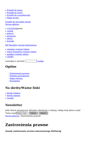 ● ● ● ● Przejdź do menu Przejdź do treści Przejdź do wyszukiwarki Mapa strony Przejdź do początku strony Strona główna ● ● ● ● ● ● o H2Ostrógmenu cennik galeria promocje oferta kontakt BiP Racibórz wersja kontrastowa ● ● ● ● zmniejsz rozmiar tekstu ustaw domyślny rozmiar tekstu zwiększ rozmiar tekstu ČESKY wyszukaj w serwisie szukaj Ogólne ❍ ❍ ❍ ❍ Zastrzeżenia prawne Polityka prywatności Mapa witryny Newsletter Na skróty/Ważne linki ● ● ● Strefa relaksu Strefa zabawy Cennik Newsletter Jeśli chcesz otrzymywać aktualne informacje z witryny, dodaj swój adres e-mail Twój e-mail Twój e-mail Zapisz Wypisz Strona główna / Zastrzeżenia prawne Zastrzeżenia prawne Zasady użytkowania serwisu internetowego H2Ostróg Właściciel witryny H2Ostróg 1. Właścicielem witryny internetowej, znajdującej się pod adresem www.aquapark.raciborz.pl jest OSIR Racibórz H2Ostróg. 2. Za treść poszczególnych podstron i publikowanych informacji odpowiada właściciel i jego pracownicy, którym powierzono zadanie redagowania treści serwisu. Warunki ogólne 1. Dane, informacje i opracowania zawarte w serwisie internetowym H2Ostróg są publikowane jedynie dla celów informacyjnych i promocyjnych. 2. Dane zamieszczone w serwisie internetowym H2Ostróg chronione są przepisami ustawy o prawie autorskim, stanowią własność H2Ostróg lub ich autorów. 3. Korzystanie z serwisu internetowego H2Ostróg jest równoznaczne z wyrażeniem zgody na stosowanie się do warunków korzystania z serwisu określonych w zastrzeżeniach prawnych. Warunki użytkowania serwisu 1. Użytkownikowi serwisu przysługuje prawo pobierania oraz drukowania stron lub ich fragmentów pod warunkiem nienaruszania praw autorskich. 2. Zabrania się kopiowania, redystrybucji, publikowania, rozpowszechniania, udostępniania czy wykorzystywania w inny sposób całości lub części danych zawartych w serwisie internetowym Agencji Interaktywnej H2Ostróg z Katowic w celach komercyjnych oraz poprzez włączanie ich do serwisów WWW, z zastrzeżeniem ust. 6. 3. Korzystanie z materiałów zamieszczonych na stronie wymaga zgody H2Ostróg, poza wyjątkami określonymi w powszechnie obowiązujących przepisach prawa takich jak dozwolony użytek w rozumieniu ustawy z dnia 4 lutego 1994 r. o prawie autorskim i prawach pokrewnych (Dz.U. z 2006 r. nr 90 poz. 631, t.jedn. z późn. zm.). 4. Zabrania się, przerabiania, przystosowywania lub dokonywania jakichkolwiek innych zmian danych zawartych w serwisie internetowym H2Ostróg, z zastrzeżeniem ust. 6. 5. Zabrania się wielokrotnego lub systematycznego pobierania z serwisu internetowego H2Ostróg, elementów nawet nie chronionych, których pobranie mogłoby powodować szkodę dla H2Ostróg lub firm hostujących serwis WWW (zwiększających ruch na hostingu oraz innych dzialań), z zastrzeżeniem ust. 6. 6. Rozpowszechnianie i wykorzystywanie danych i informacji lub ich części zawartych w serwisie internetowym Agencji Interaktywnej H2Ostróg jest dopuszczalne wyłącznie po uzyskaniu pisemnej zgody H2Ostróg S.C. 7. W przypadku uzyskania pisemnej zgody Agencji Interaktywnej H2Ostróg S,.C. na rozpowszechnianie i wykorzystywanie danych, informacji lub prac lub ich części zawartych w serwisie internetowym H2Ostróg, rozpowszechnianie to i wykorzystywanie dopuszczalne jest na poniższych zasadach: 1) wykorzystywane informacje prezentowane będą całości, bez zmian, skrótów i przeróbek; 2) wykorzystywane dane, informacje i prace będą posiadały widoczne odwoływanie do serwisu internetowego H2Ostróg poprzez podanie źródła 8. Otrzymując dostęp do stron H2Ostróg użytkownik przyjmuje do wiadomości, że wszelkie informacje wysyłane za pomocą poczty elektronicznej oraz innych form transmisji poprzez sieć Internet nie mają charakteru poufnego i mogą być narażone na ingerencję osób trzecich. 9. Znaki graficzne, logotypy i część materiałów tekstowych wykorzystanych w stronie stanowią własność ich autorów lub firm. H2Ostróg nie udziela zgody na ich wykorzystanie w jakiejkolwiek formie poza zapisami ustawy z dnia 4 lutego 1994 r. o prawie autorskim i prawach pokrewnych (Dz.U. z 2006 r. nr 90 poz. 631, t.jedn. z późn. zm.). 10. Nazwy produktów i firm pojawiające się w niniejszej witrynie mogą być znakami handlowymi odpowiednich właścicieli i zostały użyte w celach informacyjnych. Zakres odpowiedzialności H2Ostróg 1. Informacje zawarte w serwisie mogą być nieaktualne pomimo podejmowania przez H2Ostróg wszelkich działań mających na celu zweryfikowanie dokładności i aktualności całej zawartości serwisu. 2. Ryzyko z tytułu użytkowania niniejszego serwisu internetowego ponosi wyłącznie jego użytkownik. 1. H2Ostróg nie ponosi odpowiedzialności za szkody wynikające z korzystania z niniejszego serwisu internetowego lub serwisów z nim zlinkowanych, a w szczególności za szkody będące następstwem: 1) interpretacji i/lub wykorzystania informacji dostępnych w serwisie oraz za jakiekolwiek straty spowodowane stosowaniem tych danych; 2) niemożności korzystania z serwisu, braku dostępu do niego, utraty danych lub utraty korzyści płynących z informacji dostępnych w serwisie; Obowiązywanie zasad 1. Niniejsze warunki korzystania z danych, informacji i opracowań mają zastosowanie do wykorzystania tych danych, informacji i prac, z których korzystanie rozpoczęło się w czasie ich obowiązywania. 2. H2Ostróg ma prawo jednostronnej zmiany niniejszych warunków w części lub w całości w każdym czasie. Ich stosowanie przyjmuje się do dnia opublikowania treści. drukuj zapisz jako pdf ● ● ● ● 32 415 48 09 32 415 37 17 Mail Facebook Ośrodek Sportu i Rekreacji ul. Zamkowa 4, 47-400 Racibórzgodziny otwarcia obiektu: 7 dni w tygodniu, od poniedziałku do niedzieli 6.00-22.00 ● ● ● ● ● ● ● O h2o cennik galeria promocje oferta kontakt mapa witryny Projektowanie stron