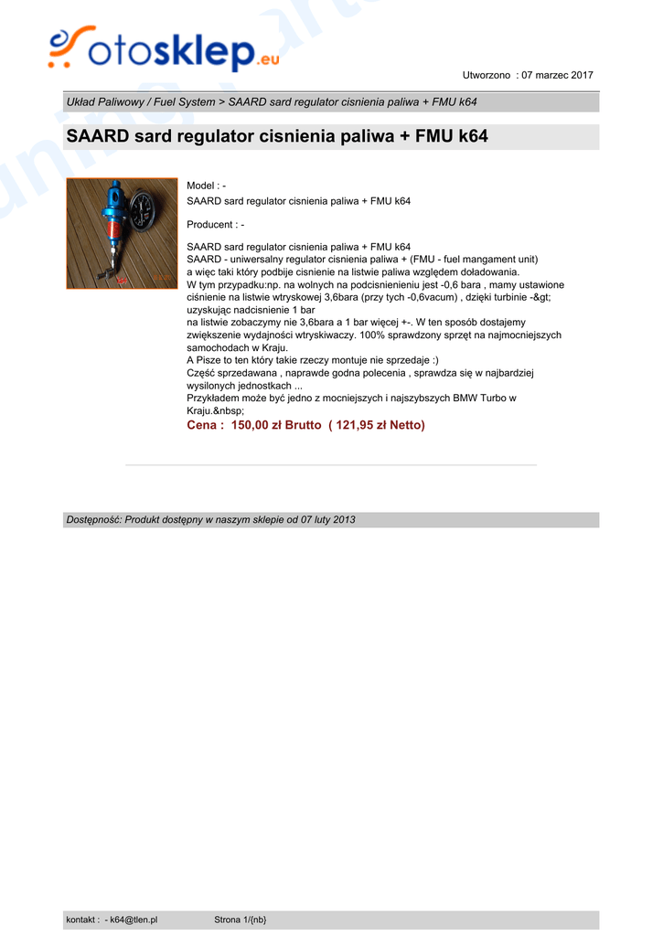 p g n i n u t r a Utworzono : 07 marzec 2017 Układ Paliwowy / Fuel System > SAARD sard regulator cisnienia paliwa + FMU k64 SAARD sard regulator cisnienia paliwa + FMU k64 Model : SAARD sard regulator cisnienia paliwa + FMU k64 Producent : SAARD sard regulator cisnienia paliwa + FMU k64 SAARD - uniwersalny regulator cisnienia paliwa + (FMU - fuel mangament unit) a więc taki który podbije cisnienie na listwie paliwa względem doładowania. W tym przypadku:np. na wolnych na podcisnienieniu jest -0,6 bara , mamy ustawione ciśnienie na listwie wtryskowej 3,6bara (przy tych -0,6vacum) , dzięki turbinie -> uzyskując nadcisnienie 1 bar na listwie zobaczymy nie 3,6bara a 1 bar więcej +-. W ten sposób dostajemy zwiększenie wydajności wtryskiwaczy. 100% sprawdzony sprzęt na najmocniejszych samochodach w Kraju. A Pisze to ten który takie rzeczy montuje nie sprzedaje :) Część sprzedawana , naprawde godna polecenia , sprawdza się w najbardziej wysilonych jednostkach ... Przykładem może być jedno z mocniejszych i najszybszych BMW Turbo w Kraju. Cena : 150,00 zł Brutto ( 121,95 zł Netto) Dostępność: Produkt dostępny w naszym sklepie od 07 luty 2013 kontakt : - [email protected] Strona 1/{nb}