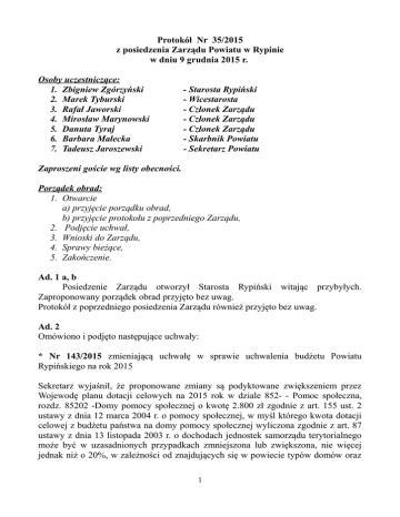 Protokół Nr 35/2015 z posiedzenia Zarządu Powiatu w Rypinie