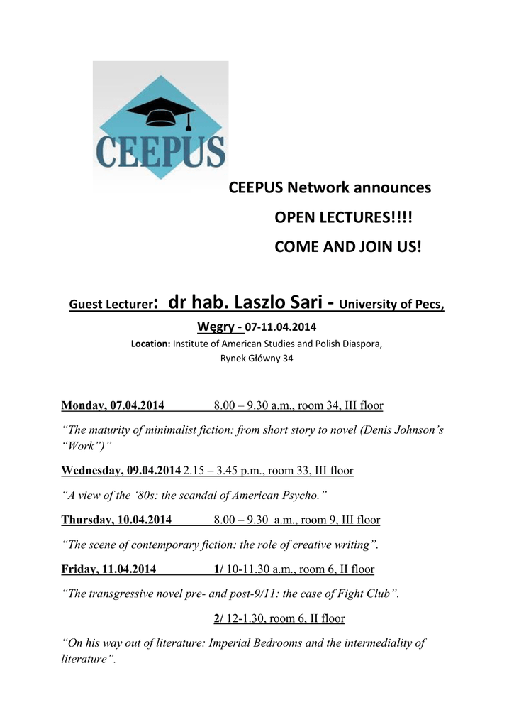 CEEPUS Network announces OPEN LECTURES!!!! COME AND JOIN US! Guest Lecturer: dr hab. Laszlo Sari - University of Pecs, Węgry - 07-11.04.2014 Location: Institute of American Studies and Polish Diaspora, Rynek Główny 34 Monday, 07.04.2014 8.00 – 9.30 a.m., room 34, III floor “The maturity of minimalist fiction: from short story to novel (Denis Johnson’s “Work”)” Wednesday, 09.04.2014 2.15 – 3.45 p.m., room 33, III floor “A view of the ‘80s: the scandal of American Psycho.” Thursday, 10.04.2014 8.00 – 9.30 a.m., room 9, III floor “The scene of contemporary fiction: the role of creative writing”. Friday, 11.04.2014 1/ 10-11.30 a.m., room 6, II floor “The transgressive novel pre- and post-9/11: the case of Fight Club”. 2/ 12-1.30, room 6, II floor “On his way out of literature: Imperial Bedrooms and the intermediality of literature”.