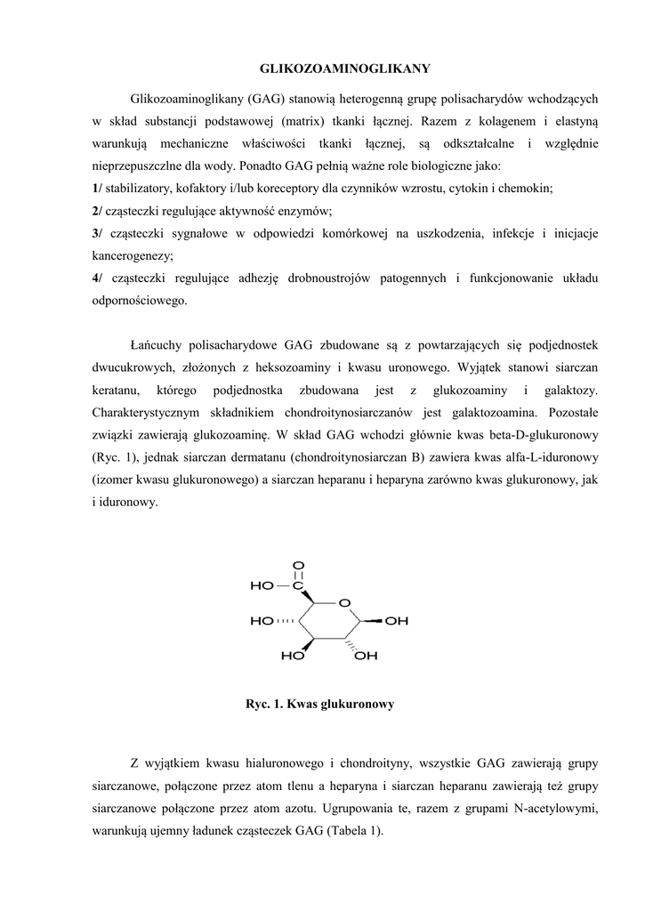 GLIKOZOAMINOGLIKANY Glikozoaminoglikany (GAG) stanowią heterogenną grupę polisacharydów wchodzących w skład substancji podstawowej (matrix) tkanki łącznej. Razem z kolagenem i elastyną warunkują mechaniczne właściwości tkanki łącznej, są odkształcalne i względnie nieprzepuszczlne dla wody. Ponadto GAG pełnią ważne role biologiczne jako: 1/ stabilizatory, kofaktory i/lub koreceptory dla czynników wzrostu, cytokin i chemokin; 2/ cząsteczki regulujące aktywność enzymów; 3/ cząsteczki sygnałowe w odpowiedzi komórkowej na uszkodzenia, infekcje i inicjacje kancerogenezy; 4/ cząsteczki regulujące adhezję drobnoustrojów patogennych i funkcjonowanie układu odpornościowego. Łańcuchy polisacharydowe GAG zbudowane są z powtarzających się podjednostek dwucukrowych, złożonych z heksozoaminy i kwasu uronowego. Wyjątek stanowi siarczan keratanu, którego podjednostka zbudowana jest z glukozoaminy i galaktozy. Charakterystycznym składnikiem chondroitynosiarczanów jest galaktozoamina. Pozostałe związki zawierają glukozoaminę. W skład GAG wchodzi głównie kwas beta-D-glukuronowy (Ryc. 1), jednak siarczan dermatanu (chondroitynosiarczan B) zawiera kwas alfa-L-iduronowy (izomer kwasu glukuronowego) a siarczan heparanu i heparyna zarówno kwas glukuronowy, jak i iduronowy. Ryc. 1. Kwas glukuronowy Z wyjątkiem kwasu hialuronowego i chondroityny, wszystkie GAG zawierają grupy siarczanowe, połączone przez atom tlenu a heparyna i siarczan heparanu zawierają też grupy siarczanowe połączone przez atom azotu. Ugrupowania te, razem z grupami N-acetylowymi, warunkują ujemny ładunek cząsteczek GAG (Tabela 1). 2 Tabela 1. Budowa różnych klas glikozoaminoglikanów Rodzaj GAG Kwas hialuronowy Disacharyd U GlcA( 1,3) H NAc ( 1,4) Siarczan U 2X (/ 1,3) chondroityny/siarczan H NAc, 4X, 6X ( 1,4) dermatanu Siarczan keratanu Gal 6X ( 1,4) H NAc, 6X ( 1,3) Heparyna/siarczan U 2X (/ 1,4) heparanu H NY, 3X, 6X ( 1,4) H Modyfikacje GlcA glukozoamina brak IdoA/ GlcA galaktozoamina X - siarczan Gal glukozoamina IdoA/ GlcA glukozoamina X - siarczan X - siarczan Yacetyl/siarczan GlcA - kwas -D-glukuronowy; IdoA - kwas -L-iduronowy; H - /-D-glukozoamina (GlcNAc) lub -D-galaktozoamina (GalNAc); Gal - -D-galaktoza; W warunkach in vivo GAG występują w postaci połączeń z białkami jako proteoglikany. Łańcuch polisacharydowy połączony jest z polipeptydem wiązaniem kowalencyjnym a region wiązania posiada specyficzna sekwencję: galaktoza-galaktoza-ksyloza-treonina. Proteoglikany chrząstek występują jako kompleksy z kwasem hialuronowym (Ryc. 2). Organizacja molekularna łańcucha GAG wokół rdzenia białkowego spełnia funkcję porównywalną z działaniem gąbki. Proteoglikany wchłaniają niezwykle duże ilości wody ze środowiska, w którym są zanurzone. Tzw. współczynnik pęcznienia wynosi 30-50x wartości suchej masy proteoglikanu. Właściwości te wynikają z budowy przestrzennej proteoglikanu. Ujemnie naładowane łańcuchy GAG obracają się wokół rdzenia białkowego jak na zawiasach i wystają na zewnątrz cząsteczki. Pozwala to na penetrację dużych ilości rozpuszczalnika, czyli wody. Jednak w warunkach in vivo proteoglikany w substancji podstawowej tkanki łącznej nie chłoną maksymalnej ilości wody, powstrzymywane przez siatkę kolagenową, względnie nierozciągliwą. Takie właściwości hydrodynamiczne pozwalają na połączenie cech sztywności i odkształcalności. Z upływem wieku, siarczan chondroityny w chrząstce ustępuje miejsca siarczanowi keratanu, co usztywnia tkankę. 3 Oligosacharydy połączone przez atom azotu Rdzeń białkowy Siarczan keratanu Sairczan chondroityny Kwas hialuronowy Ryc. 2. Struktura cząsteczki proteoglikanu Kwas hialuronowy (HA) jako składnik proteoglikanów odgrywa ważną rolę w utrzymywaniu integralności tkanek, przede wszystkim skóry, chrząstek i innych rodzajów tkanek łącznych, ułatwia również migrację i proliferację komórek w procesach zapalnych, gojeniu się ran, rozwoju zarodkowym i angiogenezie. Kwas hialuronowy zapewnia właściwe nawodnienie tkanek i amortyzuje urazy. Ten polisacharyd odpowiada również za prawidłowe wykształcenie i funkcjonowanie strun głosowych, zapewniając im odpowiednią elastyczność. W chrząstkach proteoglikany zawierające HA agregują z białkami tworząc kompleksy – agrekany, nadające chrząstkom unikalne cechy żelu i właściwości mechaniczne. Skóra, gałka oczna i chrząstka szklista są tkankami o największej zawartości kwasu hialuronowego w organizmie ludzkim. Kwas hialuronowy zbudowany jest z naprzemiennie ułożonych czasteczek kwasu glukuronowego i N-acetyloglukozoaminy, powtórzenia tych podjednostek wystepują ok. 2000x. Jego synteza następuje na powierzchni błony komórkowej, dzięki reakcjom katalizowanym przez syntazę hialuronianową. W porównaniu z innymi cząsteczkami środowiska zewnątrzkomórkowego, HA charakteryzuje się szybkim metabolizmem. Jego degradacja zachodzi w odległych gruczołach limfatycznych a fragmenty zdegradowanego HA krążą z limfą. W katabolizmie HA biorą udział dwa typy hialuronidaz, enzymy lizosomalne: betaglukuronidaza i beta-N-acetyloglukozoaminidaza oraz receptor dla produktów rozpadu hialuronianu, znajdujący się na powierzchni komórek wątroby, dzięki któremu te fragmenty wchodzą do komórek na drodze endocytozy. Katabolizm HA przebiega wieloetapowo, produktem każdego etapu są krótsze łańcuchy glikozoaminoglikanu, o zróżnicowanych 4 funkcjach biologicznych. Oligomery o masie rzędu 1x104 kDa działają jako wypełniacze przestrzeni międzykomórkowych, utrzymują ich nawodnienie, zapobiegają angiogenezie (tworzeniu nowych naczyń krwionośnych) oraz działają immunosupresyjnie. Mniejsze polimery o masie ok 20 kDa działają stymulująco na układ odpornościowy i angiogenezę oraz prozapalnie. Obecność kwasu hialuronowego o krótkich łańcuchach w płynie stawowym poga