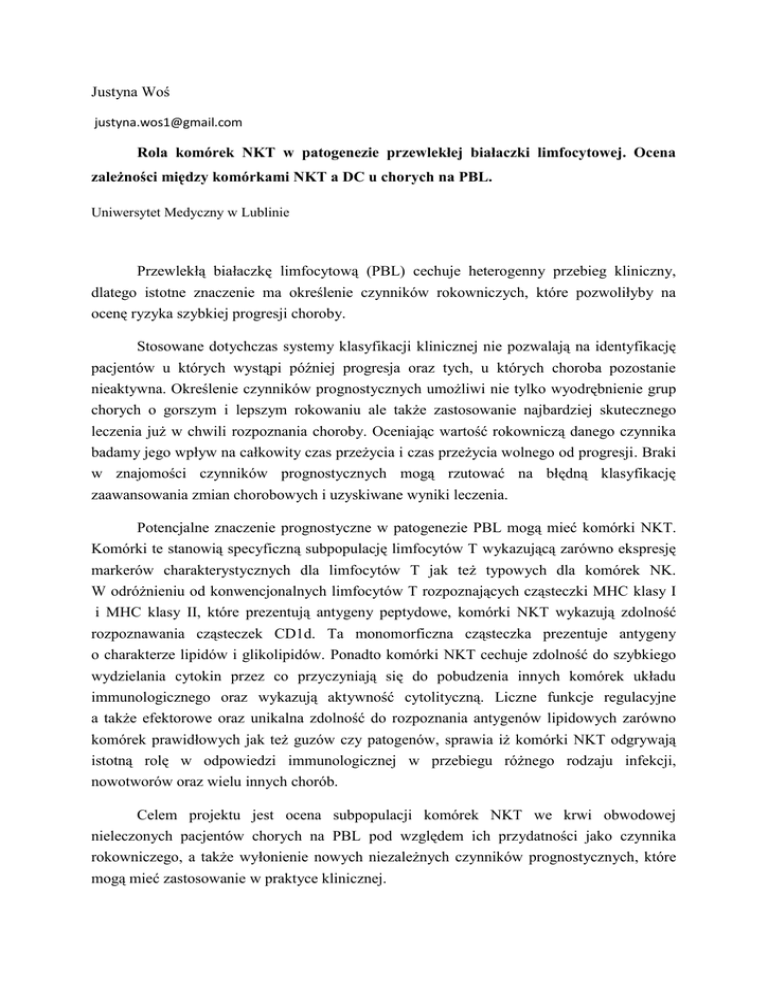 Justyna Woś [email protected] Rola komórek NKT w patogenezie przewlekłej białaczki limfocytowej. Ocena zależności między komórkami NKT a DC u chorych na PBL. Uniwersytet Medyczny w Lublinie Przewlekłą białaczkę limfocytową (PBL) cechuje heterogenny przebieg kliniczny, dlatego istotne znaczenie ma określenie czynników rokowniczych, które pozwoliłyby na ocenę ryzyka szybkiej progresji choroby. Stosowane dotychczas systemy klasyfikacji klinicznej nie pozwalają na identyfikację pacjentów u których wystąpi później progresja oraz tych, u których choroba pozostanie nieaktywna. Określenie czynników prognostycznych umożliwi nie tylko wyodrębnienie grup chorych o gorszym i lepszym rokowaniu ale także zastosowanie najbardziej skutecznego leczenia już w chwili rozpoznania choroby. Oceniając wartość rokowniczą danego czynnika badamy jego wpływ na całkowity czas przeżycia i czas przeżycia wolnego od progresji. Braki w znajomości czynników prognostycznych mogą rzutować na błędną klasyfikację zaawansowania zmian chorobowych i uzyskiwane wyniki leczenia. Potencjalne znaczenie prognostyczne w patogenezie PBL mogą mieć komórki NKT. Komórki te stanowią specyficzną subpopulację limfocytów T wykazującą zarówno ekspresję markerów charakterystycznych dla limfocytów T jak też typowych dla komórek NK. W odróżnieniu od konwencjonalnych limfocytów T rozpoznających cząsteczki MHC klasy I i MHC klasy II, które prezentują antygeny peptydowe, komórki NKT wykazują zdolność rozpoznawania cząsteczek CD1d. Ta monomorficzna cząsteczka prezentuje antygeny o charakterze lipidów i glikolipidów. Ponadto komórki NKT cechuje zdolność do szybkiego wydzielania cytokin przez co przyczyniają się do pobudzenia innych komórek układu immunologicznego oraz wykazują aktywność cytolityczną. Liczne funkcje regulacyjne a także efektorowe oraz unikalna zdolność do rozpoznania antygenów lipidowych zarówno komórek prawidłowych jak też guzów czy patogenów, sprawia iż komórki NKT odgrywają istotną rolę w odpowiedzi immunologicznej w przebiegu różnego rodzaju infekcji, nowotworów oraz wielu innych chorób. Celem projektu jest ocena subpopulacji komórek NKT we krwi obwodowej nieleczonych pacjentów chorych na PBL pod względem ich przydatności jako czynnika rokowniczego, a także wyłonienie nowych niezależnych czynników prognostycznych, które mogą mieć zastosowanie w praktyce klinicznej. Realizacja projektu pozwoli na lepsze poznanie i zrozumienie mechanizmów działania komórek NKT w przewlekłej białaczce limfocytowej, przyczyniając się w ten sposób do lepszego poznania patogenezy tego nowotwory, a także do ewentualnego rozwoju nowych strategii terapeutycznych. W przedstawionym projekcie jednocześnie oceniane będą komórki NKT w połączeniu z innymi komórkami układu immunologicznego (DC), krążącymi we krwi obwodowej, co pozwoli na głębszy wgląd w interakcje pomiędzy układem immunologicznym a przebiegiem choroby.