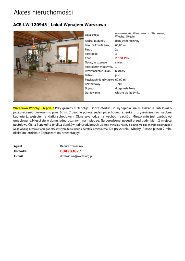 Akces nieruchomości ACE-LW-120945 | Lokal Wynajem Warszawa Lokalizacja mazowieckie, Warszawa m., Warszawa, Włochy, Okęcie Rodzaj budynku dom jednorodzinny Pow. całkowita [m2] 60,00 m2 Piętro 2p Ilość pokoi 3 Cena 2 500 PLN Opłaty w czynszu śmieci Ilość pięter w budynku 1 Przeznaczenie lokalu biurowy Balkon jest Powierzchnia użytkowa 60,00 m2 Rok budowy 1990 Dojazd droga asfaltowa Ogrzewanie własne dla budynku Warszawa Włochy. Okęcie!! Przy granicy z Ochotą!! Dobra oferta! Do wynajęcia na mieszkanie lub lokal o przeznaczeniu biurowym o pow. 60 m: 2 osobne pokoje: jeden przechodni, łazienka z prysznicem i wc, osobna kuchnia (z wejściem z klatki schodowej). Okna wychodzą na wschód i zachód. Mieszkanie jest częściowo umeblowane.Mieści się w domu jednorodzinnym na II piętrze. Na ogrodzonej posesji przed budynkiem 2 miejsca postojowe.Cicha i spokojna okolica domków jednorodzinnych.Do ceny wynajmu należy doliczyć media: energię elektryczną i wodę według liczników oraz gaz płacony ryczałtowo. Kaucja zwrotna 1-miesięczna. Do przystanku Włochy- Ratusz pieszo 2 min. Blisko do lotniska!! Zapraszam na prezentację!! Agent Danuta Trawińska Komórka 604283677 E-mail [email protected]