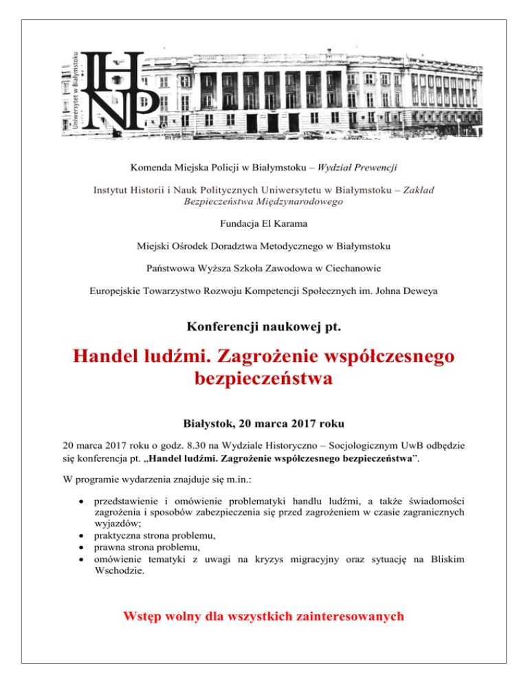 Komenda Miejska Policji w Białymstoku – Wydział Prewencji Instytut Historii i Nauk Politycznych Uniwersytetu w Białymstoku – Zakład Bezpieczeństwa Międzynarodowego Fundacja El Karama Miejski Ośrodek Doradztwa Metodycznego w Białymstoku Państwowa Wyższa Szkoła Zawodowa w Ciechanowie Europejskie Towarzystwo Rozwoju Kompetencji Społecznych im. Johna Deweya Konferencji naukowej pt. Handel ludźmi. Zagrożenie współczesnego bezpieczeństwa Białystok, 20 marca 2017 roku 20 marca 2017 roku o godz. 8.30 na Wydziale Historyczno – Socjologicznym UwB odbędzie się konferencja pt. „Handel ludźmi. Zagrożenie współczesnego bezpieczeństwa”. W programie wydarzenia znajduje się m.in.: przedstawienie i omówienie problematyki handlu ludźmi, a także świadomości zagrożenia i sposobów zabezpieczenia się przed zagrożeniem w czasie zagranicznych wyjazdów; praktyczna strona problemu, prawna strona problemu, omówienie tematyki z uwagi na kryzys migracyjny oraz sytuację na Bliskim Wschodzie. Wstęp wolny dla wszystkich zainteresowanych Komitet honorowy: insp. Wojciech Macutkiewicz, komendant Komendy Miejskiej Policji w Białymstoku dr hab. Joanna Sadowska, dziekan Wydziału Historyczno-Socjologicznego, prof. UwB dr hab. Jan Snopko, prof. UwB – Dyrektor Instytut Historii i Nauk Politycznych Komitet naukowy: płk dr hab. inż. Witalis Pellowski, prof. WSOWL, dziekan Wydziału Nauk o Bezpieczeństwie, Wyższa Szkoła Oficerska Wojsk Lądowych we Wrocławiu dr hab. Sławomir Zalewski, prof. WSPol, prodziekan ds. naukowych Wydział Bezpieczeństwa Wewnętrznego, Wyższa Szkoła Policji, Szczytno dr hab. Tomasz R. Aleksandrowicz, prof. WSPol, Wyższa Szkoła Policji, Szczytno dr hab. Daniel Boćkowski, prof. UwB, kierownik Zakładu Bezpieczeństwa Międzynarodowego, Uniwersytet w Białymstoku dr Magdalena El Ghamari, Prezes Fundacji El Karama, Uniwersytet w Białymstoku - Zakład Bezpieczeństwa Międzynarodowego, dr Arkadiusz Meller - Prodziekan Wydziału Elektroniki, Dziennikarstwa i Technik Multimedialnych, Państwowa Wyższa Szkoła Zawodowa w Ciechanowie por. dr Zbigniew Kuźniar, Wyższa Szkoła Oficerska Wojsk Lądowych we Wrocławiu dr Agnieszka Łapińska, Komenda Miejska Policji w Białymstoku mł. insp. dr inż. Krzysztof Tomaszycki, Komenda Główna Policji dr Rafał Panfil – kierownik Zakładu Bezpieczeństwa Wewnętrznego, Państwowa Wyższa Szkoła Zawodowa w Ciechanowie Paweł Pyrzyński - Prezes Zarządu, Europejskie Towarzystwo Rozwoju Kompetencji Społecznych im. Johna Deweya, OPT-PRO Group Komitet organizacyjny: dr Agnieszka Łapińska dr Magdalena El Ghamari Koło Naukowe Badaczy Stosunków Międzynarodowych UwB Partnerzy: