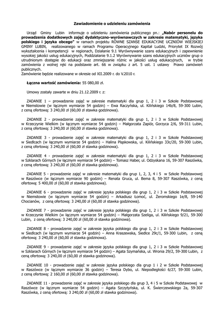 Zawiadomienie o udzieleniu zamówienia Urząd Gminy Lubin informuje o udzieleniu zamówienia publicznego pn.: „Nabór personelu do prowadzenia dodatkowych zajęć dydaktyczno-wyrównawczych w zakresie matematyki, języka polskiego i języka obcego” w ramach projektu RÓWNE SZANSE EDUKACYJNE UCZNIÓW WIEJSKIEJ GMINY LUBIN, realizowanego w ramach Programu Operacyjnego Kapitał Ludzki, Priorytet IX Rozwój wykształcenia i kompetencji w regionach, Działanie 9.1 Wyrównywanie szans edukacyjnych i zapewnienie wysokiej jakości usług edukacyjnych, Poddziałanie 9.1.2 Wyrównywanie szans edukacyjnych uczniów grup o utrudnionym dostępie do edukacji oraz zmniejszanie różnic w jakości usług edukacyjnych, w trybie zamówienia z wolnej ręki na podstawie art. 66 w związku z art. 5 ust. 1 ustawy Prawo zamówień publicznych. Zamówienie będzie realizowane w okresie od XII.2009 r. do V.2010 r. Łączna wartość zamówienia: 55 080,00 zł. Umowy zostały zawarte w dniu 21.12.2009 r. z: ZADANIE 1 – prowadzenie zajęć w zakresie matematyki dla grup 1, 2 i 3 w Szkole Podstawowej w Niemstowie (w łącznym wymiarze 54 godzin) – Ewa Raczyńska, ul. Kilińskiego 14b/8, 59-300 Lubin, z ceną ofertową: 3 240,00 zł (60,00 zł stawka godzinowa). ZADANIE 2 - prowadzenie zajęć w zakresie matematyki dla grup 1, 2 i 3 w Szkole Podstawowej w Krzeczynie Wielkim (w łącznym wymiarze 54 godzin) – Małgorzata Zapiór, Gorzyca 2/6, 59-311 Lubin, z ceną ofertową: 3 240,00 zł (60,00 zł stawka godzinowa). ZADANIE 3 - prowadzenie zajęć w zakresie matematyki dla grup 1, 2 i 3 w Szkole Podstawowej w Siedlcach (w łącznym wymiarze 54 godzin) – Halina Pląskowska, ul. Kilińskiego 33c/20, 59-300 Lubin, z ceną ofertową: 3 240,00 zł (60,00 zł stawka godzinowa). ZADANIE 4 - prowadzenie zajęć w zakresie matematyki dla grup 1, 2 i 3 w Szkole Podstawowej w Szklarach Górnych (w łącznym wymiarze 54 godzin) – Tomasz Haber, ul. Odzyskana 16, 59-307 Raszówka, z ceną ofertową: 3 240,00 zł (60,00 zł stawka godzinowa). ZADANIE 5 - prowadzenie zajęć w zakresie matematyki dla grup 1, 2, 3, 4 i 5 w Szkole Podstawowej w Raszówce (w łącznym wymiarze 90 godzin) – Renata Gruca, ul. Bema 8, 59-307 Raszówka, z ceną ofertową: 5 400,00 zł (60,00 zł stawka godzinowa). ZADANIE 6 - prowadzenie zajęć w zakresie języka polskiego dla grup 1, 2 i 3 w Szkole Podstawowej w Niemstowie (w łącznym wymiarze 54 godzin) – Arkadiusz Łomoć, ul. Żeromskiego 1e/8, 59-140 Chocianów, z ceną ofertową: 3 240,00 zł (60,00 zł stawka godzinowa). ZADANIE 7 - prowadzenie zajęć w zakresie języka polskiego dla grup 1, 2 i 3 w Szkole Podstawowej w Krzeczynie Wielkim (w łącznym wymiarze 54 godzin) – Małgorzata Szeliga, ul. Kilińskiego 9/21, 59-300 Lubin, z ceną ofertową: 3 240,00 zł (60,00 zł stawka godzinowa). ZADANIE 8 - prowadzenie zajęć w zakresie języka polskiego dla grup 1, 2 i 3 w Szkole Podstawowej w Siedlcach (w łącznym wymiarze 54 godzin) – Anna Kraszewska, Siedlce 29c/1, 59-300 Lubin, z ceną ofertową: 3 240,00 zł (60,00 zł stawka godzinowa). ZADANIE 9 - prowadzenie zajęć w zakresie języka polskiego dla grup 1, 2 i 3 w Szkole Podstawowej w Szklarach Górnych (w łącznym wymiarze 54 godzin) – Agata Szymańska, ul. Wronia 29/2, 59-300 Lubin, z ceną ofertową: 3 240,00 zł (60,00 zł stawka godzinowa). ZADANIE 10 - prowadzenie zajęć w zakresie języka polskiego dla grup 1 i 2 w Szkole Podstawowej w Raszówce (w łącznym wymiarze 36 godzin) – Teresa Dybo, ul. Niepodległości 6/27, 59-300 Lubin, z ceną ofertową: 2 160,00 zł (60,00 zł stawka godzinowa). ZADANIE 11 - prowadzenie zajęć w zakresie języka polskiego dla grup 3, 4 i 5 w Szkole Podstawowej w Raszówce (w łącznym wymiarze 54 godzin) – Agata Szczytyńska, ul. K. Świerczewskiego 2a, 59-307 Raszówka, z ceną ofertową: 3 240,00 zł (60,00 zł stawka godzinowa). ZADANIE 12 - prowadzenie zajęć w zakresie języka angielskiego dla grup 1, 2 i 3 w Szkole Podstawowej w Niemstowie (w łącznym wymiarze 54 godzin) – Ewa Pietrzak, ul. Budowniczych LGOM 31/7, 59-300 Lubin, z ceną ofertową: 3 240,00 zł (60,00 zł stawka godzinowa). ZADANIE 13 - prowadzenie zajęć w zakresie języka angielskiego dla grup 1, 2 i 3 w Szkole Podstawowej w Krzeczynie Wielkim (w łącznym wymiarze 54 godzin) – Agnieszka Mokrzycka, ul. Mickiewicza 76/8, 59-300 Lubin, z ceną ofertową: 3 240,00 zł (60,00 zł stawka godzinowa). ZADANIE 14 - prowadzenie zajęć w zakresie języka angielskiego dla grup 1, 2 i 3 w Szkole Podstawowej w Siedlcach (w łącznym wymiarze 54 godzin) – Beata Szpanko, ul. Sowia 2/25, 59-300 Lubin, z ceną ofertową: 3 240,00 zł (60,00 zł stawka godzinowa). ZADANIE 15 - prowadzenie zajęć w zakresie języka angielskiego dla grup 1, 2 i 3 w Szkole Podstawowej w Szklarach Górnych (w łącznym wymiarze 54 godzin) – Magdalena Soliwoda, ul. Wołodyjowskiego 7/17, 59-101 Polkowice, z ceną ofertową: 3 240,00 zł (60,00 zł stawka godzinowa). ZADANIE 16 - prowadzenie zajęć w zakresie języka niemieckiego dla grup 1, 2, 3, 4 i 5 w Szkole Podstawowej w Raszówce (w łącznym wymiarze 90 godzin) – Alicja Skiba, ul. Leszczynowa 20/14, 59-300 Lubin, z ceną ofertową: 5 400,00 zł (60,00 zł stawka godzinowa). WÓJT GMINY /-/ Irena Rogowska