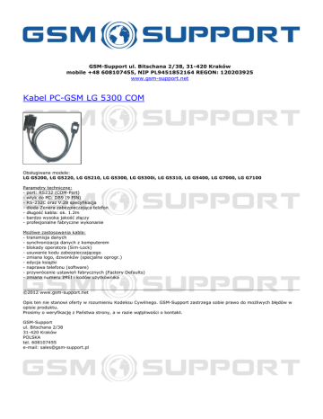 GSM-Support ul. Bitschana 2/38, 31-420 Kraków mobile +48 608107455, NIP PL9451852164 REGON: 120203925 www.gsm-support.net Kabel PC-GSM LG 5300 COM Obsługiwane modele: LG G5200, LG G5220, LG G5210, LG G5300, LG G5300i, LG G5310, LG G5400, LG G7000, LG G7100 Parametry techniczne: - port: RS232 (COM-Port) - wtyk do PC: DB9 (9 PIN) - RS-232C oraz V.28 specyfikacja - dioda Zenera zabezpieczająca telefon - długość kabla: ok. 1.2m - bardzo wysoka jakość złączy - profesjonalne fabryczne wykonanie Możliwe zastosowania kabla: - transmisja danych - synchronizacja danych z komputerem - blokady operatora (Sim-Lock) - usuwanie kodu zabezpieczającego - zmiana logo, dzwonków (specjalne oprogr.) - edycja książki - naprawa telefonu (software) - przywrócenie ustawień fabrycznych (Factory Defaults) - zmiana numeru IMEI i kodów użytkownika ©2012 www.gsm-support.net Opis ten nie stanowi oferty w rozumieniu Kodeksu Cywilnego. GSM-Support zastrzega sobie prawo do możliwych błędów w opisie produktu. Prosimy o weryfikację z Państwa strony, a w razie wątpliwości o kontakt. GSM-Support ul. Bitschana 2/38 31-420 Kraków POLSKA tel. 608107455 e-mail: [email protected] Powered by TCPDF (www.tcpdf.org)