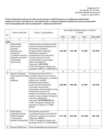 Załącznik Nr 1 do uchwały Nr 22/2001 Komitetu Badań Naukowych z dnia 21 lipca 2001 r. Wykaz jednostek naukowych, którym przyznano ś rodki finansowe na dofinansowanie badań naukowych i prac rozwojowych prowadzonych w ramach projektów bę dą cych częś cią programów Unii Europejskiej lub innych programów mię dzynarodowych Nazwa jednostki Lp. 1 2 5.PR 1 Politechnika Warszawska Wydział Mechaniczny Energetyki i Lotnictwa Instytut Techniki Lotniczej i Mechaniki Stosowanej 1 2 3 4 Numer i tytuł projektu 3 Wysokość dofinansowania w złotych w latach: 2001 4 Zastosowanie zaawansowanych metod symulacji komputerowej do badania systemów bezpieczeństwa biernego 148 400 pasażerów pojazdów samochodowych (Advanced virtual analysis of crash environments for passenger safety simulations) Akronim: ADVANCE 5.PR -III Program Tematyczny Kontrakt G3RD-CT-2000-00276 2 3 4 Instytut Fizjologii Strategia żywienia świń w i Żywienia Zwierząt systemie out-door (na wolnym PAN powietrzu) dla poprawy wartości Jabłonna odżywczej i jakości konsumpcyjnej mięsa z zachowaniem dobrostanu 203 000 zwierząt i środowiska naturalnego (Sustainability in the production of pork with improved nutritional and eating quality using strategic feeding in out-door production) Akronim: SUSPORKQUAL 5.PR -I Program Tematyczny Kontrakt nr QLK5-CT-200000162 Politechnika Gdańska Wydział Elektrotechniki i Automatyki Katedra Automatyki Inteligentne sterowanie systemami ściekowymi (SMArt control of wastewater systems) Akronim: SMAC 5.PR -IV program Tematyczny Kontrakt EVK1-CT-2000-00056 Instytut Medycyny Nowa technologia do testowania 227 100 2002 5 2003 6 2001/2003 7 124 700 92 400 365 500 5 6 7 180 400 36 900 420 300 263 600 176 000 666 700 5 6 1 7 Pracy im. Prof. J. Nofera Łódź immunotoksyczności fluorescencyjnych Chipów komórkowych (A new technology for fluorescent "cell chip" immunotoxicity testing) Akronim: IMMUNOTOXCELL 5.PR -I program tematyczny Kontrakt nr QLK4-CT-200000787 Akademia Górniczo-Hutnicza im. St. Staszica Wydział Fizyki i Techniki Jądrowej Optymalizacja gospodarki ściekowej w skali zlewni z wykorzystaniem znajomości procesów zachodzących w oczyszczalniach hydrofitowych i rzekach (Process based integrated management of constructed and riverine wetlands at catchment scale in boreal sub-basins) Akronim: PRIMROSE 5.PR -IV program tematyczny Kontrakt nr EVK1-CT-200000065 Instytut Podstawowych Problemów Techniki PAN Warszawa Stymulowanie udziału małych i średnich przedsiębiorstw w indywidualnych i instytucjonalnych stypendiach Marii Curie w dziedzinie biomedycyny i technik rehabilitacyjnych (Stimulation SME participation in the Marie Curie fellowships (individual and host) in the area of biomedical engineering and rehabilitation technology) Akronim: Mł ody naukowiec w twoim zakł adzie (Fellows for Industry) 5.PR -II program horyzontalny Kontrakt nr IPS-1999-950064 2 Instytut Maszyn Przepływowych PAN Gdańsk 3 Projekt i doskonalenie pasywnego, awaryjnego systemu wody zasilającej generator pary w istniejących i przyszłościowych reaktorach jądrowych ciśnieniowych (PWR) z zastosowaniem zaawansowanego eżektora 2 84 900 202 500 170 600 458 000 137 400 114 000 81 600 333 000 27 500 27 000 4 5 6 7 267 600 68 200 41 800 377 600 54 500 parowego (Design and development of a steam generator emergency feedwater passive system for existing and future PWR’s using advanced steam injectors) Akronim: DEEPSSI 5.PR -EURATOM Kontrakt nr FIKS-CT-200000113 8 9 Akademia Górniczo-Hutnicza im. St. Staszica Wydział Metali Nieżelaznych Wysokosprawne technologie części z lekkich kompozytów meta-licznych dla przemysłu motoryzacyjnego i urządzeń powszechnego użytku (High efficiency forming technology of light weight MMC components for automotive and household aplications) Akronim: AluSiForm 5.PR -III program tematyczny Kontrakt nr G5RD-CT-200000341 Uniwersytet Warszawski Wydział Nauk Ekonomicznych Konsorcjum panelowych baz danych o gospodarstwach domowych dla europejskich badań społeczno-ekonomicznych 110 400 (Consortium of household panels for european socio-economic research) Akronim: CHER 5.PR -III Program Horyzontalny Kontrakt HPSE-CT-1999-00037 10 Instytut Podstawowych Problemów Techniki PAN Warszawa 11 Umocnienie i rozwój sieci KPK -regionalnych, lokalnych i branżowych punktów kontaktowych (NPC-Poland network development action) Akronim: POLDA 5.PR -I program horyzontalny Kontrakt nr ICA1-CT-200050005 Instytut Botaniki Szczegółowe badania im. W. Szafera PAN paleoklimatyczne osadów Kraków Jeziora Bajkał jako kluczowego stanowiskja Eurazjatyckich powiązań klimatycznych Płn. Atlantyku i systemu monsualnego (High- resolution continental paleoclimate record 3 226 800 144 700 118 400 60 000 170 400 233 000 53 500 489 900 233 000 37 000 47 400 137 900 1 2 12 Akademia Ekonomiczna Wydział Zarządzania Poznań 13 Politechnika Wrocławska Wydział Mechaniczny Instytut Technologii Maszyn i Automatyzacji from lake baikal: a key-site for eurasian teleconnections to the north atlantic ocean and monsoonal system) Akronim: CONTINENT 5.PR -IV program tematyczny Kontrakt nr EVK2-CT-200000057 3 Zwiększanie efektywności technik estymacji dla małych obszarów dla potrzeb europejskich (enhancing small area estimation techniques to meet european needs) Akronim: EURAREA 5.PR -II program tematyczny Kontrakt nr IST-2000-26290 CAMT -Centrum Doskonałości -Centrum zaawansowanych systemów produkcyjnych (CCAMT- Excellence CentreCentre for advanced manufacturing technologies) 5.PR -I program horyzontalny Kontrakt nr ICA1-CT-200070011 5.PR "Sieci" 14 Instytut Sieć szkoleniowo-badawcza: Matematyczny PAN Geometryczna analiza Warszawa (Research training network: geometric analysis) 5.PR -III Program Horyzontalny Kontrakt nr HPRN-CT-199900118 15 Uniwersytet Sieć tematyczna: komputerowo Warszawski wspomagane wnioskowanie Wydział oparte Matematyki, na teorii typów (ComputerInformatyki assisted re