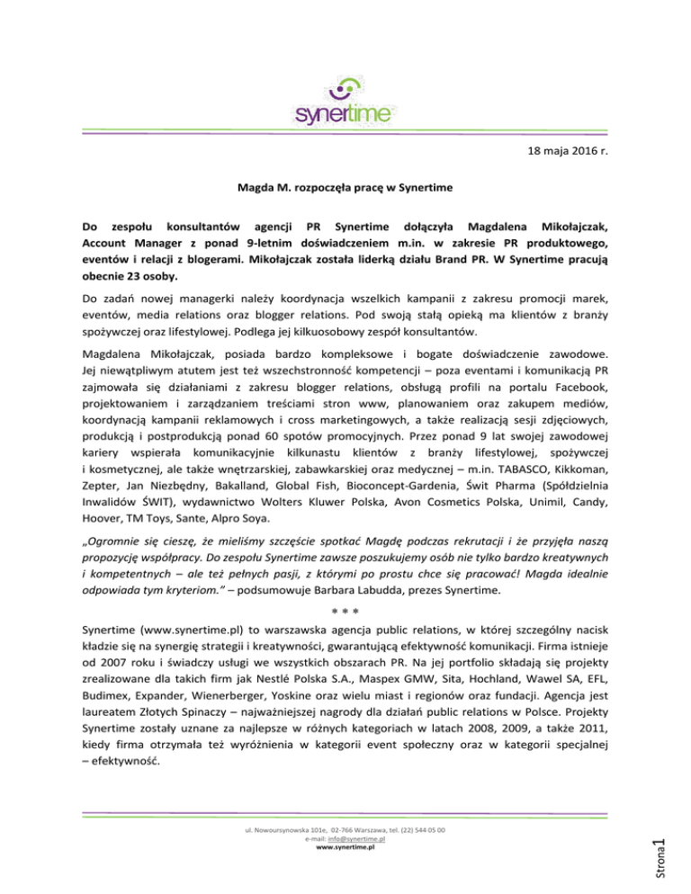 18 maja 2016 r. Magda M. rozpoczęła pracę w Synertime Do zespołu konsultantów agencji PR Synertime dołączyła Magdalena Mikołajczak, Account Manager z ponad 9-letnim doświadczeniem m.in. w zakresie PR produktowego, eventów i relacji z blogerami. Mikołajczak została liderką działu Brand PR. W Synertime pracują obecnie 23 osoby. Do zadań nowej managerki należy koordynacja wszelkich kampanii z zakresu promocji marek, eventów, media relations oraz blogger relations. Pod swoją stałą opieką ma klientów z branży spożywczej oraz lifestylowej. Podlega jej kilkuosobowy zespół konsultantów. Magdalena Mikołajczak, posiada bardzo kompleksowe i bogate doświadczenie zawodowe. Jej niewątpliwym atutem jest też wszechstronność kompetencji – poza eventami i komunikacją PR zajmowała się działaniami z zakresu blogger relations, obsługą profili na portalu Facebook, projektowaniem i zarządzaniem treściami stron www, planowaniem oraz zakupem mediów, koordynacją kampanii reklamowych i cross marketingowych, a także realizacją sesji zdjęciowych, produkcją i postprodukcją ponad 60 spotów promocyjnych. Przez ponad 9 lat swojej zawodowej kariery wspierała komunikacyjnie kilkunastu klientów z branży lifestylowej, spożywczej i kosmetycznej, ale także wnętrzarskiej, zabawkarskiej oraz medycznej – m.in. TABASCO, Kikkoman, Zepter, Jan Niezbędny, Bakalland, Global Fish, Bioconcept-Gardenia, Świt Pharma (Spółdzielnia Inwalidów ŚWIT), wydawnictwo Wolters Kluwer Polska, Avon Cosmetics Polska, Unimil, Candy, Hoover, TM Toys, Sante, Alpro Soya. „Ogromnie się cieszę, że mieliśmy szczęście spotkać Magdę podczas rekrutacji i że przyjęła naszą propozycję współpracy. Do zespołu Synertime zawsze poszukujemy osób nie tylko bardzo kreatywnych i kompetentnych – ale też pełnych pasji, z którymi po prostu chce się pracować! Magda idealnie odpowiada tym kryteriom.” – podsumowuje Barbara Labudda, prezes Synertime. *** ul. Nowoursynowska 101e, 02-766 Warszawa, tel. (22) 544 05 00 e-mail: [email protected] www.synertime.pl Strona1 Synertime (www.synertime.pl) to warszawska agencja public relations, w której szczególny nacisk kładzie się na synergię strategii i kreatywności, gwarantującą efektywność komunikacji. Firma istnieje od 2007 roku i świadczy usługi we wszystkich obszarach PR. Na jej portfolio składają się projekty zrealizowane dla takich firm jak Nestlé Polska S.A., Maspex GMW, Sita, Hochland, Wawel SA, EFL, Budimex, Expander, Wienerberger, Yoskine oraz wielu miast i regionów oraz fundacji. Agencja jest laureatem Złotych Spinaczy – najważniejszej nagrody dla działań public relations w Polsce. Projekty Synertime zostały uznane za najlepsze w różnych kategoriach w latach 2008, 2009, a także 2011, kiedy firma otrzymała też wyróżnienia w kategorii event społeczny oraz w kategorii specjalnej – efektywność.