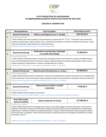 LISTA PROJEKTÓW DO GŁOSOWANIA W DĄBROWSKIM BUDŻECIE PARTYCYPACYJNYM NA ROK 2016 DZIELNICA: MANHATTAN Lp. 1. 2. Wnioskodawca: Tytuł projektu: Szacunkowy koszt: Ryszard Harańczyk Miejsca parkingowe przy ul. Długiej 268 250,00 zł Streszczenie projektu: 2. Projekt zakłada wykonanie parkingu i drogi dojazdowej o powierzchni ok. 775 m W kosztach ujęto wykonanie projektu budowlanego i wykonawczego wraz z uzyskaniem pozwolenia na budowę, odwodnienie parkingu i drogi, wykonanie parkingu i drogi dojazdowej z kostki betonowej. Lokalizacja: teren za blokami przy ul. Leśnej 5 (obok garaży) Ryszard Harańczyk Rozbudowa monitoringu wizyjnego na osiedlu Sikorskiego 50 000,00 zł Streszczenie projektu: Projekt zakłada rozbudowę systemu monitoringu wizyjnego poprzez montaż kamery na placu pomiędzy blokami przy ulicy Piłsudskiego 30,34,36. W kosztach projektu ujęto sporządzenie projektu budowlanego, roboty ziemne, roboty instalacyjne, zakup kamery, monitora, oprogramowania i licencji. Lokalizacja: Os. Manhattan – plac asfaltowy pomiędzy blokami nr 30,34,36 Ryszard Harańczyk 3. 4. Siłownia pod chmurką przy ul. Leśnej 90 000,00 zł Streszczenie projektu: Projekt zakłada budowę siłowni zewnętrznej: montaż ośmiu podwójnych urządzeń sportowych wraz z podbudową z kostki betonowej, montaż elementów małej architektury (ławki, kosze betonowe), nasadzenie drzewek ozdobnych. Lokalizacja:plac wewnętrzny osiedla pomiędzy blokami ul. Leśną i ul. Długą 3 Ryszard Harańczyk Wyposażenie osiedla w stojaki rowerowe 4 500,00 zł Streszczenie projektu: Projekt zakłada montaż stojaków rowerowych. Lokalizacja: teren przy Zespole Szkół nr 2 oraz na skwerze (przy planowanej lokalizacji siłowni) 5. Anna Morawska, Sylwia Grudniak Zielony skwerek na Leśnej 137 800,00 zł Streszczenie projektu: Projekt zakłada doposażenie istniejącego placu zabaw w karuzelę okrągłą i huśtawkę podwójną, montaż dwóch stojaków rowerowych, wykonanie nawierzchni bezpiecznej (piaskowej) pod nowo zabudowanymi urządzeniami zabawowymi, nasadzenie roślinności ozdobnej (drzewka i krzewy), montaż elementów małej architektury (ławki i betonowe kosze na odpady), montaż latarni parkowych, wymianę nawierzchni istniejących chodników na kostkę 2 betową (ok. 150 m ). Lokalizacja: teren wewnątrz osiedla pomiędzy blokami ul. Leśna 5 i Długa 7a Grzegorz Przewieźlik 6. 55 485,00 zł Streszczenie projektu: Projekt dotyczy zakupu sprzętu sportowego: m.in. piłki do koszykówki, siatkówki, piłki ręcznej, piłki nożnej, sprzęt do pływania, badmintona, zestaw do Unihokeja. Ze sprzętu korzystać będzie społeczność szkolna oraz mieszkańcy korzystający z zaplecza sportowego przy Zespole Szkół nr 2. Lokalizacja Zespół Szkół nr 2 Al. J. Piłsudskiego 24, boisko wielofunkcyjne „Orlik” Andrzej Skubera 7. Sportowa wyprawka Aktywny Manhattan 95 500,00 zł Streszczenie projektu: Projekt dotyczy doposażenie filii biblioteki poprzez: zakup książek i audiobooków , gier i zabawek edukacyjnych dla dzieci, sprzętu elektronicznego (m.in. rzutnik, ekran, uchwyt na projektor, aparat fotograficzny) wyposażenia (wieszaki mobilne, regały na audiobooki), organizację spotkań autorskich, warsztatów i projektów edukacyjnych Lokalizacja Filia nr 5 Miejskiej Biblioteki Publicznej Biuro Organizacji Pozarządowych i Aktywności Obywatelskiej, Urząd Miejski w Dąbrowie Górniczej, ul. Graniczna 21, Tel. 32 295-67-41, 32 295-96-38, mail: [email protected]