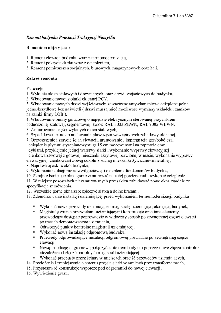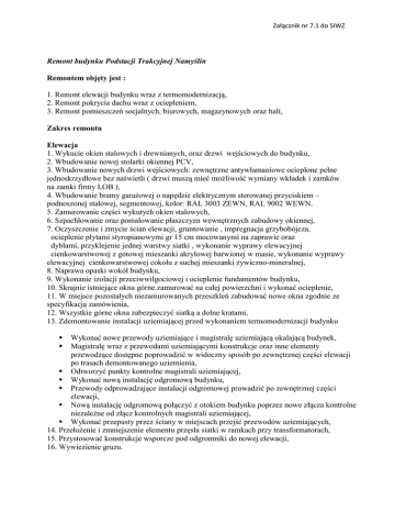 Załącznik nr 7.1 do SIWZ Remont budynku Podstacji Trakcyjnej Namyślin Remontem objęty jest : 1. Remont elewacji budynku wraz z termomodernizacją, 2. Remont pokrycia dachu wraz z ociepleniem, 3. Remont pomieszczeń socjalnych, biurowych, magazynowych oraz hali, Zakres remontu Elewacja 1. Wykucie okien stalowych i drewnianych, oraz drzwi wejściowych do budynku, 2. Wbudowanie nowej stolarki okiennej PCV, 3. Wbudowanie nowych drzwi wejściowych: zewnętrzne antywłamaniowe ocieplone pełne jednoskrzydłowe bez naświetli ( drzwi muszą mieć możliwość wymiany wkładek i zamków na zamki firmy LOB ), 4. Wbudowanie bramy garażowej o napędzie elektrycznym sterowanej przyciskiem – podnoszonej stalowej, segmentowej, kolor: RAL 3003 ZEWN, RAL 9002 WEWN. 5. Zamurowanie części wykutych okien stalowych, 6. Szpachlowanie oraz pomalowanie płaszczyzn wewnętrznych zabudowy okiennej, 7. Oczyszczenie i zmycie ścian elewacji, gruntowanie , impregnacja grzybobójcza, ocieplenie płytami styropianowymi gr 15 cm mocowanymi na zaprawie oraz dyblami, przyklejenie jednej warstwy siatki , wykonanie wyprawy elewacyjnej cienkowarstwowej z gotowej mieszanki akrylowej barwionej w masie, wykonanie wyprawy elewacyjnej cienkowarstwowej cokołu z suchej mieszanki żywiczno-mineralnej, 8. Naprawa opaski wokół budynku, 9. Wykonanie izolacji przeciwwilgociowej i ocieplenie fundamentów budynku, 10. Skrajnie istniejące okna górne zamurować na całej powierzchni i wykonać ocieplenie, 11. W miejsce pozostałych niezamurowanych przeszkleń zabudować nowe okna zgodnie ze specyfikacją zamówienia, 12. Wszystkie górne okna zabezpieczyć siatką a dolne kratami, 13. Zdemontowanie instalacji uziemiającej przed wykonaniem termomodernizacji budynku Wykonać nowe przewody uziemiające i magistralę uziemiającą okalającą budynek, Magistralę wraz z przewodami uziemiającymi konstrukcje oraz inne elementy przewodzące dostępne poprowadzić w widoczny sposób po zewnętrznej części elewacji po trasach demontowanego uziemienia, Odtworzyć punkty kontrolne magistrali uziemiającej, Wykonać nową instalację odgromową budynku, Przewody odprowadzające instalacji odgromowej prowadzić po zewnętrznej części elewacji, Nową instalację odgromową połączyć z otokiem budynku poprzez nowe złącza kontrolne niezależne od złącz kontrolnych magistrali uziemiającej, Wykonać przepusty przez ściany w miejscach przejść przewodów uziemiających, 14. Przełożenie i zmniejszenie elementu przęsła siatki w ramkach przy transformatorach, 15. Przystosować konstrukcje wsporcze pod odgromniki do nowej elewacji, 16. Wywiezienie gruzu. Załącznik nr 7.1 do SIWZ Wymagania dotyczące materiałów: System ocieplenia nierozprzestrzeniający ognia (NRO), Przekrycie dachu nierozprzestrzeniające ognia (NRO) klasyfikowane jako BROOF(t1), Materiały zastosowane do ocieplenia ścian powinny posiadać klasę reakcji na ogień co najmniej E. Nierozprzestrzenianie ognia oraz klasa reakcji na ogień powinny być potwierdzone odpowiednim dokumentem wydanym przez Instytut Techniki Budowlanej. dach 1. Demontaż przewodów instalacji odgromowej oraz montaż nowej instalacji po robotach dekarskich 2. Rozebranie rynien i rur spadowych , rozebranie obróbek blacharskich 3. Usunięcie lub podklejenie luźnych elementów pokrycia dachu, nacięcie i podklejenie pęcherzy, wykonanie wklejek w nierównościach pokrycia dachu. 4. Krycie dachu papą termozgrzewalną z ociepleniem płytą styropianową jednostronnie oklejoną papą podkładową 5. Wykonanie obróbek blacharskich , zamontowanie rynien i rur spadowych 6. Pokrycie dachu wykonać z warstwy styropapy gr. 5 cm wraz z systemową papą termozgrzewalną płyty warstwowe styropapy gr. 15 cm wykonać z płyt styropianowych EPS 100 jednostronnie oklejonych papa podkładową typu PV 60 7. Zamontować kominki wentylacyjne (1 szt. na 40 do 60 m2 powierzchni dachu) 8. Do mocowania termoizolacji ( płyt styropapy) zastosować łączniki składające się z teleskopu, wkrętu oraz kołka rozporowego 9. Papa podkładowa – osnowa z włókniny poliestrowej wzmocniona 180 g/m2 zawartość asfaltu modyfikowanego SBS 2000 g/m2 gr. 3 mm , wytrzymałość na rozciąganie nie mniej niż 600/400 N/50 ( wzdłuż/poprzek) 10. Papa nawierzchniowa asfaltowa zgrzewalna wierzchniego krycia modyfikowana SBS na osnowie włókniny poliestrowej , gramatura osnowy 250 g/m2 , zawartość asfaltu modyfikowanego elastomerem SBS min. 4000 b?m2 , maksymalna siła rozciągu na pasku szer. 5 cm wzdłuż/w poprzek min. 1000/800 N , wzdłużnie przy maksymalnej sile rozciągu wzdłuż/ w poprzek 40/40 % , giętkość w obniżonych temperaturach – 25 º C , grubość 5,6 ± 2 mm c. roboty remontowe wewnętrzne pomieszczeń socjalnych , biurowych , magazynków oraz hali 1. Demontaż obudów z elementów zawierających azbest w sposób niepowodujący pylenia z zapakowaniem oraz wywiezieniem do utylizacji Prace w zakresie demontażu elementów zawierających azbest powinny być wykonane zgodnie z wymaganiami określonymi przez: Rozporządzenie Ministra Gospodarki, Pracy i Polityki Społecznej z dnia 2 kwietnia 2004r. w sprawie sposobów i warunków bezpiecznego użytkowania i usuwania wyrobów zawierających azbest, Rozporządzenie Ministra Gospodarki i Pracy z dnia 14 października 2005r. w sprawie zasad bezpieczeństwa i higieny pracy przy zabezpieczaniu i usuwaniu wyrobów zawierających azbest oraz programu szkolenia w zakresie bezpieczeństwa użytkowania takich wyrobów. 2. Zabudowanie obudów elementów po rozebraniu płyt eternitowych systemem GR 3. Malowanie ścian i sufitów farbą emulsyjną 4. Malowanie lamperii 5. Malowanie ścian, sufitu farbą emulsyjną oraz konstrukcji stalowej hali 6. Zakup grzejników: 8 szt o mocy 2000 W Dimplex , 4 szt. o mocy 1000W Dimplex 7.Wymiana oświetlenia wewnętrznego.