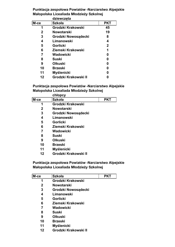 Punktacja zespołowa Powiatów -Narciarstwo Alpejskie Małopolska Licealiada Młodzieży Szkolnej dziewczęta M-ce Szkoła PKT 1 Grodzki Krakowski 45 2 Nowotarski 19 3 Grodzki Nowosądecki 8 4 Limanowski 4 5 Gorlicki 2 6 Ziemski Krakowski 1 7 Wadowicki 0 8 Suski 0 9 Olkuski 0 10 Brzeski 0 11 Myślenicki 0 12 Grodzki Krakowski II 0 Punktacja zespołowa Powiatów -Narciarstwo Alpejskie Małopolska Licealiada Młodzieży Szkolnej chłopcy M-ce Szkoła PKT 1 Grodzki Krakowski 2 Nowotarski 3 Grodzki Nowosądecki 4 Limanowski 5 Gorlicki 6 Ziemski Krakowski 7 Wadowicki 8 Suski 9 Olkuski 10 Brzeski 11 Myślenicki 12 Grodzki Krakowski II Punktacja zespołowa Powiatów -Narciarstwo Alpejskie Małopolska Licealiada Młodzieży Szkolnej M-ce 1 2 3 4 5 6 7 8 9 10 11 12 Szkoła Grodzki Krakowski Nowotarski Grodzki Nowosądecki Limanowski Gorlicki Ziemski Krakowski Wadowicki Suski Olkuski Brzeski Myślenicki Grodzki Krakowski II PKT