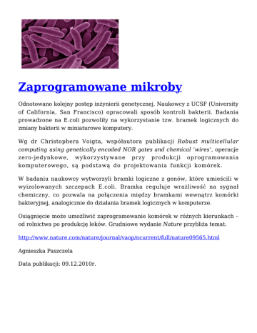 Zaprogramowane mikroby Odnotowano kolejny postęp inżynierii genetycznej. Naukowcy z UCSF (University of California, San Francisco) opracowali sposób kontroli bakterii. Badania prowadzone na E.coli pozwoliły na wykorzystanie tzw. bramek logicznych do zmiany bakterii w miniaturowe komputery. Wg dr Christophera Voigta, współautora publikacji Robust multicellular computing using genetically encoded NOR gates and chemical ‘wires’, operacje zero-jedynkowe, wykorzystywane przy produkcji oprogramowania komputerowego, są podstawą do projektowania funkcji komórek. W badaniu naukowcy wytworzyli bramki logiczne z genów, które umieścili w wyizolowanych szczepach E.coli. Bramka reguluje wrażliwość na sygnał chemiczny, co pozwala na połączenia między bramkami wewnątrz komórki bakteryjnej, analogicznie do działania bramek logicznych w komputerze. Osiągnięcie może umożliwić zaprogramowanie komórek w różnych kierunkach – od rolnictwa po produkcję leków. Grudniowe wydanie Nature przybliża temat: http://www.nature.com/nature/journal/vaop/ncurrent/full/nature09565.html Agnieszka Paszczela Data publikacji: 09.12.2010r.