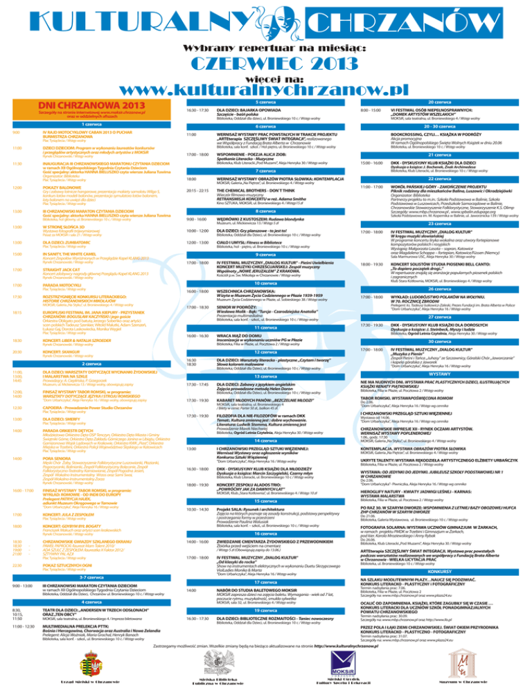 KULTURALNY CHRZANÓW Wybrany repertuar na miesi¹c: CZERWIEC 2013 wiêcej na: www.kulturalnychrzanow.pl 5 czerwca DNI CHRZANOWA 2013 16:30 - 17:30 Szczegó³y na stronie internetowej www.moksir.chrzanow.pl oraz w oddzielnych afiszach DLA DZIECI: BAJARKA OPOWIADA Szczêœcie - baœñ polska 11:00 Plac Tysi¹clecia / Wstêp wolny DZIECI DZIECIOM: Program w wykonaniu laureatów konkursów i przegl¹dów artystycznych oraz m³odych artystów z MOKSiR Rynek Chrzanowski / Wstêp wolny 11:30 INAUGURACJA III CHRZANOWSKIEGO MARATONU CZYTANIA DZIECIOM w ramach XII Ogólnopolskiego Tygodnia Czytania Dzieciom Goœæ specjalny: aktorka HANNA BIELUSZKO czyta wiersze Juliana Tuwima Organizator: Biblioteka Plac Tysi¹clecia / Wstêp wolny 12:00 WERNISA¯ WYSTAWY PRAC POWSTA£YCH W TRAKCIE PROJEKTU „ARTEterapia SZCZÊŒLIWY ŒWIAT INTEGRACJI”, realizowanego we Wspó³pracy z Fundacj¹ Brata Alberta w Chrzanowie BOOKCROSSING, CZYLI… KSI¥¯KA W PODRÓ¯Y Akcja promocyjna W ramach Ogólnopolskiego Œwiêta Wolnych Ksi¹¿ek w dniu 20.06 Biblioteka, ul. Broniewskiego 10 c / Wstêp wolny 21 czerwca WSPOMNIENIE - POEZJA ALICJI ZIOB: Spotkanie Literacko - Muzyczne Biblioteka, Klub Literacki „Pod Muzami”, Aleja Henryka 30 / Wstêp wolny 15:00 - 16:00 7 czerwca 18:00 20:15 - 22:15 22 czerwca WERNISA¯ WYSTAWY OBRAZÓW PIOTRA S£OWIKA: KONTEMPLACJA III CHRZANOWSKI MARATON CZYTANIA DZIECIOM Goœæ specjalny: aktorka HANNA BIELUSZKO czyta wiersze Juliana Tuwima Biblioteka, hol g³ówny, ul. Broniewskiego 10 c / Wstêp wolny 11:00 - 17:00 THE CHEMICAL BROTHERS - DON`T THINK Wieczór filmowo-muzyczny RETRANSMISJA KONCERTU w re¿. Adama Smitha Kino SZTUKA, MOKSiR, ul. Broniewskiego 4 / Wstêp15 z³ Plac Tysi¹clecia / Wstêp wolny 8 czerwca 9:00 - 16:00 W STRONÊ S£OÑCA 3D Wystawa fotografii trójwymiarowej 10:00 - 12:00 13:00 DLA DZIECI: ZUMBATOMIC 12:00 - 13:00 Plac Tysi¹clecia / Wstêp wolny 15:00 DLA DZIECI: Gry planszowe - to jest to! CIA£O I UMYS£: Fitness w Bibliotece 9 czerwca Rynek Chrzanowski / Wstêp wolny 17:00 - 18:00 STRAIGHT JACK CAT Koncert zdobywcy nagrody g³ównej Przegl¹du Kapel KLANG 2013 IV FESTIWAL MUZYCZNY „DIALOG KULTUR” - Pieœni Uwielbienia KONCERT MUZYKI CHRZEŒCIJAÑSKEJ: Zespó³ muzyczny Wspólnoty „NOWE JERUZALEM” Z KRAKOWA. Plac Tysi¹clecia / Wstêp wolny 17:30 16:00 - 18:00 ROZSTRZYGNIÊCIE KONKURSU LITERACKIEGO: HISTORIE CHRZANOWSKICH MIKO£AJÓW 17:00 - 18:30 EUROPEJSKI FESTIWAL IM. JANA KIEPURY - PRZYSTANEK CHRZANÓW: BOGUS£AW KACZYÑSKI i jego goœcie Orkiestra Obligato pod batut¹ Jerzego Sobeñko oraz artyœci scen polskich Tadeusz Szenkier, Witold Malutki, Adam Szerszeñ, £ukasz Gaj, Dorota Laskowiecka, Monika Wêgiel 18:30 26 czerwca 17:00 - 18:00 16:00 - 16:30 KONCERT: LIBER & NATALIA SZROEDER 27 czerwca 17:30 - 19:30 30 czerwca Biblioteka, Filia w P³azie, ul. Pocztowa 2 / Wstêp wolny 17:00 - 18:00 12 czerwca Rynek Chrzanowski / Wstêp wolny 16:30 18:30 2 czerwca DLA DZIECI: Warsztaty literacko - plastyczne „Czytam i tworzê” S³owa kolorem malowane DLA DZIECI: WARSZTATY DOTYCZ¥CE WYCINANKI ¯YDOWSKIEJ I MALARSTWA NA SZKLE Prowadz¹cy: A. Ciepliñska, P. Grzegorzek Muzeum, ul. Mickiewicza 13 / Wstêp wolny, obowi¹zuj¹ zapisy 12:00, 14:00 FINISA¯ WYSTAWY TABOR ROMSKI, w programie: WARSZTATY DOTYCZ¥CE JÊZYKA I STROJU ROMSKIEGO 17:30 - 19:30 Plac Tysi¹clecia / Wstêp wolny 17:30 - 19:30 DLA DZIECI: SMERFY Plac Tysi¹clecia / Wstêp wolny 14:00 PARADA ORKIESTR DÊTYCH M³odzie¿owa Orkiestra Dêta OSP Tenczyn, Orkiestra Dêta Miasta i Gminy Œwi¹tniki Górne, Orkiestra Dêta Zak³adu Górniczego Janina w Libi¹¿u, Orkiestra Garnizonowa Wojsk L¹dowych w Krakowie, Orkiestra KWK „Piast”, Orkiestra Miejska w Trzebini, Orkiestra Policji Województwa Œl¹skiego w Katowicach Plac Tysi¹clecia / Wstêp wolny 14:00 PORA SENIORA Mêski Chór ¯aby, Stowarzyszenie Folklorystyczne Luszowianki, P³azianki, Pogorzycanki, Balinianki, Zespó³ Folklorystyczny Bolêcanie, Zespó³ Folklorystyczno-Teatralny Karniowianie, Zespó³ Pogodna Jesieñ, Zespó³ Wokalno Instrumentalny Wrzos oraz Sami Swoi, Zespó³ Wokalno-Instrumentalny Zorza Rynek Chrzanowski / Wstêp wolny 16:00 - 17:00 16:30 - 18:00 DKK - DYSKUSYJNY KLUB KSI¥¯KI DLA M£ODZIE¯Y Dyskusja o ksi¹¿ce: Marcin Szczygielski, Czarny m³yn 10:30 - 14:30 CHRZANOWSKIE GWIAZDY SZKLANEGO EKRANU PAWE£ PAPROCKI /laureat Mam Talent 2010/ ADA SZULC Z ZESPO£EM /laureatka X Faktor 2012/ SZTYWNY PAL AZJI 14:00 - 16:00 Projekt SALA: Rysunek i architektura Zajêcia na których poznaje siê zasady konstrukcji, podstawy perspektywy i postrzegania formy w przestrzeni Prowadzenie Paulina Walusiak ZWIEDZANIE CMENTARZA ¯YDOWSKIEGO Z PRZEWODNIKIEM Zbiórka przed wejœciem na cmentarz / Wstêp 5 z³ (Obowi¹zuj¹ zapisy do 13.06.) 17:00 - 18:00 Plac Tysi¹clecia / Wstêp wolny POKAZ SZTUCZNYCH OGNI Plac Tysi¹clecia / Wstêp wolny IV FESTIWAL MUZYCZNY „DIALOG KULTUR” „Od klasyki do rocka” Show na instrumentach elektrycznych w wykonaniu Duetu Skrzypcowego ViolLadies Monika & Marta PO RAZ 30. W SZARYM DWORZE: WSPOMNIENIA Z LETNIEJ BAZY OBOZOWEJ HUFCA ZHP CHRZANÓW W SZARYM DWORZE Do 21.06. Biblioteka, Galeria Wystawowa, ul. Broniewskiego 10 c / Wstêp wolny FOTOGRAFIA SOLARNA: WYSTAWA UCZNIÓW GIMNAZJUM W ¯ARKACH, w ramach projektu PMDK w Trzebini i Gimnazjum w ¯arkach, pod kier. Karola Mroziewskiego i Anny Rybak Do 26.06. Biblioteka, Klub Literacki „Pod Muzami”, Aleja Henryka 30 / Wstêp wolny ARTEterapia SZCZÊŒLIWY ŒWIAT INTEGRACJI. Wystawa prac powsta³ych podczas warsztatów realizowanych we wspó³pracy z Fundacj¹ Brata Alberta w Chrzanowie - WIELKA LICYTACJA PRAC Biblioteka, ul. Broniewskiego 10 c / Wstêp wolny KONKURSY "Dom Urbañczyka", Aleja Henryka 16 / Wstêp wolny NA SZLAKU MODLITEWNYM P£AZY…NAUCZ SIÊ PODZIWIAÆ. KONKURS LITERACKO - PLASTYCZNY i FOTOGRAFICZNY 17 czerwca III CHRZANOWSKI MARATON CZYTANIA DZIECIOM w ramach XII Ogólnopolskiego Tygodnia Czytania Dzieciom 14:00 4 c
