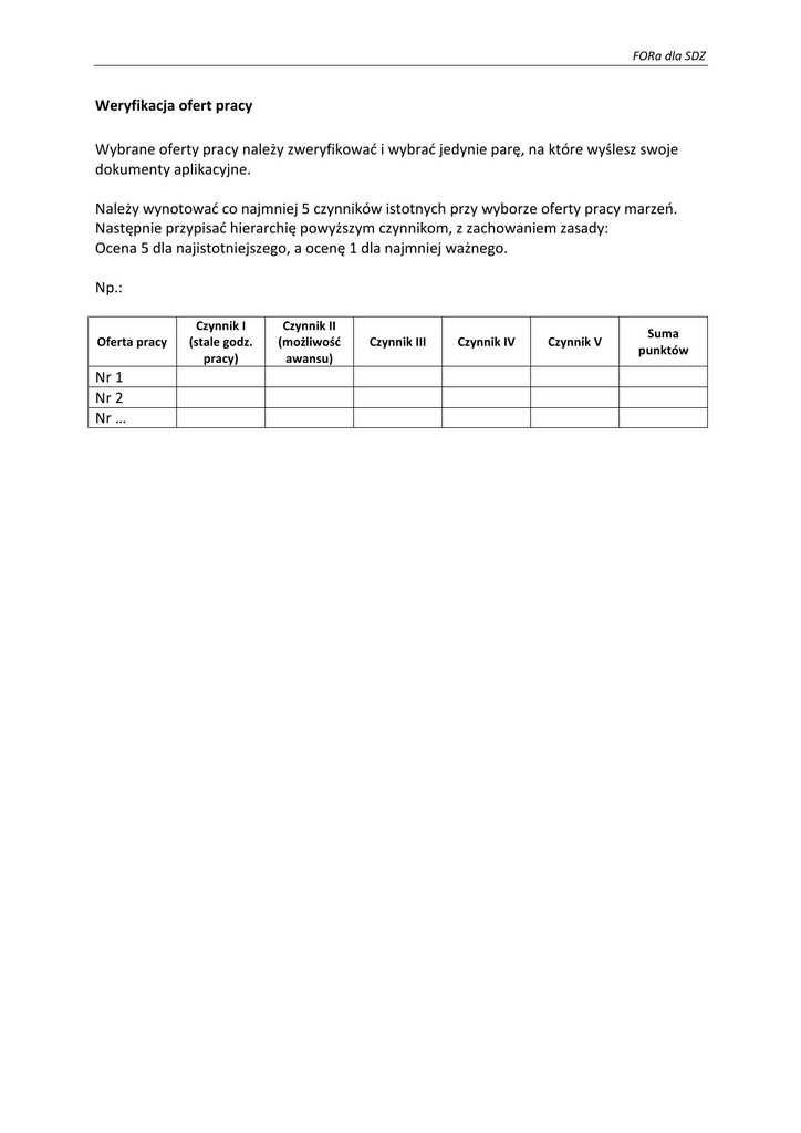 FORa dla SDZ Weryfikacja ofert pracy Wybrane oferty pracy należy zweryfikować i wybrać jedynie parę, na które wyślesz swoje dokumenty aplikacyjne. Należy wynotować co najmniej 5 czynników istotnych przy wyborze oferty pracy marzeń. Następnie przypisać hierarchię powyższym czynnikom, z zachowaniem zasady: Ocena 5 dla najistotniejszego, a ocenę 1 dla najmniej ważnego. Np.: Oferta pracy Nr 1 Nr 2 Nr … Czynnik I (stale godz. pracy) Czynnik II (możliwość awansu) Czynnik III Czynnik IV Czynnik V Suma punktów