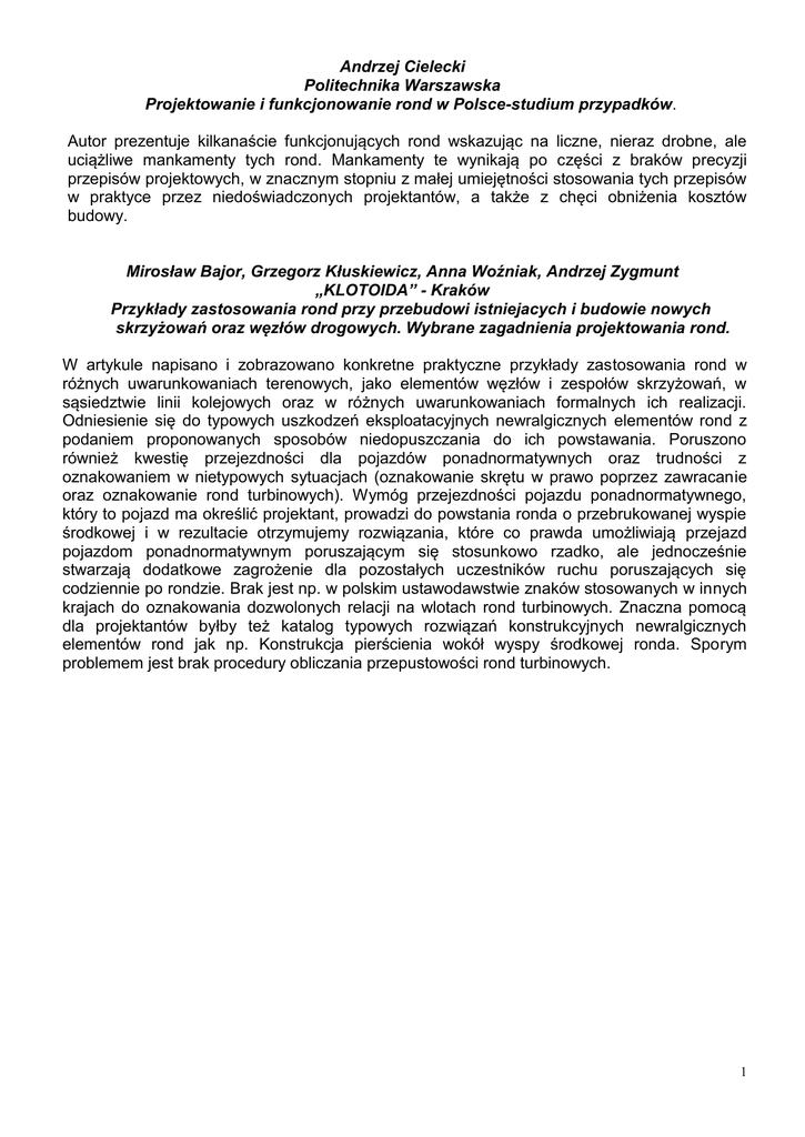 Andrzej Cielecki Politechnika Warszawska Projektowanie i funkcjonowanie rond w Polsce-studium przypadków. Autor prezentuje kilkanaście funkcjonujących rond wskazując na liczne, nieraz drobne, ale uciążliwe mankamenty tych rond. Mankamenty te wynikają po części z braków precyzji przepisów projektowych, w znacznym stopniu z małej umiejętności stosowania tych przepisów w praktyce przez niedoświadczonych projektantów, a także z chęci obniżenia kosztów budowy. Mirosław Bajor, Grzegorz Kłuskiewicz, Anna Woźniak, Andrzej Zygmunt „KLOTOIDA” - Kraków Przykłady zastosowania rond przy przebudowi istniejacych i budowie nowych skrzyżowań oraz węzłów drogowych. Wybrane zagadnienia projektowania rond. W artykule napisano i zobrazowano konkretne praktyczne przykłady zastosowania rond w różnych uwarunkowaniach terenowych, jako elementów węzłów i zespołów skrzyżowań, w sąsiedztwie linii kolejowych oraz w różnych uwarunkowaniach formalnych ich realizacji. Odniesienie się do typowych uszkodzeń eksploatacyjnych newralgicznych elementów rond z podaniem proponowanych sposobów niedopuszczania do ich powstawania. Poruszono również kwestię przejezdności dla pojazdów ponadnormatywnych oraz trudności z oznakowaniem w nietypowych sytuacjach (oznakowanie skrętu w prawo poprzez zawracanie oraz oznakowanie rond turbinowych). Wymóg przejezdności pojazdu ponadnormatywnego, który to pojazd ma określić projektant, prowadzi do powstania ronda o przebrukowanej wyspie środkowej i w rezultacie otrzymujemy rozwiązania, które co prawda umożliwiają przejazd pojazdom ponadnormatywnym poruszającym się stosunkowo rzadko, ale jednocześnie stwarzają dodatkowe zagrożenie dla pozostałych uczestników ruchu poruszających się codziennie po rondzie. Brak jest np. w polskim ustawodawstwie znaków stosowanych w innych krajach do oznakowania dozwolonych relacji na wlotach rond turbinowych. Znaczna pomocą dla projektantów byłby też katalog typowych rozwiązań konstrukcyjnych newralgicznych elementów rond jak np. Konstrukcja pierścienia wokół wyspy środkowej ronda. Sporym problemem jest brak procedury obliczania przepustowości rond turbinowych. 1 2 Jan Sontowski Autorska Pracownia Projektowa – Koszalin Projektowanie małych rond dwupasowych. Artykuł prezentuje ronda dwupasowe, na których przejazd w relacji „na wprost” przez rondo odbywa się dwoma pasami, skręt „w prawo” jest możliwy tylko z pasa prawego, a skręt „w lewo” tylko z pasa lewego na wlocie (wewnętrznego na rondzie). Rozwiązanie to eliminuje wady ronda tradycyjnego, na którym występują częste kolizje przy opuszczeniu ronda. 3 4 Stanisław Majer Zachodniopomorski Uniwersytet Technologiczny w Szczecinie Analiza zdarzeń drogowych na wybranych rondach w Gorzowie Wielkopolskim Przedstawiono zestawienie zdarzeń drogowych na 14 rondach w latach 2007-2009, z których większość stanowią ronda średnie dwupasowe. Wykazano, że zwiększona liczba kolizji i wypadków na niektórych rondach jest wynikiem nieprawidłowego ukształtowania ich geometrii. W celu oceny poprawności ukształtowania geometrii analizowanych skrzyżowań z uwagi na pożądaną redukcję prędkości zaproponowano wprowadzenie współczynnika wydłużenia przejazdu stanowiącego stosunek długości drogi przy przejeździe przez rondo do długości siecznej. We wnioskach autor stwierdza, że kilka z analizowanych skrzyżowań nie ma geometrii charakterystycznej dla rond,a niektóre jezdnie przechodzą przez skrzyżowanie bez jakiegokolwiek odgięcia toru jazdy. Są to typowe skrzyżowania z wyspą centralną przewidziane do sterowania ruchem za pomocą sygnalizacji świetlnej. Analiza zdarzeń pozwoliła stwierdzić, że nieprawidłowe ukształtowanie geometrii skrzyżowań przy ich funkcjonowaniu jako ronda prowadzi do zwiększenia zagrożeń bezpieczeństwa ruchu. Robert Jurczak Zachodniopomorski Uniwersytet Technologiczny w Szczecinie Przepustowość i warunki ruchu na rondach dwupasowych w Szczecinie 5 W artykule przedstawiono obliczenie przepustowości i ocenę warunków ruchu na trzech rondach dwupasowych zlokalizowanych w Szczecinie. W pierwszej części artykułu omówiono układ ulic uwzględniając lokalizację i charakterystykę rond. Pomiary wykonano techniką cyfrową. Określono strukturę rodzajową i kierunkową w szczycie porannym i południowym. Obliczono przepustowości rond i poszczególnych wlotów. 6