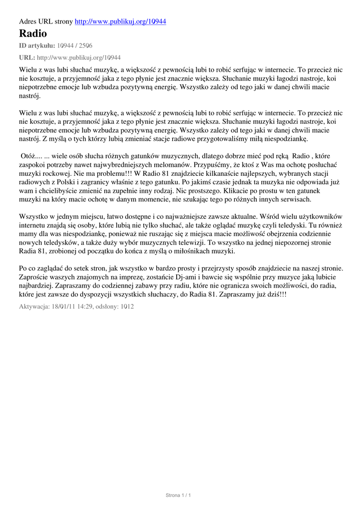 Adres URL strony http://www.publikuj.org/10944 Radio ID artykułu: 10944 / 2506 URL: http://www.publikuj.org/10944 Wielu z was lubi słuchać muzykę, a większość z pewnością lubi to robić serfując w internecie. To przecież nic nie kosztuje, a przyjemność jaka z tego płynie jest znacznie większa. Słuchanie muzyki łagodzi nastroje, koi niepotrzebne emocje lub wzbudza pozytywną energię. Wszystko zależy od tego jaki w danej chwili macie nastrój. Wielu z was lubi słuchać muzykę, a większość z pewnością lubi to robić serfując w internecie. To przecież nic nie kosztuje, a przyjemność jaka z tego płynie jest znacznie większa. Słuchanie muzyki łagodzi nastroje, koi niepotrzebne emocje lub wzbudza pozytywną energię. Wszystko zależy od tego jaki w danej chwili macie nastrój. Z myślą o tych którzy lubią zmieniać stacje radiowe przygotowaliśmy miłą niespodziankę. Otóż.... ... wiele osób słucha różnych gatunków muzycznych, dlatego dobrze mieć pod ręką Radio , które zaspokoi potrzeby nawet najwybredniejszych melomanów. Przypuśćmy, że ktoś z Was ma ochotę posłuchać muzyki rockowej. Nie ma problemu!!! W Radio 81 znajdziecie kilkanaście najlepszych, wybranych stacji radiowych z Polski i zagranicy właśnie z tego gatunku. Po jakimś czasie jednak ta muzyka nie odpowiada już wam i chcielibyście zmienić na zupełnie inny rodzaj. Nic prostszego. Klikacie po prostu w ten gatunek muzyki na który macie ochotę w danym momencie, nie szukając tego po różnych innych serwisach. Wszystko w jednym miejscu, łatwo dostępne i co najważniejsze zawsze aktualne. Wśród wielu użytkowników internetu znajdą się osoby, które lubią nie tylko słuchać, ale także oglądać muzykę czyli teledyski. Tu również mamy dla was niespodziankę, ponieważ nie ruszając się z miejsca macie możliwość obejrzenia codziennie nowych teledysków, a także duży wybór muzycznych telewizji. To wszystko na jednej niepozornej stronie Radia 81, zrobionej od początku do końca z myślą o miłośnikach muzyki. Po co zaglądać do setek stron, jak wszystko w bardzo prosty i przejrzysty sposób znajdziecie na naszej stronie. Zaproście waszych znajomych na imprezę, zostańcie Dj-ami i bawcie się wspólnie przy muzyce jaką lubicie najbardziej. Zapraszamy do codziennej zabawy przy radiu, które nie ogranicza swoich możliwości, do radia, które jest zawsze do dyspozycji wszystkich słuchaczy, do Radia 81. Zapraszamy już dziś!!! Aktywacja: 18/01/11 14:29, odsłony: 1012 Strona 1 / 1