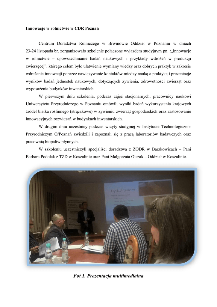 Innowacje w rolnictwie w CDR Poznań Centrum Doradztwa Rolniczego w Brwinowie Oddział w Poznaniu w dniach 23-24 listopada br. zorganizowało szkolenie połączone wyjazdem studyjnym pn. :„Innowacje w rolnictwie – upowszechnianie badań naukowych i przykłady wdrożeń w produkcji zwierzęcej”, którego celem było ułatwienie wymiany wiedzy oraz dobrych praktyk w zakresie wdrażania innowacji poprzez nawiązywanie kontaktów miedzy nauką a praktyką i prezentacje wyników badań jednostek naukowych, dotyczących żywienia, zdrowotności zwierząt oraz wyposażenia budynków inwentarskich. W pierwszym dniu szkolenia, podczas zajęć stacjonarnych, pracownicy naukowi Uniwersytetu Przyrodniczego w Poznaniu omówili wyniki badań wykorzystania krajowych źródeł białka roślinnego (strączkowe) w żywieniu zwierząt gospodarskich oraz zastosowanie innowacyjnych rozwiązań w budynkach inwentarskich. W drugim dniu uczestnicy podczas wizyty studyjnej w Instytucie TechnologicznoPrzyrodniczym O/Poznań zwiedzili i zapoznali się z pracą laboratoriów badawczych oraz pracownią biopaliw płynnych. W szkoleniu uczestniczyli specjaliści doradztwa z ZODR w Barzkowicach – Pani Barbara Podolak z TZD w Koszalinie oraz Pani Małgorzata Olszak – Oddział w Koszalinie. Fot.1. Prezentacja multimedialna Fot.2. Uczestnicy szkolenia Fot.3. Uczestnicy szkolenia podczas wyjazdu studyjnego Fot.4. Instytut Technologiczno-Przyrodniczym O/Poznań Fot.5. Instytut Technologiczno-Przyrodniczym O/Poznań