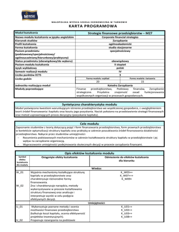 MAŁOP OLSKA WYŻSZ A SZ KOŁA E KONOMICZNA W TARN OW IE KARTA PROGRAMOWA Moduł kształcenia Strategie finansowe przedsiębiorstw – M27 Nazwa modułu kształcenia w języku angielskim Kierunek studiów Profil kształcenia Forma kształcenia Poziom przedmiotu (podstawowy/specjalnościowy/ ogólnouczelniany/kierunkowy/praktyczny) Status przedmiotu (obowiązkowy/do wyboru) Poziom modułu kształcenia Język wykładowy Semestr realizacji modułu Liczba punktów ECTS Liczba godzin Jednostka realizująca moduł Moduły poprzedzające Corporate financial strategies Zarządzanie ogólnoakademicki studia stacjonarne specjalnościowy obowiązkowy II stopień polski IV 3 Forma modułu: wykład Forma modułu: ćwiczenia 20 15 Katedra Zarządzania Finanse przedsiębiorstwa, Podstawy finansów, Zarządzanie strategiczne. Przydatna znajomość zasad funkcjonowania współczesnych organizacji w procesach gospodarczych. Syntetyczna charakterystyka modułu Moduł poświęcono kwestiom warunkującym istnienie przedsiębiorstwa we współczesnej gospodarce, z uwzględnieniem teorii źródeł finansowania i kapitału oraz kosztu jego pozyskania. Nacisk położono na przedstawienie strategii finansowych oraz metod usprawniających proces decyzyjny (pozyskanie kapitału). Cele modułu Zapoznanie studentów z teorią dotyczącą pojęć i form finansowania przedsiębiorstwa, form prawnych przedsiębiorstwa w kontekście optymalizacji struktury kapitału oraz praktyką w zakresie poszukiwania źródeł finansowania działalności przedsiębiorstwa. Nabycie przez studentów umiejętności: Rozumienia podstawowych mechanizmów w zakresie kształtowania struktury kapitału w przedsiębiorstwie i jej wpływ na zarządzanie organizacją. Wypracowanie umiejętności podejmowania skutecznych decyzji w procesie zarządzania finansami. Opis efektów kształcenia modułu Symbol efektu kształcenia dla modułu Osiągnięte efekty kształcenia Odniesienie do efektów kształcenia dla kierunku Wiedza: W_01 W_02 Wyjaśnia mechanizmy kształtujące strukturę kapitału w przedsiębiorstwie oraz charakteryzuje różnorodne formy finansowania. Zna i charakteryzuje narzędzia, metody wykorzystywane w procesie kształtowania struktury finansowej oraz analizuje i interpretuje wyniki w celu podjęcia efektywnych decyzji. K_W03++ K_W07+++ K_W09+ Umiejętności: U_01 U_02 Wykorzystuje poznane metody i ocenia możliwości finansowe przedsiębiorstwa (kalkuluje koszt kapitału, ocenia efektywność projektów inwestycyjnych). Proponuje rozwiązania na podstawie K_U01++ K_U02++ K_U03++ K_U08++ U_03 K_01 dokonanych analiz i interpretacji dla przypadków sytuacyjnych (wybór wariantów finansowania). Rozstrzyga wątpliwości związane z efektywnością zainwestowanego kapitału. Kompetencje społeczne: Efektywnie organizuje pracę własną, wykorzystując pragmatyczny sposób rozumowania i działania. K_K03++ Treści kształcenia modułu 1. 2. 3. 4. 5. 6. 7. Forma modułu: wykład Wprowadzenie do przedmiotu: Rozwój przedsiębiorstwa a zapotrzebowanie na kapitał; Forma prawna przedsiębiorstwa a uzyskiwanie kapitału własnego; Czynniki wpływające na strukturę kapitału poszczególnych przedsiębiorstw: Strategie finansowania aktywów obrotowych; Koszt i struktura kapitału; Planowanie finansowe w przedsiębiorstwie. Kryteria oceny strategii finansowych przedsiębiorstwa. Analiza ryzyka w strategiach przedsiębiorstwa. Problematyka efektywności przedsięwzięć inwestycyjnych. Narzędzia zarządzania wartością przedsiębiorstwa: koncepcja EVA. Literatura podstawowa 1. 2. 3. Literatura uzupełniająca 4. 5. 1. 2. 3. Forma modułu: ćwiczenia Wewnętrzne i zewnętrzne źródła finansowania przedsiębiorstwa. 2. Źródła finansowania a źródła kapitału. 3. Kapitał zainwestowany: Proces inwestowania kapitału w przedsiębiorstwie. Metody szacowania kosztu kapitału. Metody szacowania opłacalności zainwestowanych kapitałów (metody proste i dyskontowe). Zastosowanie dźwigni finansowej w wyborze wariantu finansowania. 1. Duliniec A. 2011. Finansowanie przedsiębiorstwa. Strategie i instrumenty. Warszawa: Polskie Wydawnictwo Ekonomiczne; Michalski G. 2009. Strategie finansowe przedsiębiorstw. Gdańsk: Wyd. ODDK; Czekaj J., Dresler Z. 2005. Zarządzanie finansami przedsiębiorstw. Podstawy teorii. Warszawa: Wyd. Naukowe PWN; Bień W. 2008. Zarządzanie finansami przedsiębiorstwa. Warszawa: Wyd. Difin; Jajuga K., Jajuga T. 2006. Inwestycje. Warszawa: Wyd. Naukowe PWN; Grzywacz J. 2008. Kapitał w przedsiębiorstwie i jego struktura. Warszawa: Oficyna Wydawnicza SGH; Cicirko T., Russem P. 2008. Prawno – ekonomiczne aspekty leasingu. Warszawa: Oficyna Wydawnicza SGH; Jaworski J. 2010. Teoria i praktyka zarządzania finansami przedsiębiorstw. Warszawa: Wydawnictwo CeDeWu; Metody dydaktyczne Klasyczna forma ćwiczeń z wykorzystaniem case study, dyskusja, praca w grupach, wspólne rozwiązywanie zadań rachunkowych.