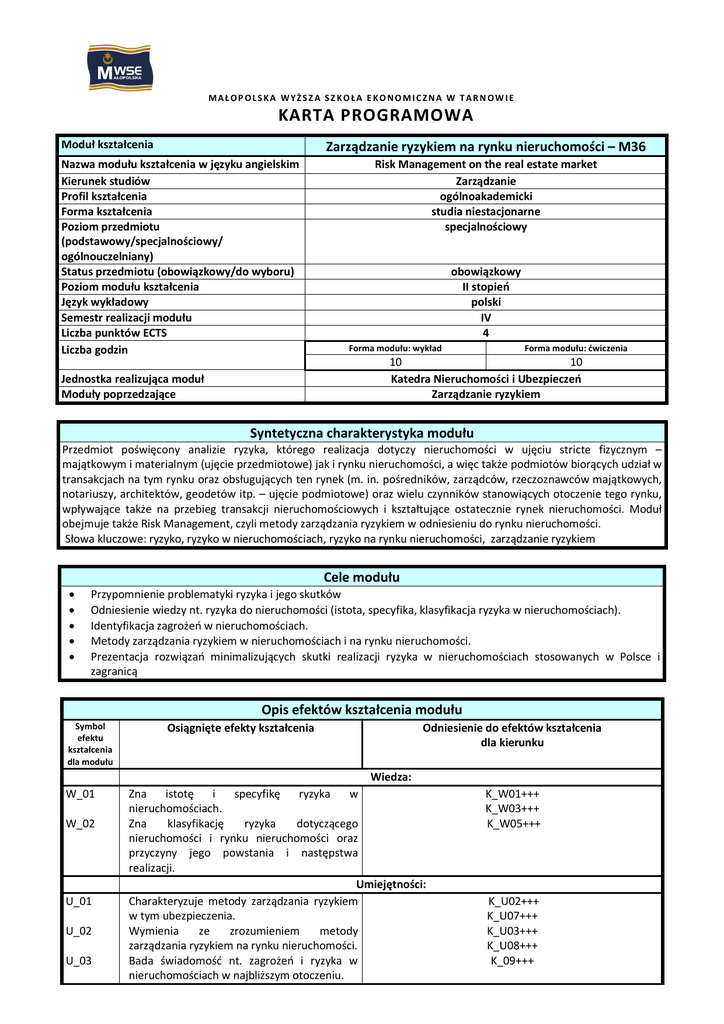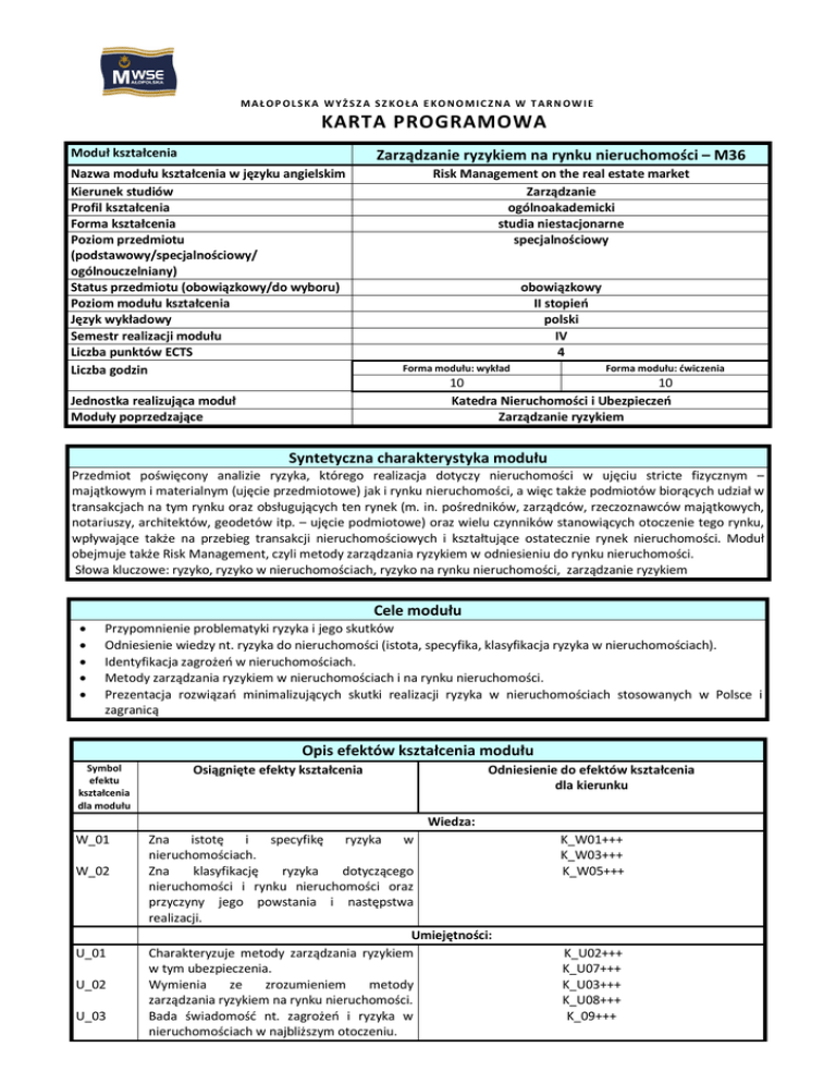 MAŁOP OLSKA WYŻSZ A SZ KOŁA E KONOMICZNA W TARN OW IE KARTA PROGRAMOWA Moduł kształcenia Zarządzanie ryzykiem na rynku nieruchomości – M36 Nazwa modułu kształcenia w języku angielskim Kierunek studiów Profil kształcenia Forma kształcenia Poziom przedmiotu (podstawowy/specjalnościowy/ ogólnouczelniany) Status przedmiotu (obowiązkowy/do wyboru) Poziom modułu kształcenia Język wykładowy Semestr realizacji modułu Liczba punktów ECTS Liczba godzin Risk Management on the real estate market Zarządzanie ogólnoakademicki studia niestacjonarne specjalnościowy obowiązkowy II stopień polski IV 4 Forma modułu: wykład Forma modułu: ćwiczenia 10 10 Katedra Nieruchomości i Ubezpieczeń Zarządzanie ryzykiem Jednostka realizująca moduł Moduły poprzedzające Syntetyczna charakterystyka modułu Przedmiot poświęcony analizie ryzyka, którego realizacja dotyczy nieruchomości w ujęciu stricte fizycznym – majątkowym i materialnym (ujęcie przedmiotowe) jak i rynku nieruchomości, a więc także podmiotów biorących udział w transakcjach na tym rynku oraz obsługujących ten rynek (m. in. pośredników, zarządców, rzeczoznawców majątkowych, notariuszy, architektów, geodetów itp. – ujęcie podmiotowe) oraz wielu czynników stanowiących otoczenie tego rynku, wpływające także na przebieg transakcji nieruchomościowych i kształtujące ostatecznie rynek nieruchomości. Moduł obejmuje także Risk Management, czyli metody zarządzania ryzykiem w odniesieniu do rynku nieruchomości. Słowa kluczowe: ryzyko, ryzyko w nieruchomościach, ryzyko na rynku nieruchomości, zarządzanie ryzykiem Cele modułu Przypomnienie problematyki ryzyka i jego skutków Odniesienie wiedzy nt. ryzyka do nieruchomości (istota, specyfika, klasyfikacja ryzyka w nieruchomościach). Identyfikacja zagrożeń w nieruchomościach. Metody zarządzania ryzykiem w nieruchomościach i na rynku nieruchomości. Prezentacja rozwiązań minimalizujących skutki realizacji ryzyka w nieruchomościach stosowanych w Polsce i zagranicą Opis efektów kształcenia modułu Symbol efektu kształcenia dla modułu Osiągnięte efekty kształcenia Odniesienie do efektów kształcenia dla kierunku Wiedza: W_01 W_02 U_01 U_02 U_03 Zna istotę i specyfikę ryzyka w nieruchomościach. Zna klasyfikację ryzyka dotyczącego nieruchomości i rynku nieruchomości oraz przyczyny jego powstania i następstwa realizacji. Umiejętności: Charakteryzuje metody zarządzania ryzykiem w tym ubezpieczenia. Wymienia ze zrozumieniem metody zarządzania ryzykiem na rynku nieruchomości. Bada świadomość nt. zagrożeń i ryzyka w nieruchomościach w najbliższym otoczeniu. K_W01+++ K_W03+++ K_W05+++ K_U02+++ K_U07+++ K_U03+++ K_U08+++ K_09+++ K_01 K_02 Kompetencje społeczne: Jest przygotowany do aktywnego udziału w opracowywaniu analiz ryzyka na rynku nieruchomości. Praktycznie podchodzi do analizy ryzyka na rynku nieruchomości bazując na faktach rzeczywistych tego rynku K_K05++ K_K06+ Treści kształcenia modułu Forma modułu: wykład 1. Ryzyko i jego elementy składowe 2. Istota i specyfika ryzyka w nieruchomościach. 3. Klasyfikacja ryzyka dotyczącego nieruchomości i rynku nieruchomości. 4. Zagrożenia i ryzyko w nieruchomościach 5. Straty i szkody w nieruchomościach będące następstwem ryzyka 6. Metody zarządzania ryzykiem na rynku nieruchomości (w tym ubezpieczenia stosowane na rynku nieruchomości). 7. Ryzyko katastroficzne jako specyficzne ryzyko zagrażające nieruchomościom (Programy i systemy ubezpieczeń katastroficznych w Polsce i na świecie) Literatura podstawowa Literatura uzupełniająca Forma modułu: ćwiczenia 1. Praktyczne aspekty zarządzania ryzykiem na rynku nieruchomości: - Projekt z elementami case study (praca studenta na zajęciach w grupach oraz indywidualna w domu): przygotowanie do przeprowadzenia przez studentów badań dotyczących świadomości nt. zagrożeń i ryzyka posiadaczy nieruchomości - prezentacja wyników badań M. Bac, Zarządzanie ryzykiem katastroficznym w nieruchomościach, Wydawnictwo TNOiK „Dom Organizatora”, Toruń 2009 rok (szczególnie rozdział 1 i 4) K. Jajuga, Zarządzanie ryzykiem, Wydawnictwo PWN, 2008 rok; T. T. Kaczmarek, Zarządzanie ryzykiem. Ujęcie interdyscyplinarne, Wydawnictwo Difin 2010 rok M. Bac, Świadomość ryzyka w nieruchomościach w świetle badań respondentów w województwie małopolskim, Rynek ubezpieczeń. Współczesne problemy, red. naukowa W. Sułkowska, Wydawnictwo Difin, Warszawa 2013, s. 105. M. Bac, Ryzyko katastroficzne jako przedmiot regulacji w ustawodawstwie polskim, Ubezpieczenia gospodarcze i społeczne. Wybrane zagadnienia ekonomiczne, red. naukowa W. Sułkowska, Wydawnictwo Wolters Kluwer Polska Sp. z o. o., Warszawa 2011, s. 13. M. Bac, Tradycja i innowacje w zarządzaniu ryzykiem powodziowym w Polsce, Zeszyt Naukowy MWSE w Tarnowie nr 2(19), s. 21-32, Wydawnictwo MWSE w Tarnowie, Tarnów 2011 rok; M. Bac, Ryzyka w budownictwie autostrady oraz przykłady zarządzania nimi poprzez ubezpieczenia, Zeszyt Naukowy MWSE w Tarnowie nr 2(13), s. 107-121, Wydawnictwo MWSE w Tarnowie, Tarnów 2009 rok; M. Bac, Świadomość ubezpieczeniowa posiadaczy nieruchomości w świetle badań ankietowych – cz. I, „Świat Nieruchomości”, Kraków 2009, nr 69, s. 4. M. Bac, Świadomość ubezpieczeniowa posiadaczy nieruchomości w świetle badań ankietowych – cz. II, „Świat Nieruchomości”, Kraków 2009, nr 70, s. 34. M. Bac, Zarządzanie ryzykiem katastroficznym w nieruchomościach, Zeszyt Naukowy MWSE w Tarnowie nr 1(11), s. 175-184, Wydawnictwo MWSE w Tarnowie, Tarnów 2008 rok; M. Bac, Identyfikacja ryzyk katastroficznych dla potrzeb sektora ubezpieczeń i reasekuracji, Zeszyt Naukowy MWSE w Tarnowie nr 1(10), s. 234-242, Wydawnictwo MWSE w Tarnowie, Tarnów 2007 rok; M. Bac, Programy i systemy ubezpieczeń katastroficznych na świecie , Zeszyt Naukowy MWSE w Tarnowie nr 1(9), s. 91-109, Wydawnictwo MWSE w Tarnowi