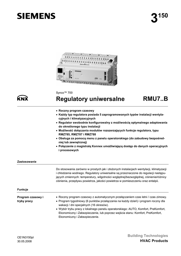 3 150 Synco™ 700 Regulatory uniwersalne RMU7..B • Roczny program czasowy • Każdy typ regulatora posiada 5 zaprogramowanych typów instalacji wentylacyjnych i klimatyzacyjnych • Regulator swobodnie konfigurowalny z możliwością optymalnego adaptowania do określonego typu instalacji • Możliwość dołączania modułów rozszerzających funkcje regulatora, typu RMZ785, RMZ787 i RMZ788 • Obsługa za pomocą menu z panelu operatorskiego (do zabudowy bezpośredniej lub zewnętrznej) • Połączenie z magistralą Konnex umożliwiającą dostęp do danych operacyjnych i procesowych Zastosowanie Do stosowania zarówno w prostych jak i złożonych instalacjach wentylacji, klimatyzacji i chłodzenia wodnego. Regulatory uniwersalne są przeznaczone do regulacji następujących zmiennych: temperatury, wilgotności względnej/bezwzględnej, ciśnienia/różnicy ciśnienia, przepływu powietrza, jakości powietrza w pomieszczeniu oraz entalpii. Funkcje Program czasowy i tryby pracy CE1N3150pl 30.05.2008 • Roczny program czasowy z automatycznym przełączaniem czas letni / czas zimowy. • Program tygodniowy (6 punktów przełączania na każdy dzień) i program roczny dla wakacji / dni specjalnych (16 okresów). • Wybór trybu pracy z lokalnego panelu operatorskiego: AUTO, Komfort, PreKomfort, Ekonomiczny i Zabezpieczenie, lub poprzez wejścia stanu: Komfort, PreKomfort, Ekonomiczny i Zabezpieczenie. Building Technologies HVAC Products • Łączenie poprzez magistralę Konnex regulatorów pomieszczeniowych z wieloma regulatorami instalacji wentylacji i grzewczych. Wymiana informacji takich, jak: temperatura pomieszczenia, tryb pracy i wartości zadane. • Wyświetlanie aktualnego trybu pracy (Komfort, PreKomfort, Ekonomiczny i Zabezpieczenie) wraz z powodem wybrania danego trybu. Wartości zadane • W zależności od regulatora sekwencyjnego: indywidualne ustawianie wartości zadanych ogrzewania i chłodzenia (lub maksymalnej i minimalnej wartości zadanej) dla trybów pracy Komfort i PreKomfort. • Wstępnie definiowana wartość zadana temperatury pomieszczenia ustawiana z zadajnika lub nastawnika względnej wartości zadanej (pasywnego). • W zależności od regulatora sekwencyjnego: wstępnie definiowana wartość zadana ustawiana ze zdalnego nastawnika bezwzględnej wartości zadanej (aktywnego lub pasywnego). • Wartość zadana temperatury pomieszczenia z kompensacją letnią i/lub zimową • W zależności od regulatora sekwencyjnego: przesunięcie wartości zadanej zgodnie z sygnałem z czujnika lub wybieranych punktów początku i końca. Wejścia uniwersalne 8 wejść uniwersalnych: • Pasywne lub aktywne sygnały analogowe następujących wielkości pomiarowych: °C, %, g/kg, kJ/kg, W/m2, bar, mbar, m/s, Pa, oraz ppm, uniwersalne 000.0, uniwersalne 0000, impuls • Cyfrowe sygnały wejściowe (styki bezpotencjałowe) Dodatkowe wejścia i wyjścia dostępne z modułami rozszerzeń Dodatkowe wejścia i wyjścia do rozszerzenia zakresu funkcji regulatora. Do jednego regulatora RMU7..B można podłączyć maksymalnie 4 moduły rozszerzeń. Opcje wyboru modułów rozszerzeń: • maks. 1 moduł uniwersalny RMZ785 (8 wejść uniwersalnych) • maks. 2 moduły uniwersalne RMZ787 (4 wejścia uniwersalne oraz 4 wyjścia przekaźnikowe) • maks. 2 moduły uniwersalne RMZ788 (4 wejścia uniwersalne, 2 wyjścia przekaźnikowe oraz 2 wyjścia analogowe) Gromadzenie danych Licznik impulsów (tylko dla funkcji wyświetlania, a nie dla funkcji rozliczania). Dwa liczniki wykorzystywane są do gromadzenia danych dotyczących zużycia mediów. Przetwarzanie impulsów generowanych przez liczniki gazu, ciepłej wody, ciepłej wody w systemie ogrzewania niskotemperaturowego, wody lodowej i energii elektrycznej. • Zliczanie impulsów (Wh, kWh, MWh, kJ, MJ, GJ, ml, l, m3, jednostek kosztów ogrzewania, angielskich jednostek ciepła (BTU) oraz impulsów bezmianowych. Wyświetlanie trendu Do rejestrowania zmierzonych wartości w zadanym okresie czasu służą dwa niezależne kanały. Oprócz stanów wejść urządzenia logicznego mogą być także rejestrowane: temperatura pomieszczenia i temperatura powietrza na zewnątrz odczytywane poprzez magistralę KNX. Funkcje regulacji • Regulator sekwencyjny dla 3 sekwencji ogrzewania (odwrotnego działania) i 2 sekwencji chłodzenia (bezpośredniego działania) może być używany jako regulator P, PI, PID lub regulator różnicowy. • Regulator może być skonfigurowany jako regulator kaskadowy temperatury pomieszczenia / powietrza nawiewnego z ograniczeniem temperatury powietrza nawiewnego. • Każda sekwencja może mieć przydzielone sterowanie ciągłe (wyjście modulujące, przełącznik krokowy, mieszająca przepustnica powietrza, urządzenia odzysku ciepła) oraz pompę. Maksymalnie trzy sekwencje mogą działać na to samo wyjście analogowe (np. priorytet chłodzenie / osuszanie). 2/18 Building Technologies HVAC Products Regulatory uniwersalne RMU710B, RMU720B, RMU730B CE1N3150pl 30.05.2008 • Funkcja globalnego ograniczenia minimum / maksimum z algorytmem PI dla każdego regulatora sekwencyjnego. Ograniczenie może być bezwzględne (np. temperatury lub wilgotności powietrza nawiewnego) lub względne (np. maksymalne ograniczenie różnicy temperatury pomieszczenia / powietrza nawiewnego). Ograniczenie działa na wszystkie sekwencje. Ograniczenie minimalne można ustawiać na poziomie dolnej wartości zadanej w warunkach włączonego chłodzenia (przykład: chłodzenie z chłodnicą z bezpośrednim odparowaniem). • Funkcja ograniczania wybranej sekwencji z algorytmem PI dla każdego regulatora sekwencyjnego. Możliwość definiowania ograniczenia minimum lub maksimum. Ograniczenie działa na pojedynczą sekwencję (np. ochrona przeciwoblodzeniowa wymiennika odzysku ciepła lub maksymalne ograniczenie temperatury powrotu nagrzewnicy powietrza). • Blokowanie pojedynczych sekwencji przez wartość temperatury powietrza na ze