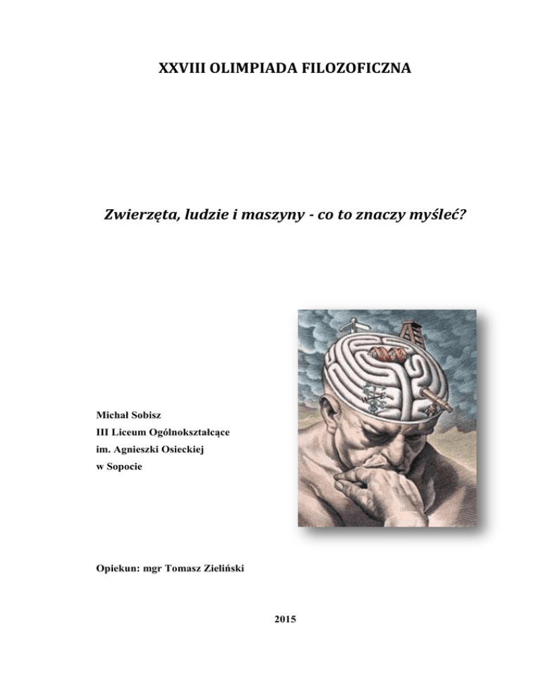 XXVIII OLIMPIADA FILOZOFICZNA Zwierzęta, ludzie i maszyny - co to znaczy myśleć? Michał Sobisz III Liceum Ogólnokształcące im. Agnieszki Osieckiej w Sopocie Opiekun: mgr Tomasz Zieliński 2015