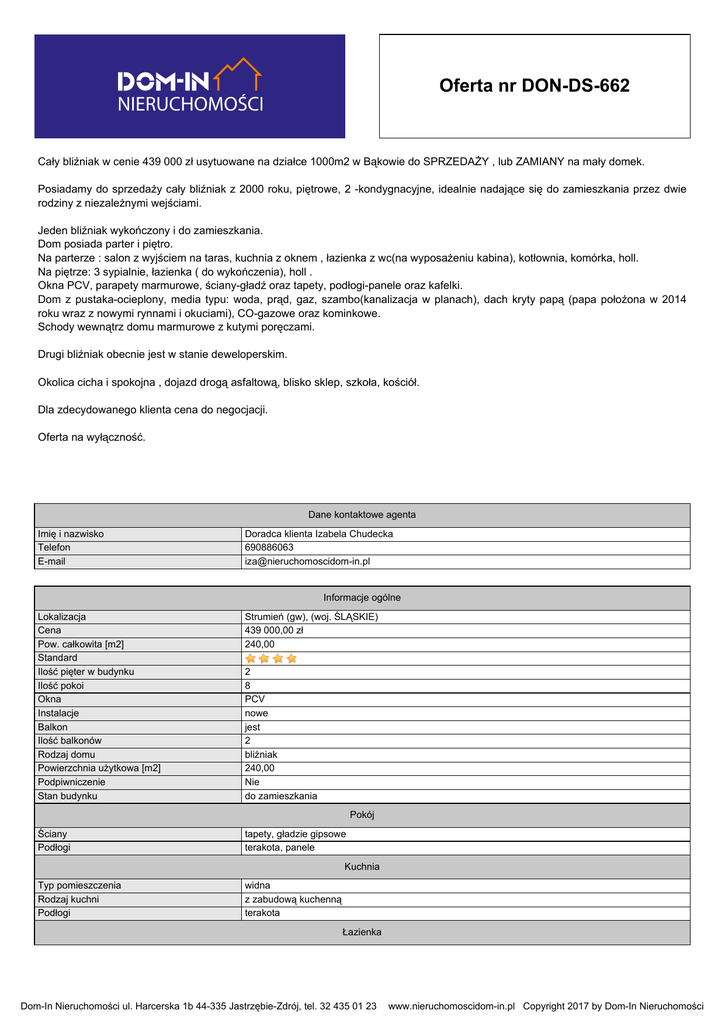 Oferta nr DON-DS-662 Cały bliźniak w cenie 439 000 zł usytuowane na działce 1000m2 w Bąkowie do SPRZEDAŻY , lub ZAMIANY na mały domek. Posiadamy do sprzedaży cały bliźniak z 2000 roku, piętrowe, 2 -kondygnacyjne, idealnie nadające się do zamieszkania przez dwie rodziny z niezależnymi wejściami. Jeden bliźniak wykończony i do zamieszkania. Dom posiada parter i piętro. Na parterze : salon z wyjściem na taras, kuchnia z oknem , łazienka z wc(na wyposażeniu kabina), kotłownia, komórka, holl. Na piętrze: 3 sypialnie, łazienka ( do wykończenia), holl . Okna PCV, parapety marmurowe, ściany-gładź oraz tapety, podłogi-panele oraz kafelki. Dom z pustaka-ocieplony, media typu: woda, prąd, gaz, szambo(kanalizacja w planach), dach kryty papą (papa położona w 2014 roku wraz z nowymi rynnami i okuciami), CO-gazowe oraz kominkowe. Schody wewnątrz domu marmurowe z kutymi poręczami. Drugi bliźniak obecnie jest w stanie deweloperskim. Okolica cicha i spokojna , dojazd drogą asfaltową, blisko sklep, szkoła, kościół. Dla zdecydowanego klienta cena do negocjacji. Oferta na wyłączność. Dane kontaktowe agenta Imię i nazwisko Telefon E-mail Doradca klienta Izabela Chudecka 690886063 [email protected] Informacje ogólne Lokalizacja Cena Pow. całkowita [m2] Standard Ilość pięter w budynku Ilość pokoi Okna Instalacje Balkon Ilość balkonów Rodzaj domu Powierzchnia użytkowa [m2] Podpiwniczenie Stan budynku Strumień (gw), (woj. ŚLĄSKIE) 439 000,00 zł 240,00 2 8 PCV nowe jest 2 bliźniak 240,00 Nie do zamieszkania Pokój Ściany Podłogi tapety, gładzie gipsowe terakota, panele Kuchnia Typ pomieszczenia Rodzaj kuchni Podłogi widna z zabudową kuchenną terakota Łazienka Dom-In Nieruchomości ul. Harcerska 1b 44-335 Jastrzębie-Zdrój, tel. 32 435 01 23 www.nieruchomoscidom-in.pl Copyright 2017 by Dom-In Nieruchomości Oferta nr DON-DS-662 Typ pomieszczenia Ilość Glazura Ściany Podłogi razem z wc 2 nowego typu glazura terakota Dom-In Nieruchomości ul. Harcerska 1b 44-335 Jastrzębie-Zdrój, tel. 32 435 01 23 www.nieruchomoscidom-in.pl Copyright 2017 by Dom-In Nieruchomości