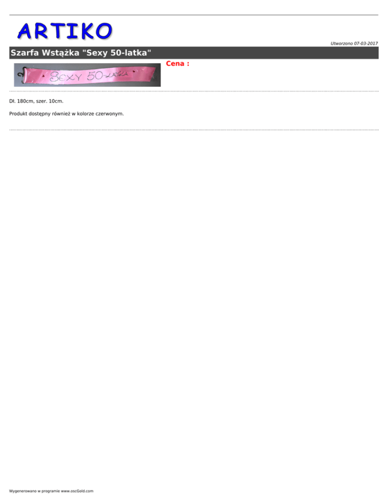 Utworzono 07-03-2017 Szarfa Wstążka "Sexy 50-latka" Cena : Dł. 180cm, szer. 10cm. Produkt dostępny również w kolorze czerwonym. Wygenerowano w programie www.oscGold.com