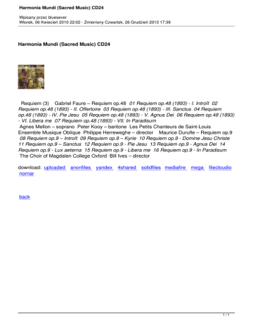 Harmonia Mundi (Sacred Music) CD24 Wpisany przez bluesever Wtorek, 06 Kwiecień 2010 22:02 - Zmieniony Czwartek, 26 Grudzień 2013 17:39 Harmonia Mundi (Sacred Music) CD24 Requiem (3) Gabriel Faure – Requiem op.48 01 Requiem op.48 (1893) - I. Introït 02 Requiem op.48 (1893) - II. Offertoire 03 Requiem op.48 (1893) - III. Sanctus 04 Requiem op.48 (1893) - IV. Pie Jesu 05 Requiem op.48 (1893) - V. Agnus Dei 06 Requiem op.48 (1893) - VI. Libera me 07 Requiem op.48 (1893) - VII. In Paradisum Agnes Mellon – soprano Peter Kooy – baritone Les Petits Chanteurs de Saint-Louis Ensemble Musique Oblique Philippe Herreweghe – director Maurice Durufle – Requiem op.9 08 Requiem op.9 – Introït 09 Requiem op.9 – Kyrie 10 Requiem op.9 - Domine Jesu Christe 11 Requiem op.9 – Sanctus 12 Requiem op.9 - Pie Jesu 13 Requiem op.9 - Agnus Dei 14 Requiem op.9 - Lux aeterna 15 Requiem op.9 - Libera me 16 Requiem op.9 - In Paradisum The Choir of Magdalen College Oxford Bill Ives – director download: uploaded nornar anonfiles yandex 4shared solidfiles mediafire mega filecloudio back 1/1