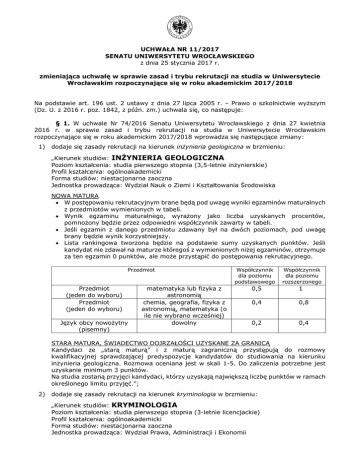 UCHWAŁA NR 11/2017 SENATU UNIWERSYTETU WROCŁAWSKIEGO z dnia 25 stycznia 2017 r. zmieniająca uchwałę w sprawie zasad i trybu rekrutacji na studia w Uniwersytecie Wrocławskim rozpoczynające się w roku akademickim 2017/2018 Na podstawie art. 196 ust. 2 ustawy z dnia 27 lipca 2005 r. – Prawo o szkolnictwie wyższym (Dz. U. z 2016 r. poz. 1842, z późn. zm.) uchwala się, co następuje: § 1. W uchwale Nr 74/2016 Senatu Uniwersytetu Wrocławskiego z dnia 27 kwietnia 2016 r. w sprawie zasad i trybu rekrutacji na studia w Uniwersytecie Wrocławskim rozpoczynające się w roku akademickim 2017/2018 wprowadza się następujące zmiany: 1) dodaje się zasady rekrutacji na kierunek inżynieria geologiczna w brzmieniu: „Kierunek studiów: INŻYNIERIA GEOLOGICZNA Poziom kształcenia: studia pierwszego stopnia (3,5-letnie inżynierskie) Profil kształcenia: ogólnoakademicki Forma studiów: niestacjonarna zaoczna Jednostka prowadząca: Wydział Nauk o Ziemi i Kształtowania Środowiska NOWA MATURA W postępowaniu rekrutacyjnym brane będą pod uwagę wyniki egzaminów maturalnych z przedmiotów wymienionych w tabeli. Wynik egzaminu maturalnego, wyrażony jako liczba uzyskanych procentów, pomnożony będzie przez odpowiedni współczynnik zawarty w tabeli. Jeśli egzamin z danego przedmiotu zdawany był na dwóch poziomach, pod uwagę brany będzie wynik korzystniejszy. Lista rankingowa tworzona będzie na podstawie sumy uzyskanych punktów. Jeśli kandydat nie zdawał na maturze któregoś z wymienionych niżej egzaminów, otrzymuje za ten egzamin 0 punktów, ale może przystąpić do postępowania rekrutacyjnego. Przedmiot Przedmiot (jeden do wyboru) Przedmiot (jeden do wyboru) Język obcy nowożytny (pisemny) matematyka lub fizyka z astronomią chemia, geografia, fizyka z astronomią, matematyka (o ile nie wybrano wcześniej) dowolny Współczynnik dla poziomu podstawowego Współczynnik dla poziomu rozszerzonego 0,5 1 0,4 0,8 0,2 0,4 STARA MATURA, ŚWIADECTWO DOJRZAŁOŚCI UZYSKANE ZA GRANICĄ Kandydaci ze „starą maturą” i z maturą zagraniczną przystępują do rozmowy kwalifikacyjnej sprawdzającej predyspozycje kandydatów do studiowania na kierunku inżynieria geologiczna. Rozmowa oceniana jest w skali 1-5. Do zaliczenia potrzebne jest uzyskanie minimum 3 punktów. Na studia zostaną przyjęci kandydaci, którzy uzyskają największą liczbę punktów w ramach określonego limitu przyjęć.”; 2) dodaje się zasady rekrutacji na kierunek kryminologia w brzmieniu: „Kierunek studiów: KRYMINOLOGIA Poziom kształcenia: studia pierwszego stopnia (3-letnie licencjackie) Profil kształcenia: ogólnoakademicki Forma studiów: niestacjonarna zaoczna Jednostka prowadząca: Wydział Prawa, Administracji i Ekonomii NOWA MATURA i STARA MATURA Przyjęcie na studia nastąpi na podstawie złożonych dokumentów. ŚWIADECTWO DOJRZAŁOŚCI UZYSKANE ZA GRANICĄ Przyjęcie nastąpi na podstawie złożonych dokumentów. Wymagana jest znajomość języka polskiego.”; 3) zmienia się zasady rekrutacji na kierunek pedagogika na zasady w brzmieniu: „Kierunek studiów: PEDAGOGIKA Poziom kształcenia: studia pierwszego stopnia (3-letnie licencjackie) Profil kształcenia: ogólnoakademicki Forma studiów: stacjonarna Jednostka prowadząca: Wydział Nauk Historycznych i Pedagogicznych NOWA MATURA W postępowaniu rekrutacyjnym brane będą pod uwagę wyniki egzaminów maturalnych z przedmiotów wymienionych w tabeli. Wynik egzaminu maturalnego, wyrażony jako liczba uzyskanych procentów, pomnożony będzie przez odpowiedni współczynnik zawarty w tabeli. Jeśli egzamin z danego przedmiotu zdawany był na dwóch poziomach, pod uwagę brany będzie wynik korzystniejszy. Lista rankingowa tworzona będzie na podstawie sumy uzyskanych punktów. Jeśli kandydat nie zdawał na maturze któregoś z wymienionych niżej egzaminów, otrzymuje za ten egzamin 0 punktów, ale może przystąpić do postępowania rekrutacyjnego. Przedmiot język polski (pisemny) Przedmiot historia, biologia, wiedza o (jeden do wyboru) społeczeństwie Język obcy nowożytny dowolny (pisemny) Współczynnik dla poziomu podstawowego Współczynnik dla poziomu rozszerzonego 0,5 0,5 1 1 0,2 0,4 STARA MATURA Kandydaci ze „starą maturą” przystępują do egzaminu. Szczegółowa forma egzaminu (egzamin ustny lub pisemny, rozmowa kwalifikacyjna, test) oraz zakres egzaminu zostanie podany kandydatom do wiadomości do dnia 31 stycznia 2017 r. na stronie internetowej Wydziału. ŚWIADECTWO DOJRZAŁOŚCI UZYSKANE ZA GRANICĄ Przyjęcie na studia nastąpi na podstawie złożonych dokumentów. Po II semestrze studenci wybierają jedną ze specjalności: edukacja dorosłych i marketing społeczny; organizacja edukacji i edukacja regionalna; pedagogika opiekuńcza z terapią; pedagogika wielokulturowa z interwencją socjalną; poradnictwo i pomoc psychopedagogiczna; resocjalizacja; edukacja wczesnoszkolna i przedszkolna. Uruchomienie specjalności nastąpi w przypadku wybrania jej przez minimum 20 studentów. W przypadku większej liczby kandydatów na daną specjalność (powyżej 30 osób) o przyjęciu decydować będą kryteria ustalone przez Instytut Pedagogiki. Studenci, którzy dokonują wyboru specjalności: edukacja wczesnoszkolna i przedszkolna przystępują do sprawdzianu praktycznego, kwalifikującego do podjęcia studiów na tej specjalności, z zakresu poprawności wymowy oraz poprawnej pisowni języka polskiego (kandydat powinien wykazać się poprawnością mowy pod względem artykulacji i płynności oraz umiejętnością pisania tekstu pod dyktando). Sprawdzian praktyczny oceniany będzie w skali 0-15. Za pozytywny przebieg sprawdzianu praktycznego uznaje się uzyskanie minimum 8 punktów. Niezaliczenie sprawdzianu praktycznego dyskwalifikuje kandydata. O zakwalifikowanie na specjalność nie mogą ubiegać się osoby z dysleksją. Kierunek studiów: PEDAGOGIKA Poziom kształcenia: studia pierwszego stopnia (3-letnie lic