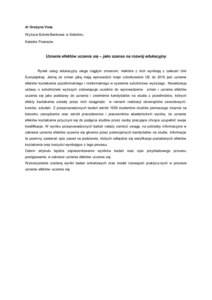 dr Grażyna Voss Wyższa Szkoła Bankowa w Gdańsku Katedra Finansów Uznanie efektów uczenia się – jako szansa na rozwój edukacyjny Rynek usług edukacyjny ulega ciągłym zmianom, niektóre z nich wynikają z zaleceń Unii Europejskiej. Jedną ze zmian jaką mają wprowadzić kraje członkowskie UE do 2015 jest uznanie efektów kształcenia pozaformalnego i nieformalnego w systemie szkolnictwa wyższego. Nowelizacja ustawy o szkolnictwie wyższym zobowiązuje uczelnie do wprowadzenie zmian i uznania efektów uczenia się jako podstawy do uznania i zwolnienie kandydatów na studia z przedmiotów, których efekty kształcenia zostały przez nich osiągnięte w ramach realizacji obowiązków zawodowych, kursów, szkoleń. Z przeprowadzonych badań wśród 1000 studentów studiów pierwszego stopnia na kierunku zarządzanie oraz wśród pracodawców i pracowników akademickich wynika, że uznanie efektów kształcenia przyczyni się do podjęcia studiów przez osoby pracujące chcące uzupełnić swoje kwalifikacje. W wyniku przeprowadzonych badań należy zwrócić uwagę, na potrzeby informacyjne w zakresie uznania efektów uczenia się głownie przez potencjalnych kandydatów na studia. Informacje te powinny zawierać opis zasad na podstawie, których odbędzie się weryfikacja posiadanych efektów kształcenia oraz korzyści wynikające z tego procesu. Celem artykułu będzie zaprezentowanie wyników badań oraz opis przykładowego procesu postępowania w zakresie uznania efektów uczenia się. Wykorzystanie zostaną wyniki badan ankietowych oraz model rozwiązań praktycz nych w procesie uznanie efektów uczenia się.