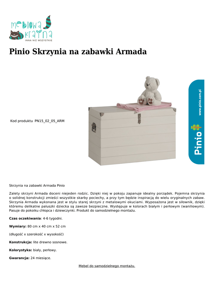Pinio Skrzynia na zabawki Armada Kod produktu PN15_02_05_ARM Skrzynia na zabawki Armada Pinio Zalety skrzyni Armada doceni niejeden rodzic. Dzięki niej w pokoju zapanuje idealny porządek. Pojemna skrzynia o solidnej konstrukcji zmieści wszystkie skarby pociechy, a przy tym będzie inspiracją do wielu oryginalnych zabaw. Skrzynia Armada wykonana jest w stylu starej skrzyni z metalowymi okuciami. Wyposażona jest w siłownik, dzięki któremu delikatne paluszki dziecka są zawsze bezpieczne. Występuje w kolorach białym i perłowym (waniliowym). Pasuje do pokoiku chłopca i dziewczynki. Produkt do samodzielnego montażu. Czas oczekiwania: 4-6 tygodni. Wymiary: 80 cm x 40 cm x 52 cm (długość x szerokość x wysokość) Konstrukcja: lite drewno sosnowe. Kolorystyka: biały, perłowy. Gwarancja: 24 miesiące. Mebel do samodzielnego montażu.