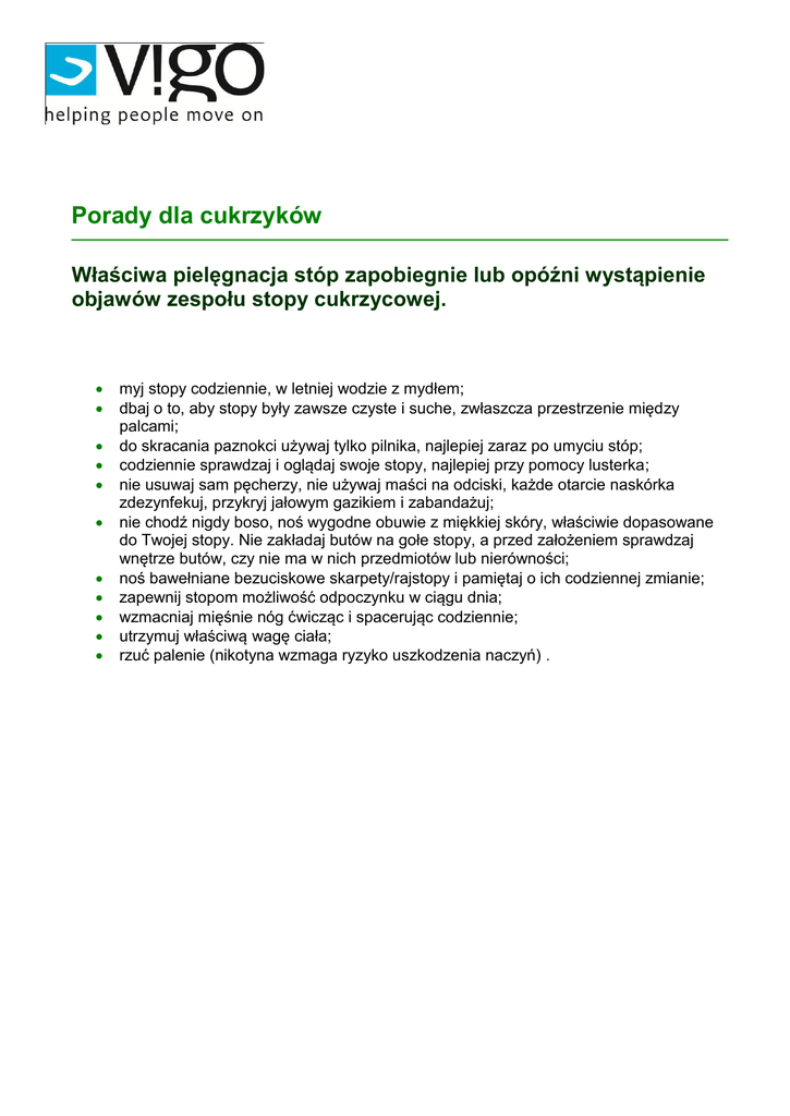Porady dla cukrzyków Właściwa pielęgnacja stóp zapobiegnie lub opóźni wystąpienie objawów zespołu stopy cukrzycowej. myj stopy codziennie, w letniej wodzie z mydłem; dbaj o to, aby stopy były zawsze czyste i suche, zwłaszcza przestrzenie między palcami; do skracania paznokci używaj tylko pilnika, najlepiej zaraz po umyciu stóp; codziennie sprawdzaj i oglądaj swoje stopy, najlepiej przy pomocy lusterka; nie usuwaj sam pęcherzy, nie używaj maści na odciski, każde otarcie naskórka zdezynfekuj, przykryj jałowym gazikiem i zabandażuj; nie chodź nigdy boso, noś wygodne obuwie z miękkiej skóry, właściwie dopasowane do Twojej stopy. Nie zakładaj butów na gołe stopy, a przed założeniem sprawdzaj wnętrze butów, czy nie ma w nich przedmiotów lub nierówności; noś bawełniane bezuciskowe skarpety/rajstopy i pamiętaj o ich codziennej zmianie; zapewnij stopom możliwość odpoczynku w ciągu dnia; wzmacniaj mięśnie nóg ćwicząc i spacerując codziennie; utrzymuj właściwą wagę ciała; rzuć palenie (nikotyna wzmaga ryzyko uszkodzenia naczyń) .