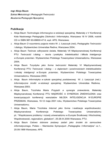 mgr Alicja Baum Zakład Metodologii i Pedagogiki Twórczości Akademia Pedagogiki Specjalnej Publikacje 1. Alicja Baum Technologia informacyjna w edukacji specjalnej, Materiały z V Konferencji Koła Naukowego Pedagogika Zdolności i Informatyka, Warszawa 18 IV 2008, nośnik CD nr ISBN 987-83-89600-47-9, wyd. APS, Warszawa; 2. Alicja Baum O rozumieniu pojęcia mistrz W: J. Łaszczyk (red), Pedagogika Twórczości i dialogu, Wydawnictwo Universitas Rediva, Warszawa 2004; 3. Alicja Baum Twórcze odkrywanie świata, Materiały VII Międzynarodowej Konferencji PTU Twórczość i dialog – teoria i praktyka. Intelektualiści i Młoda Inteligencja w Europie przemian. Wydawnictwo Polskiego Towarzystwa Uniwersalizmu, Warszawa 2004; 4. Alicja Baum Turystyka jako forma twórczości Materiały VI Międzynarodowej Konferencji PTU Twórczość i dialog – o dążeniach i powinnościach intelektualistów i młodej inteligencji w Europie przemian, Wydawnictwo Polskiego Towarzystwa Uniwersalizmu, Warszawa 2003; 5. Alicja Baum Informatyka w szkole specjalnej podstawowej W: J. Łaszczyk (red.) Informatyczne środki w edukacji specjalnej, Wydawnictwo Universitas Rediviva, Warszawa 2003; 6. Alicja Baum, Trzcińska Maria Przyjaźń a synergia zniewolenia, Materiały Międzynarodowej Konferencji PTU MĄDROŚĆ A SYNERGIA ZNIEWOLENIA oraz towarzyszących konferencji warsztatów MŁODA INTELIGENCJA W EUROPIE PRZEMIAN, Warszawa, 10-12 maja 2001 roku, Wydawnictwo Polskiego Towarzystwa Uniwersalizmu; 7. Alicja Baum, Maria Trzcińska Internet jako forma i realizacja wspólnotowości, Międzynarodowa Konferencja Polskiego Towarzystwa Uniwersalizmu pt.: “Współczesne problemy i rozwój uniwersalizmu w Europie Środkowej i Wschodniej. Wspólnotowość, regionalizm, globalizm”, 25-28.IX.2000 Warszawa, PTU. 8. Alicja Baum Celowo dobrane zestawy zadań jako środek do samouctwa informatycznego, Polsko – Niemieckie Sympozjum „Pedagogika i Informatyka” cz.1., 20.09.1999 Warszawa, APS.