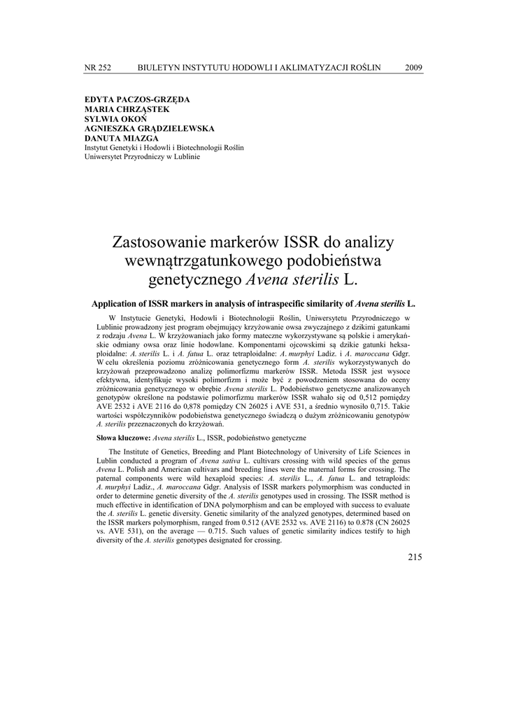 NR 252 BIULETYN INSTYTUTU HODOWLI I AKLIMATYZACJI ROŚLIN 2009 EDYTA PACZOS-GRZĘDA MARIA CHRZĄSTEK SYLWIA OKOŃ AGNIESZKA GRĄDZIELEWSKA DANUTA MIAZGA Instytut Genetyki i Hodowli i Biotechnologii Roślin Uniwersytet Przyrodniczy w Lublinie Zastosowanie markerów ISSR do analizy wewnątrzgatunkowego podobieństwa genetycznego Avena sterilis L. Application of ISSR markers in analysis of intraspecific similarity of Avena sterilis L. W Instytucie Genetyki, Hodowli i Biotechnologii Roślin, Uniwersytetu Przyrodniczego w Lublinie prowadzony jest program obejmujący krzyżowanie owsa zwyczajnego z dzikimi gatunkami z rodzaju Avena L. W krzyżowaniach jako formy mateczne wykorzystywane są polskie i amerykańskie odmiany owsa oraz linie hodowlane. Komponentami ojcowskimi są dzikie gatunki heksaploidalne: A. sterilis L. i A. fatua L. oraz tetraploidalne: A. murphyi Ladiz. i A. maroccana Gdgr. W celu określenia poziomu zróżnicowania genetycznego form A. sterilis wykorzystywanych do krzyżowań przeprowadzono analizę polimorfizmu markerów ISSR. Metoda ISSR jest wysoce efektywna, identyfikuje wysoki polimorfizm i może być z powodzeniem stosowana do oceny zróżnicowania genetycznego w obrębie Avena sterilis L. Podobieństwo genetyczne analizowanych genotypów określone na podstawie polimorfizmu markerów ISSR wahało się od 0,512 pomiędzy AVE 2532 i AVE 2116 do 0,878 pomiędzy CN 26025 i AVE 531, a średnio wynosiło 0,715. Takie wartości współczynników podobieństwa genetycznego świadczą o dużym zróżnicowaniu genotypów A. sterilis przeznaczonych do krzyżowań. Słowa kluczowe: Avena sterilis L., ISSR, podobieństwo genetyczne The Institute of Genetics, Breeding and Plant Biotechnology of University of Life Sciences in Lublin conducted a program of Avena sativa L. cultivars crossing with wild species of the genus Avena L. Polish and American cultivars and breeding lines were the maternal forms for crossing. The paternal components were wild hexaploid species: A. sterilis L., A. fatua L. and tetraploids: A. murphyi Ladiz., A. maroccana Gdgr. Analysis of ISSR markers polymorphism was conducted in order to determine genetic diversity of the A. sterilis genotypes used in crossing. The ISSR method is much effective in identification of DNA polymorphism and can be employed with success to evaluate the A. sterilis L. genetic diversity. Genetic similarity of the analyzed genotypes, determined based on the ISSR markers polymorphism, ranged from 0.512 (AVE 2532 vs. AVE 2116) to 0.878 (CN 26025 vs. AVE 531), on the average — 0.715. Such values of genetic similarity indices testify to high diversity of the A. sterilis genotypes designated for crossing. 215 Edyta Paczos-Grzęda ... Key words: Avena sterilis L., genetic similarity, ISSR WSTĘP W Instytucie Genetyki, Hodowli i Biotechnologii Roślin Uniwersytetu Przyrodniczego w Lublinie od kilku lat prowadzony jest program obejmujący krzyżowanie owsa zwyczajnego z dzikimi gatunkami z rodzaju Avena L. (Chrząstek i in., 2006). W krzyżowaniach jako formy mateczne wykorzystywane są polskie i amerykańskie odmiany owsa oraz linie hodowlane pochodzące z HR Strzelce oraz Danko w Choryni. Komponentami ojcowskimi są dzikie gatunki heksaploidalne: A. sterilis L. i A. fatua L. oraz tetraploidalne: A. murphyi Ladiz. i A. maroccana Gdgr. Dzikie gatunki owsa charakteryzuje nie tylko bogactwo genów odporności, ale i ogromna zmienność cech morfologicznych, fizjologicznych, biochemicznych i rolniczych. Z uwagi na duże podobieństwo genetyczne do A. sativa, gatunek A. sterilis uważany jest za przodka form uprawnych (Zhou i in., 1999) oraz jedno z najłatwiej dostępnych źródeł zmienności (Frey, 1986; Chrząstek i in., 2004). Jednocześnie A. sterilis stanowi dużą rezerwę różnorodności genetycznej dla owsa zwyczajnego, dlatego wykorzystywany jest w programach hodowlanych jako źródło genów warunkujących odporność na mączniaka (Frey, 1986), rdzę koronową i źdźbłową (Martens i in., 1980), nicienie (Rivoal i Cook, 1993) czy herbicydy (Somody i in., 1984). A. sterilis może być również dawcą genów warunkujących wysoką zawartość białka (Takeda i Frey, 1977) i tłuszczu (Thro i Frey, 1985) w ziarnie, a także odpowiedzialnych za wysoki potencjał plonowania (Takeda i Frey, 1977). Genotypy Avena sterilis pochodzące ze światowych kolekcji były zaledwie kilkakrotnie obiektem analiz molekularnych. Goffreda i wsp. (1992) oceniali polimorfizm długości fragmentów restrykcyjnych w 173 próbach A. sterilis pochodzących z 9 krajów Afryki i południowo-wschodniej Azji. Phillips i wsp. (1993) określili podobieństwo genetyczne 1005 genotypów A. sterilis z kolekcji US NSGC (United States National Small Grain Collection) na podstawie zróżnicowania izoenzymów dla 23 systemów enzymatycznych. Heun i wsp. (1994) za pomocą markerów RAPD i izoenzymów analizowali zróżnicowanie 24 form A. sterilis pochodzących z kolekcji US NSGC. Zohu i wsp. (1999) wykorzystując metodę RAPD ocenili podobieństwo genotypów A. sterilis o zróżnicowanym pochodzeniu oraz udział A. sterilis w ewolucji gatunków uprawnych. Fu i wsp. (2007) podjęli próbę oceny zróżnicowania genetycznego 369 form A. sterilis z kolekcji PGRC (Plant Gene Resources of Canada) pochodzących z 26 krajów za pomocą systemu SSR. ISSR (Inter Simple Sequence Repeats) jest metodą opartą na PCR, a amplifikacji podlegają fragmenty DNA pomiędzy powtórzeniami mikrosatelitarnymi położonymi w odległości nie większej niż ok. 2000pz (Ziętkiewicz i in., 1994). Metoda ta, z uwagi na wysokie temperatury przyłączania starterów, jest wysoce powtarzalna. Ponadto markery ISSR, podobnie jak sekwencje mikrosatelitarne, z którymi sąsiadują są równomiernie rozłożone w genomie (Predeep-Reddy i in., 2002). Metodę ISSR wykorzystano kilkakrotnie do analizy gatunków z rodzaju Avena. De Souza i wsp. (2005) użyli tej 216 Edyta Paczos-Grzęda ... metody do osz