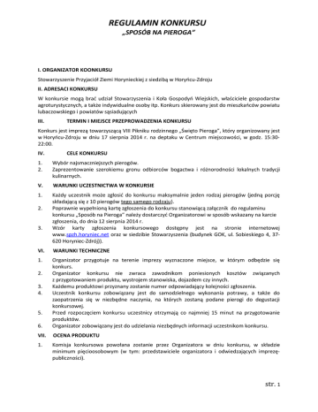 REGULAMIN KONKURSU „SPOSÓB NA PIEROGA” I. ORGANIZATOR KOONKURSU Stowarzyszenie Przyjaciół Ziemi Horynieckiej z siedzibą w Horyńcu-Zdroju II. ADRESACI KONKURSU W konkursie mogą brać udział Stowarzyszenia i Koła Gospodyń Wiejskich, właściciele gospodarstw agroturystycznych, a także indywidualne osoby itp. Konkurs skierowany jest do mieszkańców powiatu lubaczowskiego i powiatów sąsiadujących III. TERMIN I MIEJSCE PRZEPROWADZENIA KONKURSU Konkurs jest imprezą towarzyszącą VIII Pikniku rodzinnego „Święto Pieroga”, który organizowany jest w Horyńcu-Zdroju w dniu 17 sierpnia 2014 r. na deptaku w Centrum miejscowości, w godz. 15:3022:00. IV. CELE KONKURSU 1. 2. Wybór najsmaczniejszych pierogów. Zaprezentowanie szerokiemu gronu odbiorców bogactwa i różnorodności lokalnych tradycji kulinarnych. V. WARUNKI UCZESTNICTWA W KONKURSIE 1. Każdy uczestnik może zgłosić do konkursu maksymalnie jeden rodzaj pierogów (jedną porcję składającą się z 10 pierogów tego samego rodzaju). Poprawnie wypełnioną kartę zgłoszenia do konkursu stanowiącą załącznik do regulaminu konkursu „Sposób na Pieroga” należy dostarczyć Organizatorowi w sposób wskazany na karcie zgłoszenia, do dnia 12 sierpnia 2014 r. Wzór karty zgłoszenia konkursowego dostępny jest na stronie internetowej www.spzh.horyniec.net oraz w siedzibie Stowarzyszenia (budynek GOK, ul. Sobieskiego 4, 37620 Horyniec-Zdrój)). 2. 3. VI. WARUNKI TECHNICZNE 1. 6. Organizator przygotuje na terenie imprezy wyznaczone miejsce, w którym odbędzie się konkurs. Organizator konkursu nie zwraca zawodnikom poniesionych kosztów związanych z przygotowaniem produktu, wystrojem stanowiska, dojazdem czy innych. Każdemu produktowi przyznany zostanie numer odpowiadający kolejności zgłoszenia. Uczestnik konkursu zobowiązany jest do samodzielnego wykonania potrawy, a także do zaopatrzenia się w niezbędne naczynia, na których zostaną podane pierogi do degustacji konkursowej. Przed rozpoczęciem konkursu uczestnicy otrzymają co najmniej 15 minut na przygotowanie produktów. Organizator zobowiązany jest do udzielania niezbędnych informacji uczestnikom konkursu. VII. OCENA PRODUKTU 1. Komisja konkursowa powołana zostanie przez Organizatora w dniu konkursu, w składzie minimum pięcioosobowym (w tym: przedstawiciele organizatora i odwiedzających imprezępubliczności). 2. 3. 4. 5. str. 1 REGULAMIN KONKURSU „SPOSÓB NA PIEROGA” 2. 3. 4. 5. 6. Każdy członek komisji zobowiązany jest do degustacji każdego spośród wystawionych w konkursie produktów. Zgłoszone pierogi oceniane będą łącznie w trzech kategoriach: − sposób zaprezentowania produktu (wygląd, przystrojenie), − smak, − oryginalność i pomysłowość. W każdej kategorii produkt może zdobyć od 1 do 5 punktów (łącznie maksymalnie 15 punktów). Werdykt komisji konkursowej jest ostateczny i niepodważalny. Uczestnik konkursu ma obowiązek odpowiedzi na pytania zadawane przez członków komisji konkursowej dotyczące prezentowanego produktu. VIII. PRZEBIEG I CZAS TRWANIA KONKURSU 1. 2. 3. 4. 5. IX. Konkurs odbędzie się 17 sierpnia 2014 roku (niedziela). Konkurs rozpocznie się o godzinie 15.45 degustacją dostarczonych na stoisko konkursowe produktów przez komisję konkursową. Czas trwania konkursu zależny jest od liczby zgłoszonych produktów. Organizator przewiduje o godz. 17 :00 ogłoszenie wyników, wręczenie uczestnikom nagród i dyplomów. Podane godziny mogą ulec zmianie, o czym uczestnicy zostaną niezwłocznie poinformowani. Uczestnik zobowiązany jest dostarczyć do konkursu gotowe danie do degustacji komisji konkursowej. NAGRODY Przewiduje się przyznanie nagród rzeczowych za trzy miejsca (I-III). Każdy uczestnik konkursu otrzyma dyplom uczestnictwa. X. INFORMACJE DODATKOWE 1. Organizator konkursu zastrzega sobie prawo do publikacji, a także przekazywanie mediom następujących informacji: imiona i nazwiska laureatów / uczestników, nazwy produktów, przepisy i zdjęcia uczestników i produktów, a także listy uczestników. 2. Laureaci konkursu (imię i nazwisko) wraz z nazwami zwycięskich potraw zostaną opublikowane na stronie internetowej spzh.horyniec.net oraz w Gazecie Horynieckiej” 3. Wszelkie pytania należy kierować do: − Krzysztof Woźny tel. 506 128 979, [email protected] 4. Zgłoszenie produktu do konkursu jest jednoznaczne z zaakceptowaniem regulaminu. Horyniec-Zdrój, 04.08.2014r. Organizator Konkursu str. 2