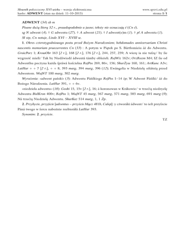 Słownik polszczyzny XVI wieku - wersja elektroniczna hasło: ADWENT (stan na dzień: 11-10-2015) www.spxvi.edu.pl strona 1/1 ADWENT (54) sb m Pisane dużą literą 52 r., prawdopodobnie a jasne; teksty nie oznaczają é (Cn é). sg N adwent (4). ◊ G adwentu (27). ◊ A adwent (21). ◊ I adwent(e)m (1). ◊ pl A adwenta (1). Sł stp, Cn notuje, Linde XVI – XVIII w. 1. Okres czterotygodniowego postu przed Bożym Narodzeniem; hebdomades anniversariam Christi nascentis memoriam praecurrentes Cn (53) : A potym w Piątek po S. Bártłomieiu áż do Adwentu. GroicPorz 1; KrowObr 163 [2 r.], 168 [2 r.], 176 [2 r.], 244, 257, 259; A wierę ia nie tuſzę/ by ſie wygrześć mieli/ Tak by Niedźwiedź ádwentá támby obleżeli. RejWiz 162v; OrzRozm M4; IZ ſie od Adwenthu pocżyna każda ſpráwá koſcielna RejPos 269, 86v, 156; SkarŻyw 160, 161; ArtKanc A3v; LatHar + + 7 [2 r.], + + 8, 393 marg, 394 marg, 396 (12); Ewángelia w Niedzielę oſtátnią przed Adwentem. WujNT 100 marg, 302 marg. Wyrażenia: »adwent pański« (3): Adwentu Páńſkiego RejPos 1‒14 żp; W Adwent Páńſki/ áż do Bożego Národzenia. LatHar 391, + + 6v. »niedziela adwentu« (18): Goski 15, 15v [2 r.], 16; á koronowan w Krákowie/ w trzećią niedzyelę Adwentu BielKron 400v; RejPos 1; WujNT 45 marg, 567 marg, 571 marg, 585 marg, 691 marg (9); Ná trzećią Niedzielę Adwentu. SkarKaz 514 marg, 1, 1 Żp. 2. Przybycie, przyjście [adventus ‒ przyście Mącz 481b, Calep]: y cżworáki ádwent/ to ieſt przyſzcie Páná twego w ſercu nabożnie rozbieráłá LatHar 393. Synonim: 2. przyście. TZ