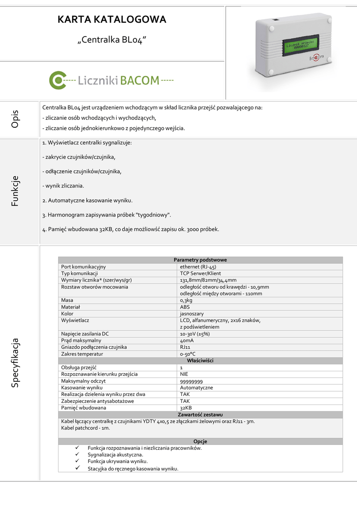 KARTA KATALOGOWA Opis „Centralka BL04” Centralka BL04 jest urządzeniem wchodzącym w skład licznika przejść pozwalającego na: - zliczanie osób wchodzących i wychodzących, - zliczanie osób jednokierunkowo z pojedynczego wejścia. 1. Wyświetlacz centralki sygnalizuje: - zakrycie czujników/czujnika, Funkcje - odłączenie czujników/czujnika, - wynik zliczania. 2. Automatyczne kasowanie wyniku. 3. Harmonogram zapisywania próbek "tygodniowy". 4. Pamięć wbudowana 32KB, co daje możliowść zapisu ok. 3000 próbek. Parametry podstwowe ethernet (RJ-45) TCP Serwer/Klient 131,8mm/82mm/34,4mm odległość otworu od krawędzi - 10,9mm odległość między otworami - 110mm Masa 0,3kg Materiał ABS Kolor jasnoszary Wyświetlacz LCD, alfanumeryczny, 2x16 znaków, z podświetleniem Napięcie zasilania DC 10-30V (±5%) Prąd maksymalny 40mA Gniazdo podłączenia czujnika RJ11 Zakres temperatur 0-50°C Właściwiści Obsługa przejść 1 Rozpoznawanie kierunku przejścia NIE Maksymalny odczyt 99999999 Kasowanie wyniku Automatyczne Realizacja dzielenia wyniku przez dwa TAK Zabezpieczenie antysabotażowe TAK Pamięć wbudowana 32KB Zawartość zestawu Kabel łączący centralkę z czujnikami YDTY 4x0,5 ze złączkami żelowymi oraz RJ11 - 3m. Kabel patchcord - 1m. Specyfikacja Port komunikacyjny Typ komunikacji Wymiary licznika* (szer/wys/gr) Rozstaw otworów mocowania Opcje Funkcja rozpoznawania i niezliczania pracowników. Sygnalizacja akustyczna. Funkcja ukrywania wyniku. Stacyjka do ręcznego kasowania wyniku. Wymiary licznika Elementy kompatybilne Zasilacz: AC/DC-CL Czujniki: poziome CH1 poziome CH2 pionowe CV1 pionowe CV2 Akcesoria czujników: CA1 CA2 CA3 CAS1 CAS2 CAB1 CAB2 Oprogramowanie: SZOB LITE SZOB LITE Mobile SZOB PRO Producent: Bacom Bartosz Wesołowski 41-200 Sosnowiec, ul. Kołłątaja 6a tel.:32 445 35 75 e-mail: [email protected] www.bacom.pl Uwaga! Ten symbol na produkcie lub jego opakowaniu oznacza, że produktu nie wolno wyrzucać do zwykłych pojemników na odpady. Obowiązkiem użytkownika jest przekazanie zużytego sprzętu do wyznaczonego punktu zbiórki w celu recyklingu odpadów powstałych ze sprzętu elektrycznego i elektronicznego. Osobna zbiórka oraz recykling zużytego sprzętu pomogą w ochronie zasobów naturalnych i zapewnią ponowne wprowadzenie go do obiegu w sposób chroniący zdrowie człowieka i środowisko. Aby uzyskać więcej informacji o tym, gdzie można przekazać zużyty sprzęt do recyklingu, należy się skontaktować z urzędem miasta, zakładem gospodarki odpadami lub sklepem, w którym zakupiono produkt DEKLARACJA ZGODNOŚCI NR 4/2010 Producent: Adres: Bacom Bartosz Wesołowski, ul. H. Kołłątaja 6a, 41-200 Sosnowiec Producent deklaruje z pełną odpowiedzialnością, że wyrób: Licznik przejść BL04 jest zgodny z wymaganiami kompatybilności elektromagnetycznej zawartymi w postanowieniach dyrektywy: EMC 2004/108/WE Do oceny zgodności zastosowano normy zharmonizowane: PN-EN 55022:2006+A1:2008 PN-EN 55024:2000+A1:2004+A2:2004+IS1:2007 Katowice, 1.06.2010r. mgr inż. Bartosz Wesołowski Właściciel Zakazuje się umieszczania zużytego sprzętu łącznie z innymi opadami. Zużyty sprzęt elektryczny i elektroniczny należy przekazać do wyspecjalizowanego punktu zbiórki lub do producenta (Ustawa z dnia 29 lipca 2005 o zużytym sprzęcie elektrycznym i elektronicznym). Zgodnie z wymaganiami Ustawy z dnia 29-07-2005 o zużytym sprzęcie elektrycznym i elektronicznym firma Bacom Bartosz Wesołowski została zarejestrowana przez Głównego Inspektora Ochrony Środowiska i otrzymała numer rejestrowy: E0012712WZ.